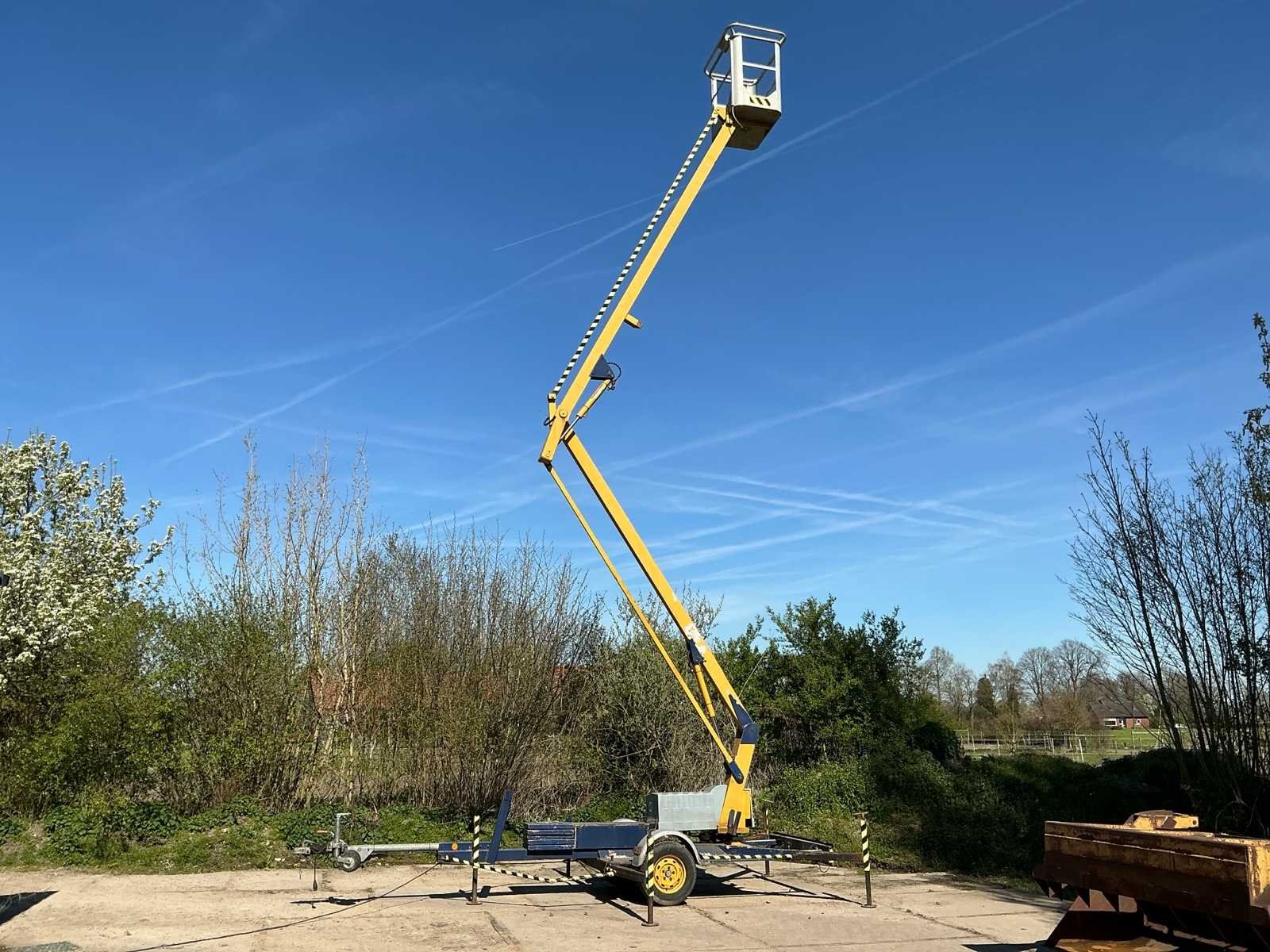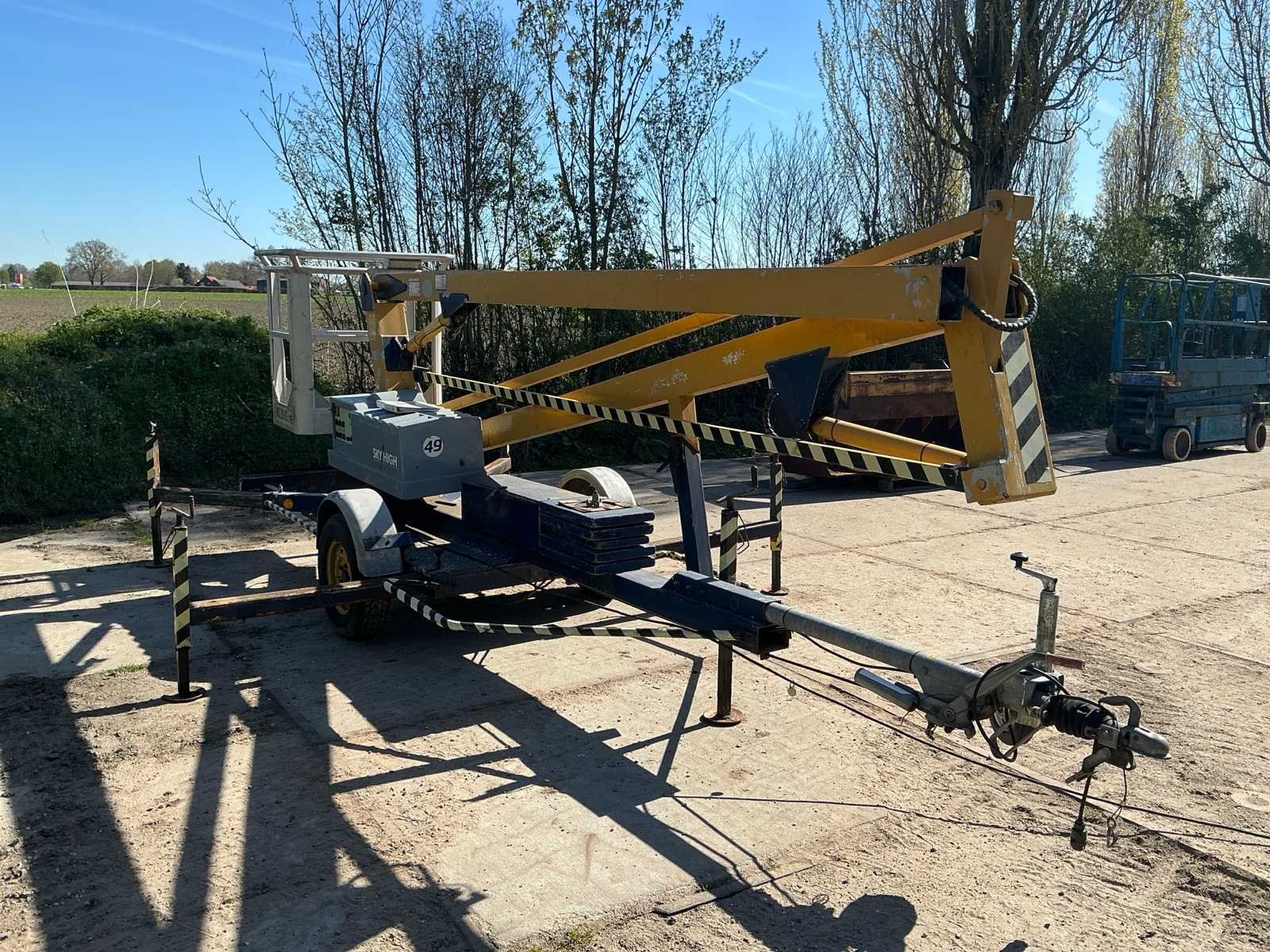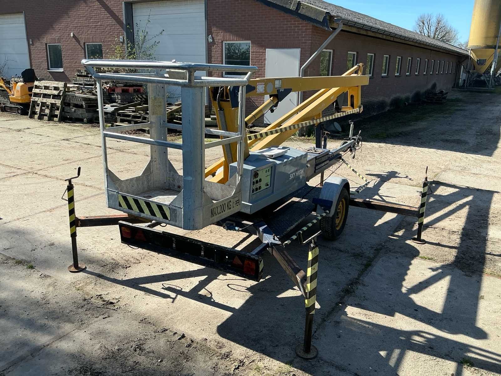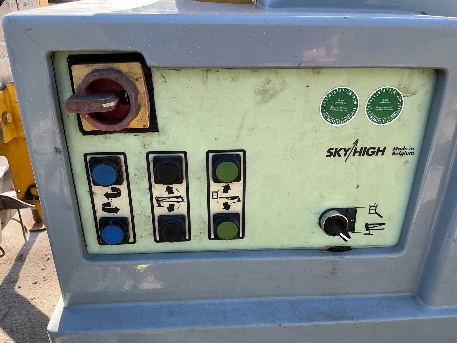 Voorzien van: type: 1200, bouwjaar: 1993, werkhoogte: ca. 12,20 meter, max. zijdelings bereik: ca. 4,50 meter, max. korfbelasting: 215 kg (geschikt voor 2 personen + gereedschap), eigen gewicht: ca. 1.120 kg, afmetingen werkbak: 1,10 x 0,65 meter, aandrijving: elektrisch 220V, voorzien van 4 mechanisch uitschuifbare stempelpoten voor snelle en veilige opstelling, 7 polige stekker, geen kenteken, stempelplaten. Merk: Sky High Type: 1200 Bouwjaar: 1993 Serienummer: AHC316 Elektrisch: true Knikarm hoogwerker: true Werkhoogte: 12000mm Horizontale rijkwijdte: 4500mm Plateau afm. l: 1100mm Plateau afm. b: 650mm Platform capaciteit: 215kg Accu lader: true Eigen gewicht: 1120kg Totale afmeting L: 5200mm Totale afmeting Breedte: 1400mm Totale afmeting Hoogte: 2000mm