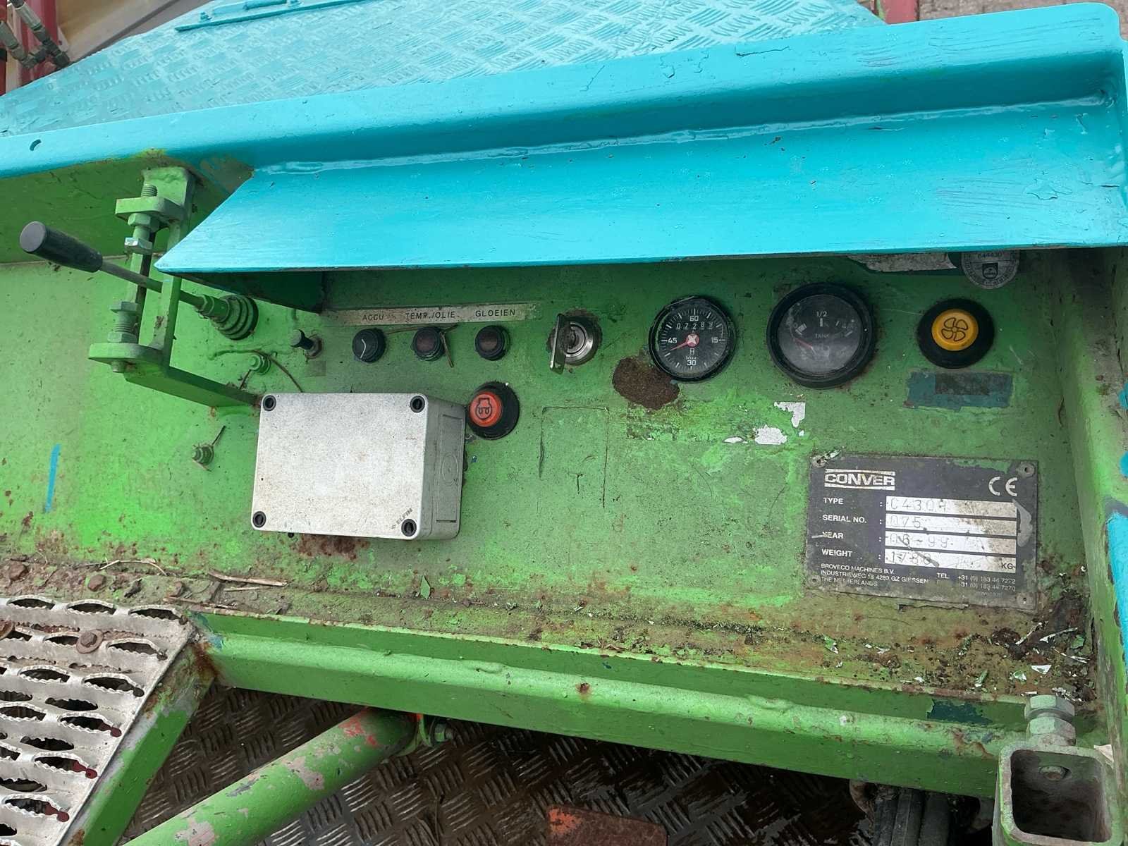 Conver C430H Maaiboot Voorzien van knipbalk 120cm breed met vrij nieuwe messen Mitsubishi S4L2 motor Servo bediend Casco werkbreedte 1500cm - rekken uitklapbaar 2x 50cm - totale werkbreedte 250cm Vijzel in hoogte verstelbaar (hydraulisch aangedreven) Merk: Conver Type: C430H Bouwjaar: 1999 Serienummer: 075 Werkbreedte: 2500mm Type motor: Mitsubishi Aantal cilinders: 4 Brandstof: Diesel Motorvermogen (kW): 35.5kW Afgelezen urenstand: 7289hr Totale afmeting L: 5000mm Totale afmeting Breedte: 1500mm Totale afmeting Hoogte: 2200mm Eigen gewicht: 1780kg
