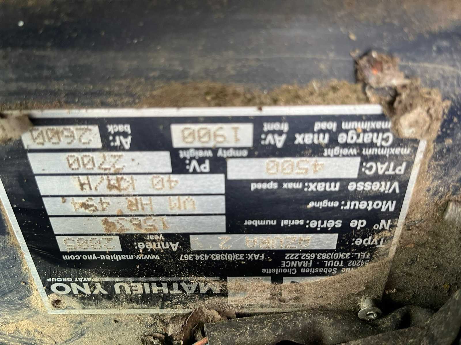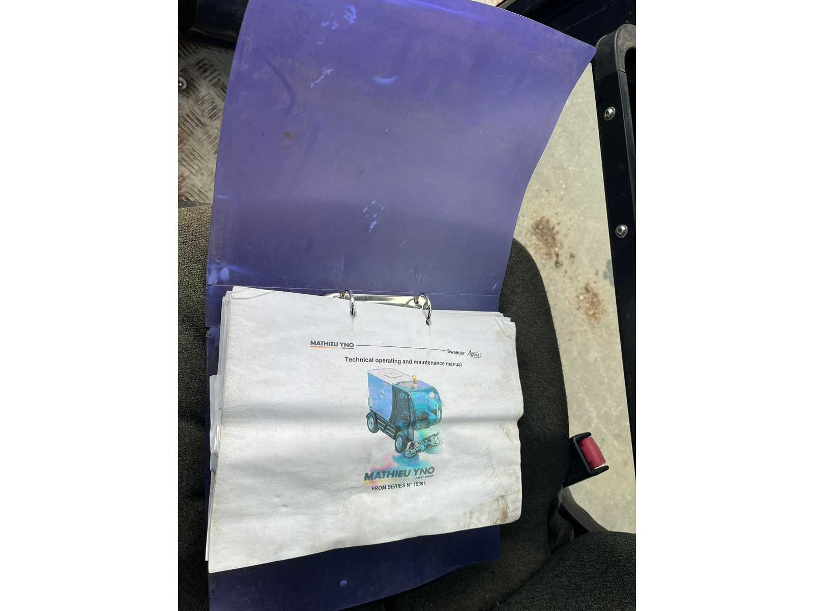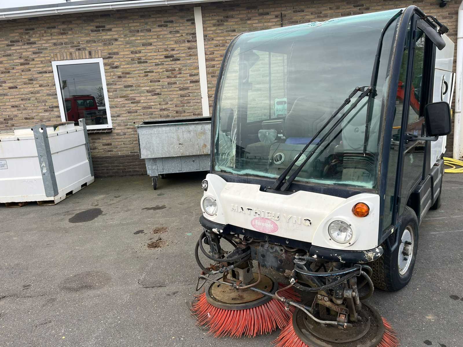 Let op; werking onbekend, startmotor defect, Beweegbare borstels voor, afzuig installatie midden, waterreservoir, kipper, hydrostaat, Merk: Mathieu Yno Type: Azura 2 Bouwjaar: 2005 Serienummer: 15634 Werkbreedte: 1500mm Afgelezen urenstand: 1702hr Eigen gewicht: 2700kg Totale afmeting L: 4000mm Totale afmeting Breedte: 1250mm Totale afmeting Hoogte: 2000mm