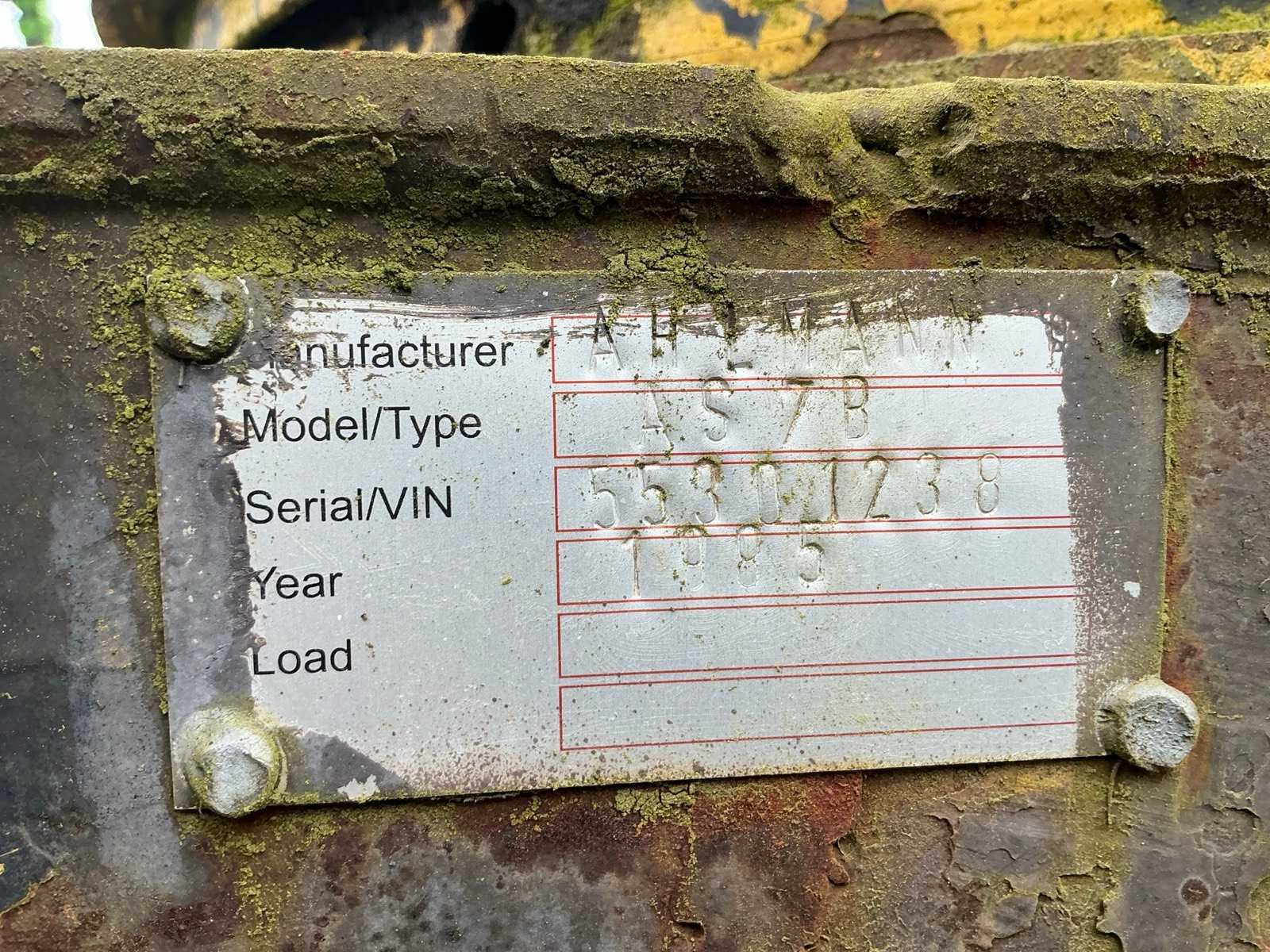 Let op; rijdt langzaam, 4WD, asstabilisatie, puinbak 2300mm, vaste pen, 3e+4e functie, zwenkbare mast, contra gewicht achter, trekoog met pin 28mm, Merk: Ahlmann Type: AS7B Bouwjaar: 1985 Serienummer: 55301238 Merk motor: Deutz Motorvermogen (kW): 59kW Aantal cilinders: 4 Brandstof: Diesel Bedrijfsgewicht: 7200kg Graafbak afm. b: 2300mm Bandenmaat: 18 R22.5 Cabine: true Afgelezen urenstand: 12617 Eigen gewicht: 7200kg Totale afmeting L: 5800mm Totale afmeting Breedte: 2300mm Totale afmeting Hoogte: 2850mm