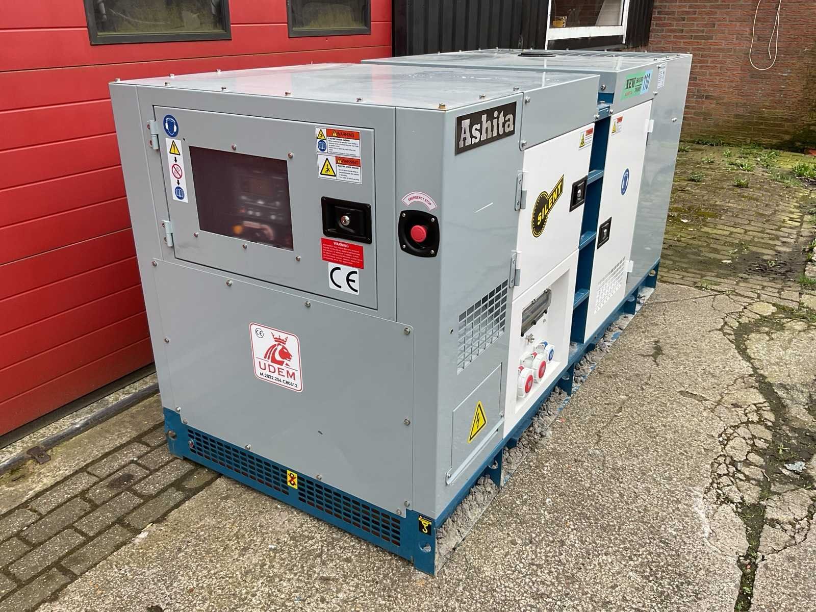 Voorzien van silent diesel generator; Generator vermogen: 110 kVA; Power factor: 0.8; Effectief vermogen: 88 kW; Spanning: 400 V / 230 V; Frequentie: 50 Hz; Fasen: 3-fase; Nominale snelheid: 1500 rpm; Motormodel: 4RT55-88D; Type: turbocharged dieselmotor; Aantal cilinders: 4; Cilinderinhoud: 5.3 L; Vermogen motor: 88 kW @ 1500 rpm; Lengte: 260 cm; Breedte: 110 cm; Hoogte: 131 cm; Gewicht: 2000 kg; 2× 400V CEE krachtstroom aansluitingen; 1× 230V CEE aansluiting; Automatische zekeringen (CHINT); Hoofdschakelaar / breaker; Silent canopy (geluidsarm); Digitale genset controller; Noodstop; Circuit breakers; Geluidsisolatiekast; Hefpunten / vorkheftruck openingen Merk: Ashita power Type: AG3-110 Diesel: true
