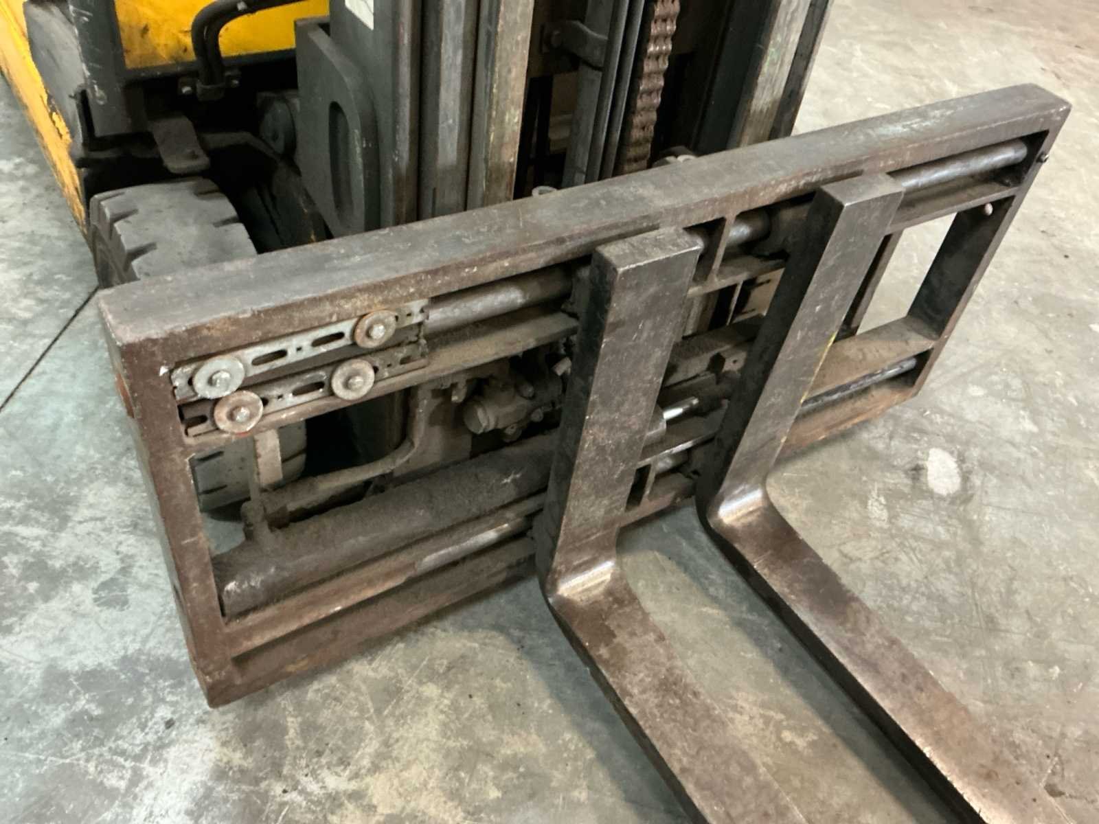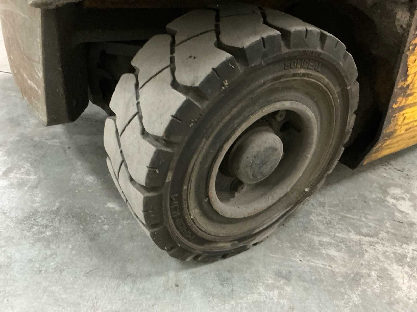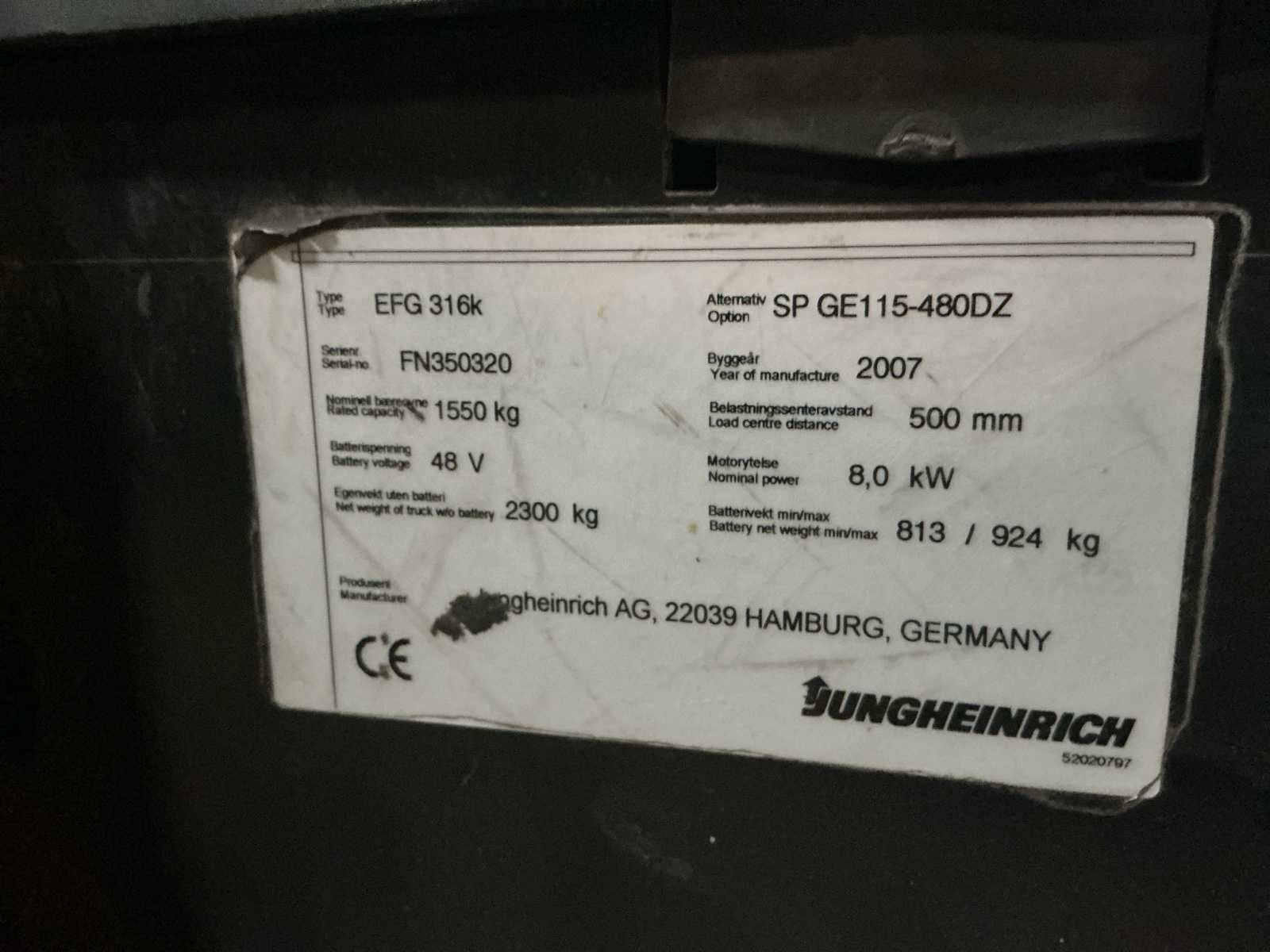 Voorzien van: werkverlichting, metalen kooi, claxon, urenstand niet achterhaald Merk: Jungheinrich Type: EFG316K Bouwjaar: 2007 Serienummer: FN350320 Mast: Triple Soort band: Volrubber Aantal wielen: 4 Free-lift: true Side-shift: true Triple mast: true Eigen gewicht: 2300kg Hefvermogen: 1550kg Lepellengte: 1030mm Vol rubber banden: true Minimale doorrijhoogte: 2100mm Totale afmeting L: 3150mm Totale afmeting Breedte: 1200mm Totale afmeting Hoogte: 2100mm
