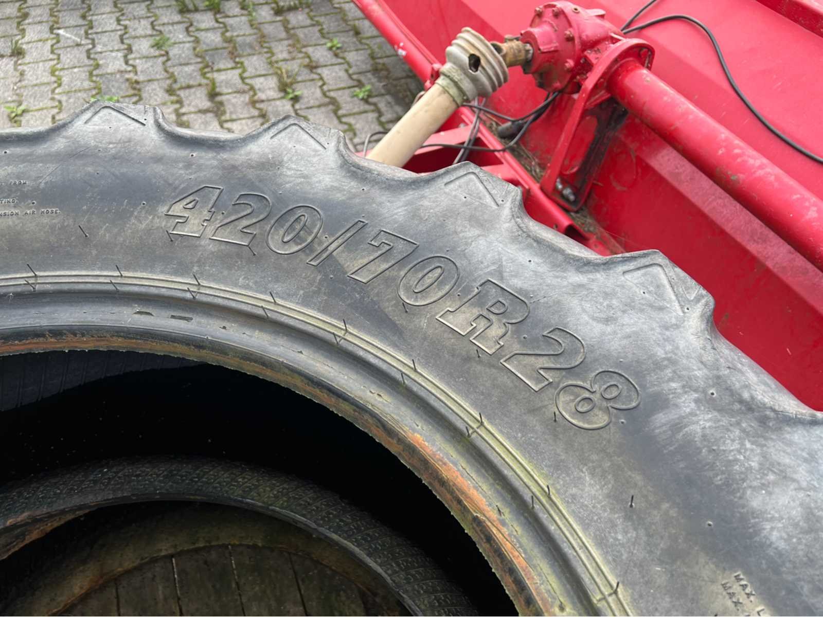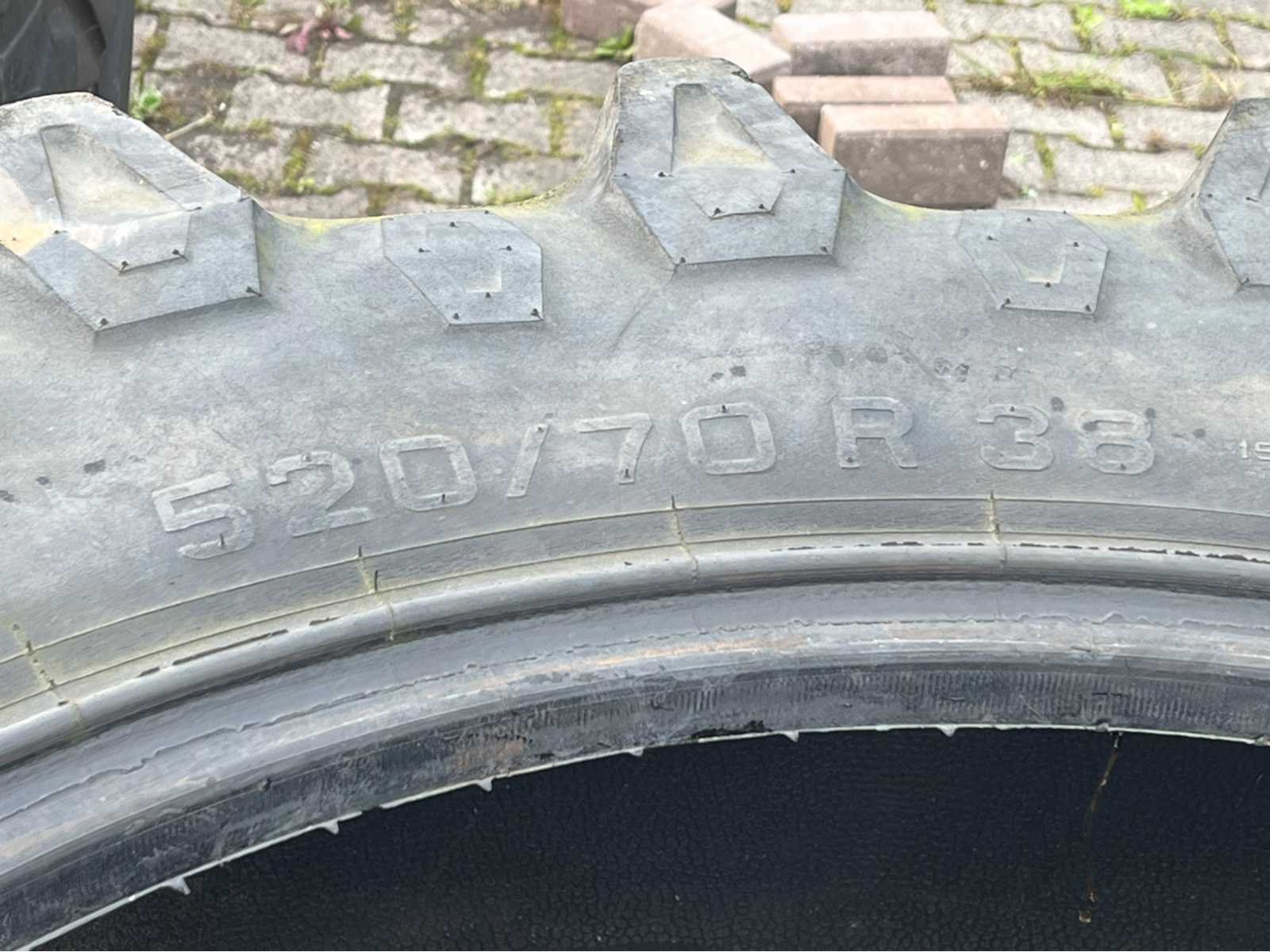Set banden, afkomstig van Massey-ferguson 3095, voorbanden 2x 420/70 R28, 2x achterbanden 520/70 R28. Merk: Pirelli - BKT Type: voor en achterbanden Bandenmaat: 520/70 R38 / 420/70 R28