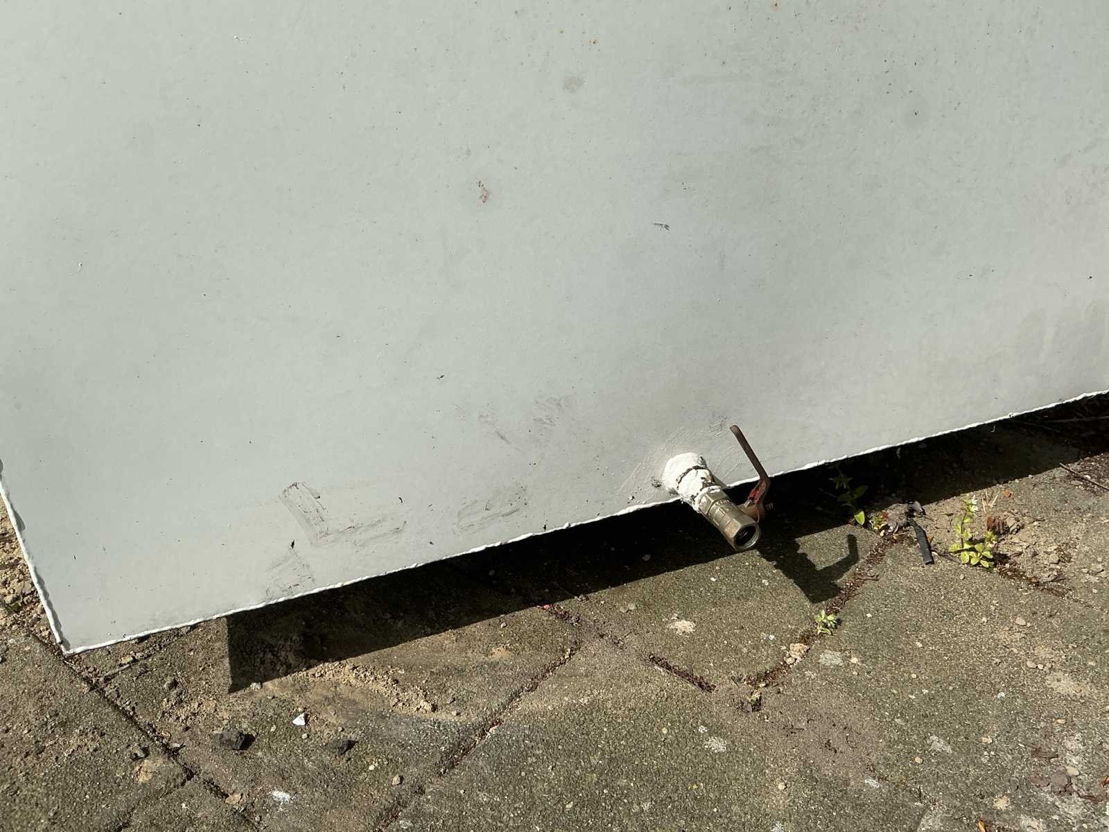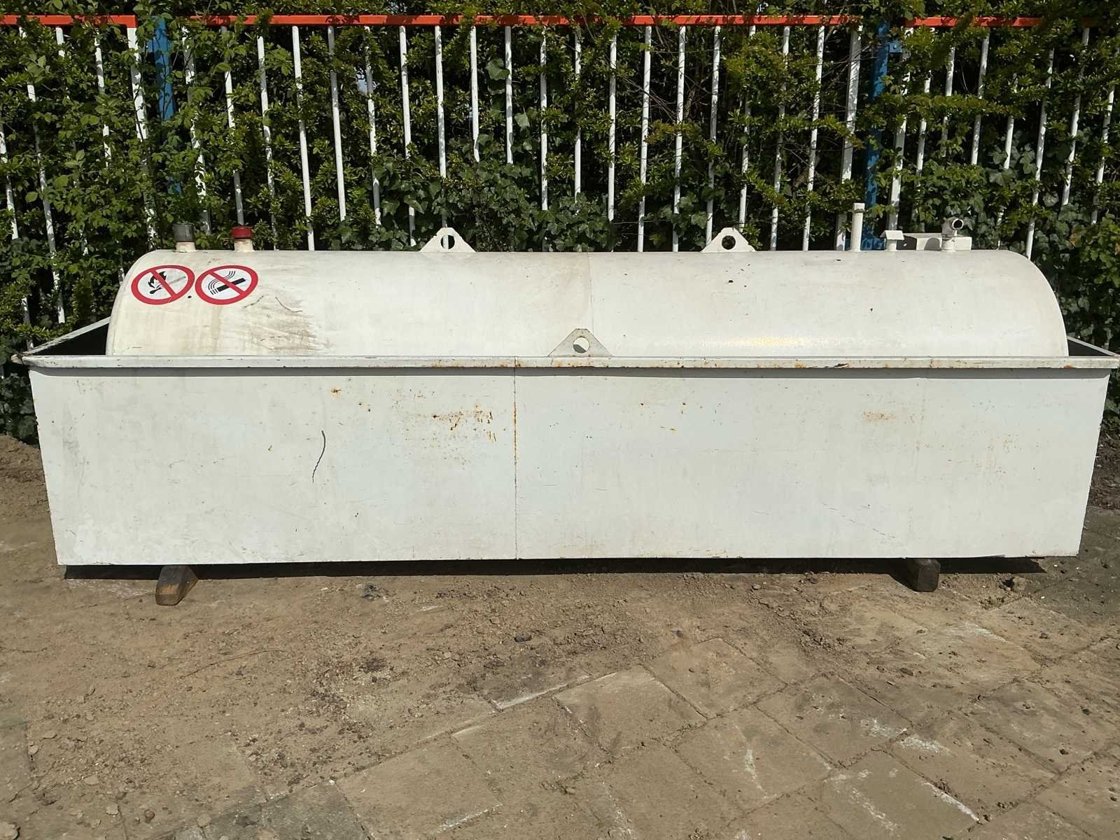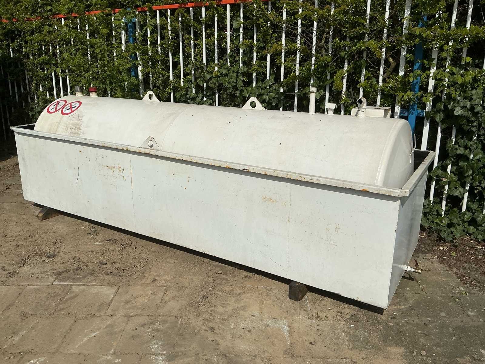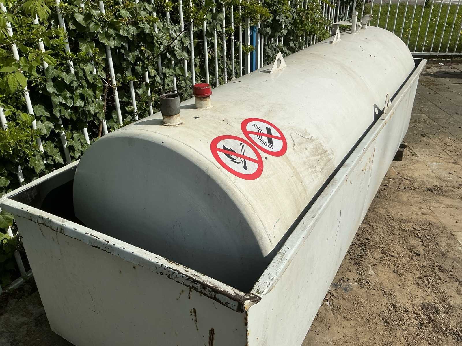 Stalen opslagtank in stalen lekbak. Tankinhoud circa 2250 liter. Staal: true Totale afmeting L: 1100mm Totale afmeting Breedte: 3500mm Totale afmeting Hoogte: 1200mm