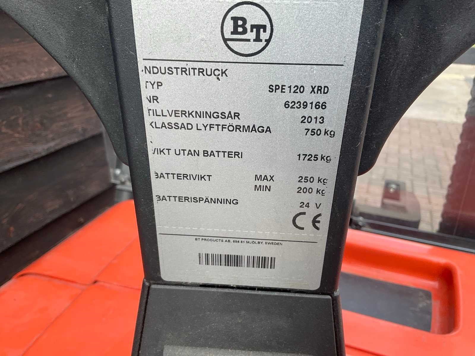 Merk: Bt staxio Type: Spe 120 xrd Bouwjaar: 2013 Hefvermogen: 1200kg Hefhoogte: 2400mm Lepellengte: 1200mm Eigen gewicht: 1725kg Minimale doorrijhoogte: 1850mm Totale afmeting L: 1900mm Totale afmeting Breedte: 1000mm Totale afmeting Hoogte: 1850mm Meerij stapelaar: true Accu lader: true Leveringsvoorwaarden: Geladen op vrachtwagen