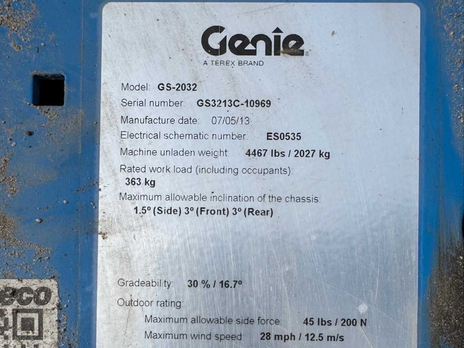 Merk: Genie Type: GS-2032 Bouwjaar: 2013 Serienummer: GS3213C-10969 Elektrisch: true Motorvermogen (kW): 3kW Schaarhoogwerker: true Werkhoogte: 8130mm Plateau afm. l: 2270mm Plateau afm. b: 840mm Platform capaciteit: 363kg Eigen gewicht: 1832kg Totale afmeting L: 2440mm Totale afmeting Breedte: 820mm Totale afmeting Hoogte: 1800mm