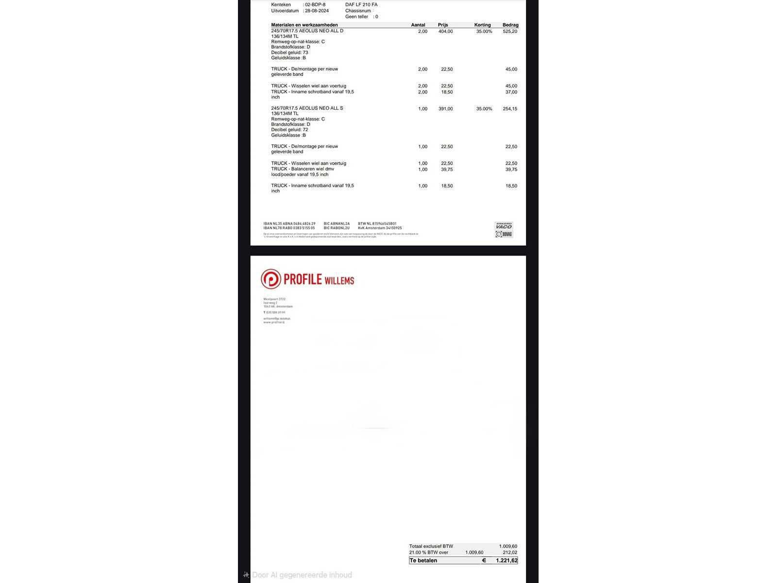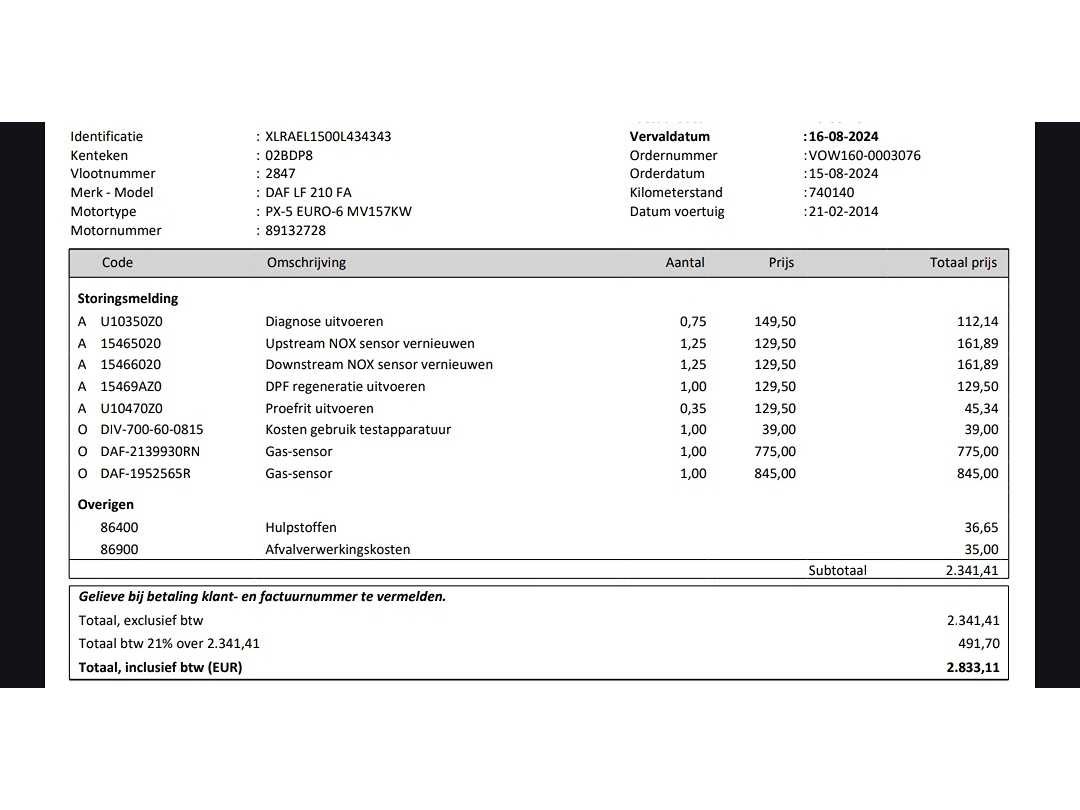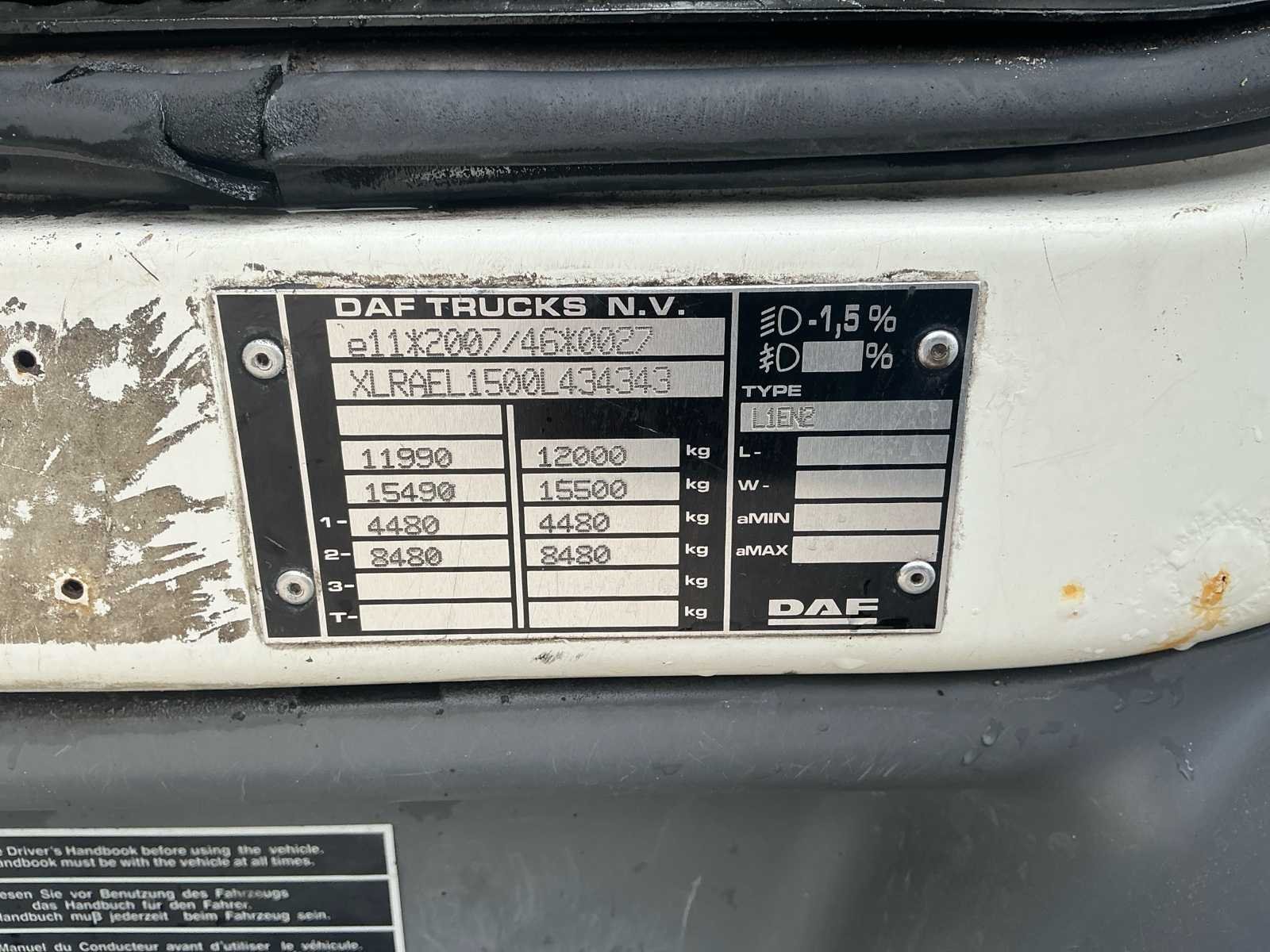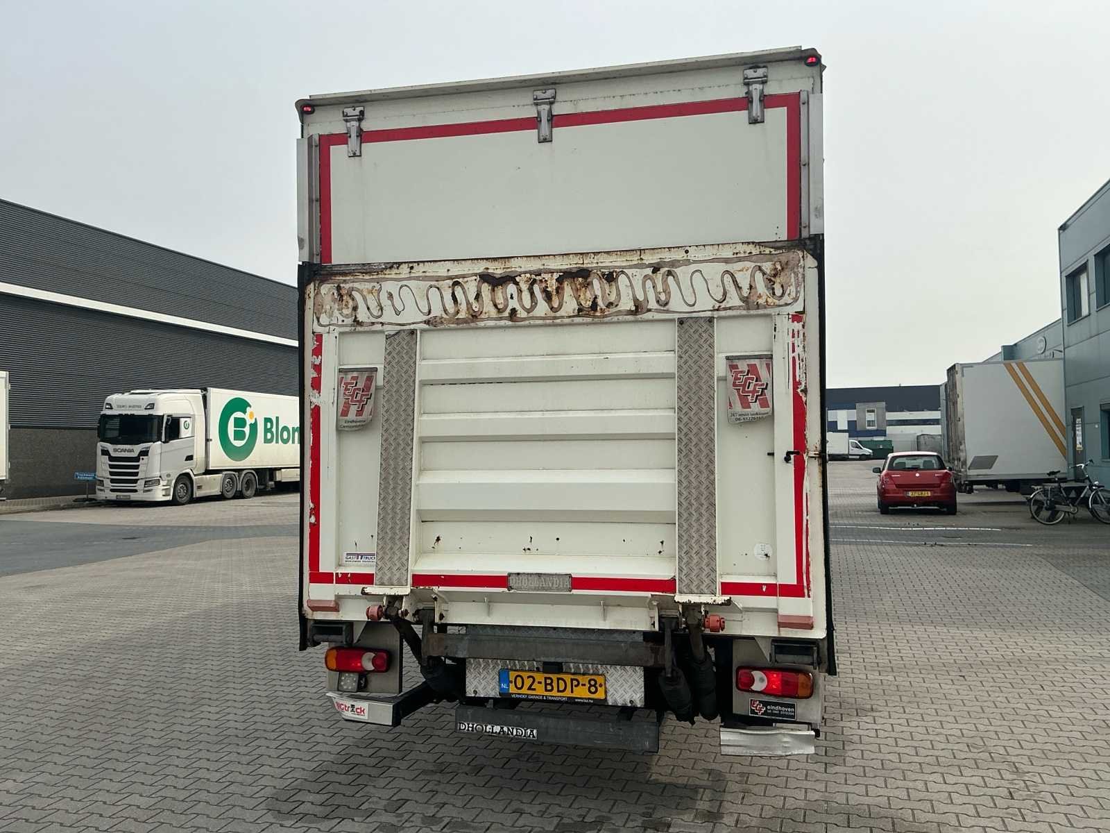Voorzien van hydraulische laadklep (Dhollandia), capaciteit 1500 kg Motorvermogen: 210 PK Transmissie: Automaat met handmatig doorschakelen via knoppen Uitvoering: Adaptieve cruise control Bandenmaat: 245/70 R17.5 Banden: 2 banden vervangen bij km-stand ca. 740.000 km (zie foto’s) Documentatie: Factuur Profile aanwezig (zie afbeelding) Kenteken: 02BDP8 Merk: DAF Type: LF 210 FA Bouwjaar: 2014 Chassisnummer VIN: XLRAEL1500L434343 Cilinderinhoud: 4500cc Kilometerstand bij opname: 752054km APK vervaldatum: 2026-08-22 Datum eerste toelating: 2014-02-21 Datum eerste toelating (NL): 2014-02-21 Type transmissie: Automatisch Aantal assen: 2 Asconfiguratie: 4x2 Fuel Type: Diesel Laadvermogen: 5165kg Aantal sleutels: 2 Emissieklasse: 6 Hydraulische laadklep: true Gesloten opbouw: true Navigatie: true Eigen gewicht: 6825kg Totale afmeting L: 9480mm Totale afmeting Breedte: 2550mm Totale afmeting Hoogte: 3550mm Nationaliteit documenten: Nederlandsche Kentekenpapieren compleet?: true Aantal zitplaatsen: 2 Handgeschakelde versnellingsbak: true Automaat: true