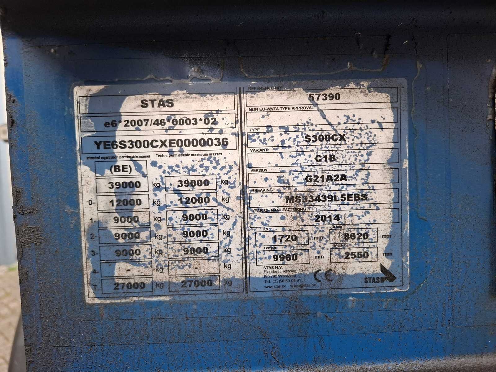 30 m3 Merk: Stas Type: S300CX Type aanhangwagencarrosserie: Kiepaanhangwagen Bouwjaar: 2014 Chassisnummer VIN: YE6S300CXE0000036 Kenteken: OT-16-DN Datum eerste toelating: 2014-01-15 APK vervaldatum: 2026-01-13 Aantal assen: 3 Laadvermogen: 39000kg Eigen gewicht: 5630kg Totale afmeting L: 9960mm Totale afmeting Breedte: 2550mm Zelf rijdend exporteren: Mogelijk