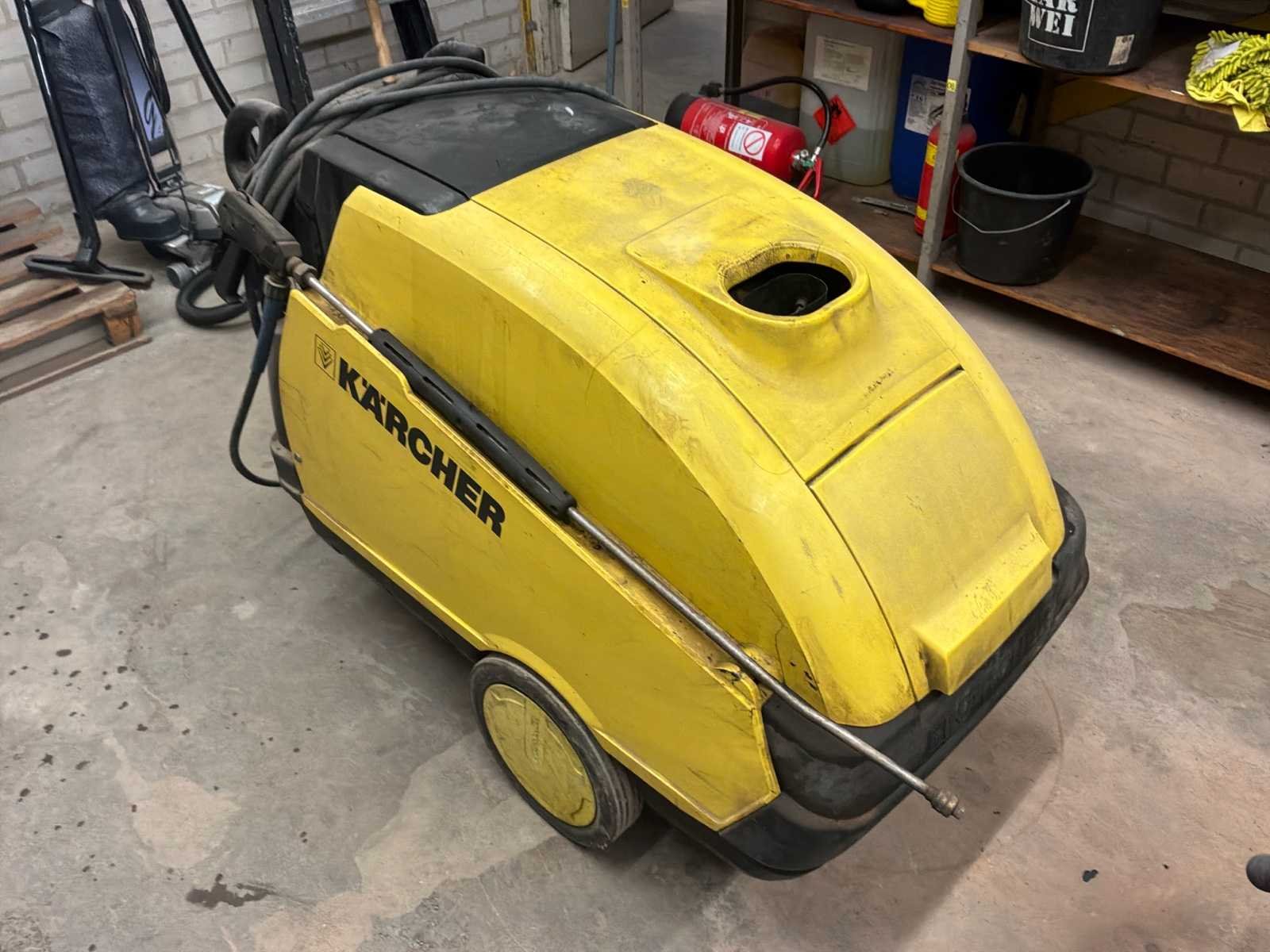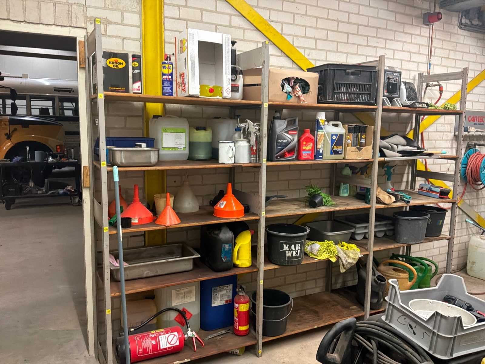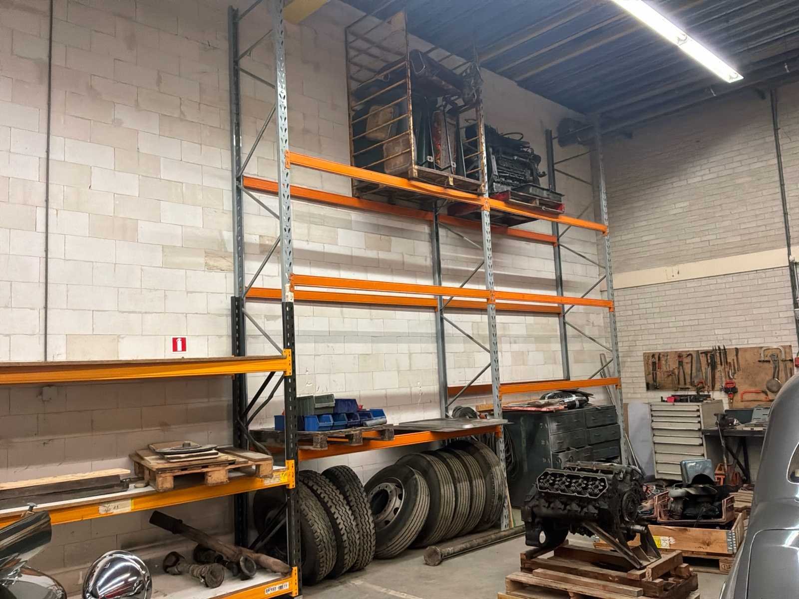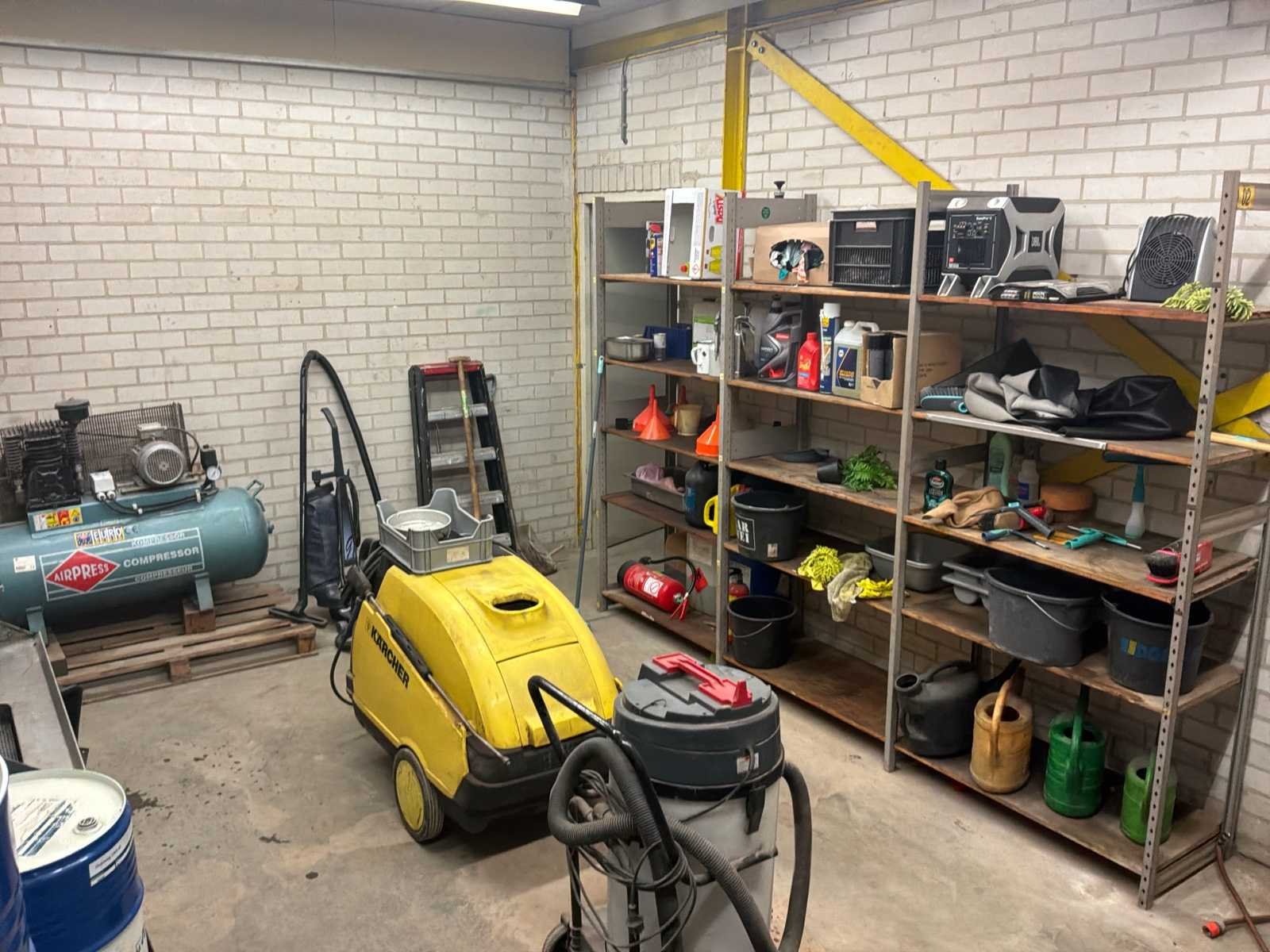 Bestaande uit onder andere 1x Kärcher HDS755 hogedrukreiniger (werking onbekend), 1x Airpress K200-600 compressor, 1x legbordstelling met inhoud circa 303x50x212cm, 1x Powerbrush GV702 industriële(water)stofzuiger, 1x Tech Drive G4 stofzuiger, 2x palletstelling circa 283x93x198/257cm (zonder inhoud), 1x palletstelling circa 570x90x540cm (zonder inhoud), 1x houten ladekast met inhoud circa 168x82x120cm, diverse handgereedschap, 1x werkbank met stalen blad inclusief bankschroef afmeting circa 300x89x85cm, partij diverse auto-onderdelen verdeeld over diverse kasten (kasten niet inbegrepen), 3x rode werkbank circa 120x80x81cm voorzien van 1 Slibette slijpmachine en 1x bankschroef inclusief handgereedschap, 1x garagekrik, diverse hijsmaterialen, 1x Kinzo 8E316 zaagtafel, 1x transportwagen circa 105x60x100cm, 1x transportwagen met inhoud circa 139x65x87cm