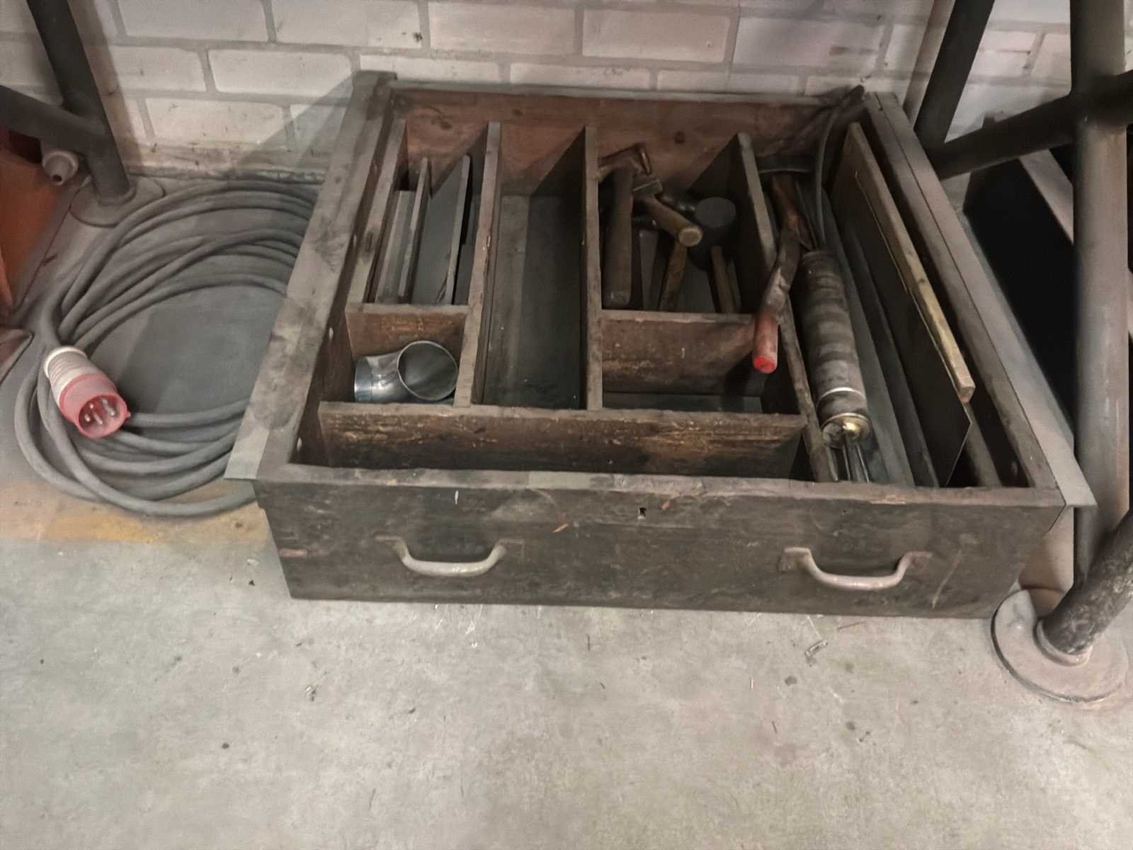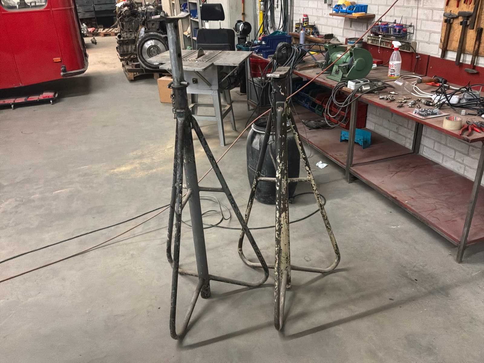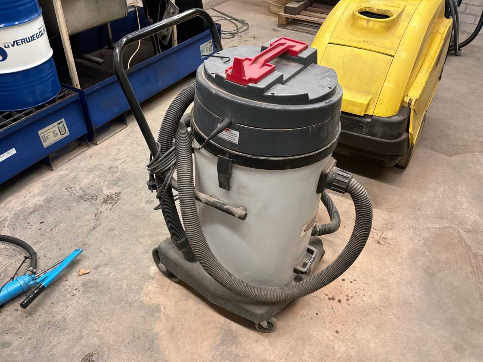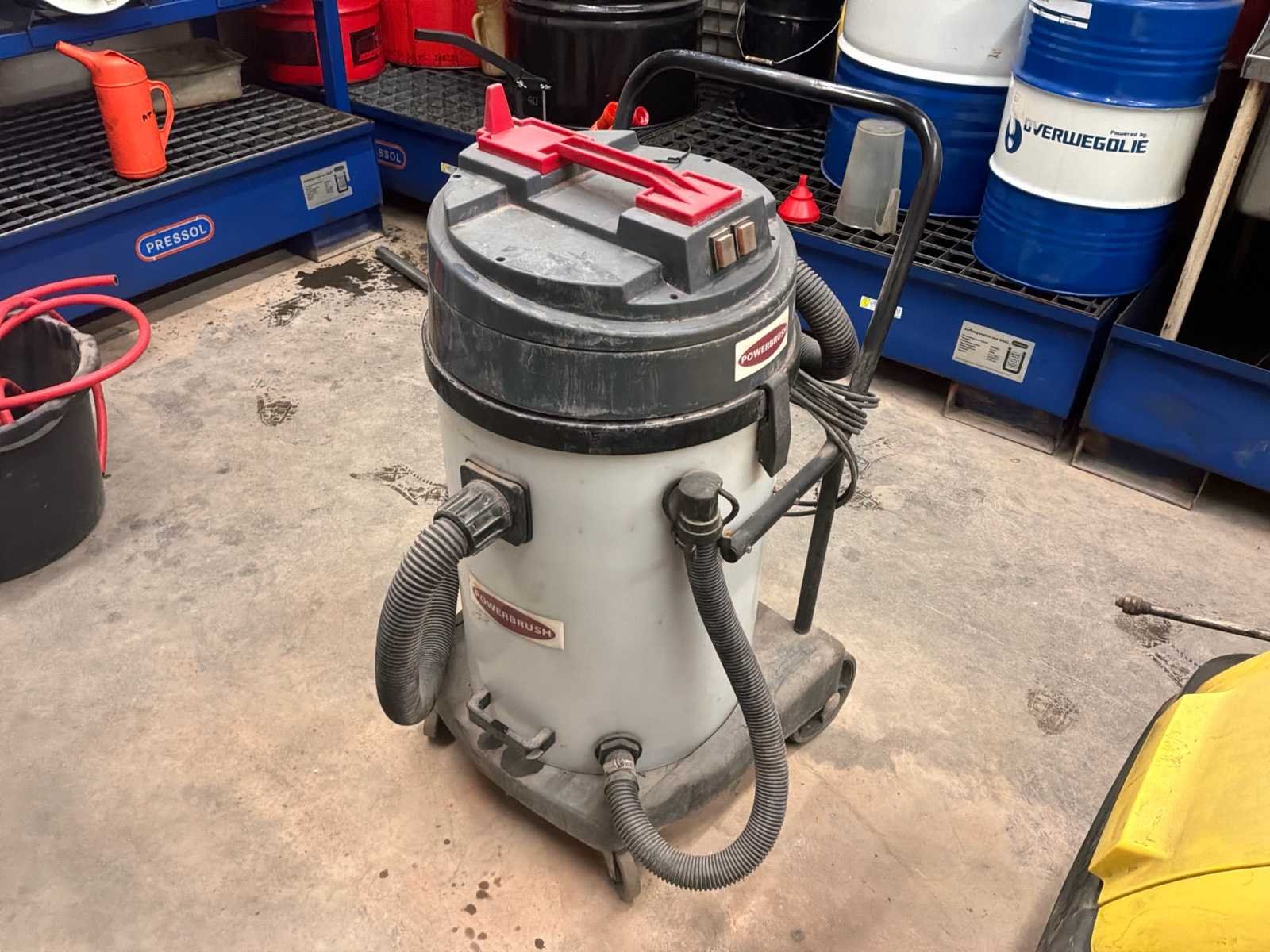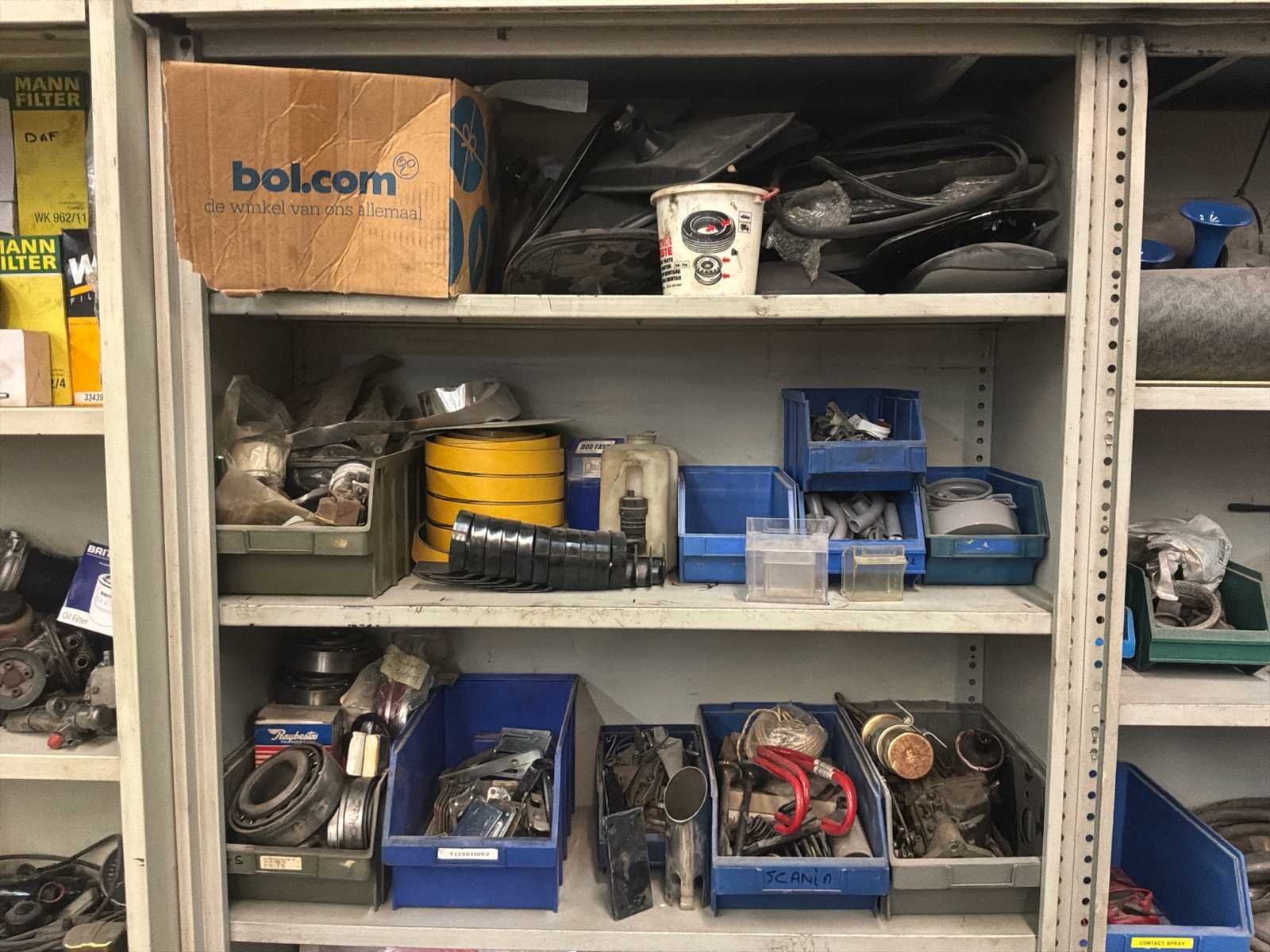Bestaande uit onder andere 1x Kärcher HDS755 hogedrukreiniger (werking onbekend), 1x Airpress K200-600 compressor, 1x legbordstelling met inhoud circa 303x50x212cm, 1x Powerbrush GV702 industriële(water)stofzuiger, 1x Tech Drive G4 stofzuiger, 2x palletstelling circa 283x93x198/257cm (zonder inhoud), 1x palletstelling circa 570x90x540cm (zonder inhoud), 1x houten ladekast met inhoud circa 168x82x120cm, diverse handgereedschap, 1x werkbank met stalen blad inclusief bankschroef afmeting circa 300x89x85cm, partij diverse auto-onderdelen verdeeld over diverse kasten (kasten niet inbegrepen), 3x rode werkbank circa 120x80x81cm voorzien van 1 Slibette slijpmachine en 1x bankschroef inclusief handgereedschap, 1x garagekrik, diverse hijsmaterialen, 1x Kinzo 8E316 zaagtafel, 1x transportwagen circa 105x60x100cm, 1x transportwagen met inhoud circa 139x65x87cm