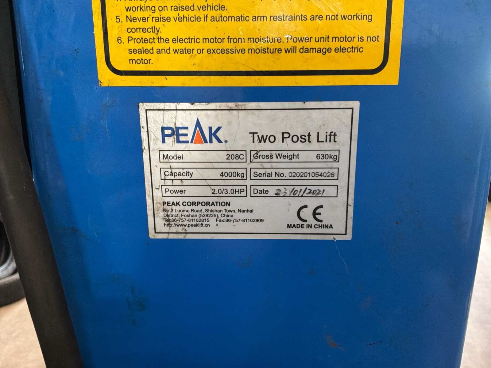 Vermogen 2.0/3.0HP * hefhoogte circa 265cm * inclusief 2 steunen 125cm hoog * let op u bent zelf verantwoordelijk voor het demonteren en laden van deze kavel. Er zijn geen hulpmiddelen beschikbaar. In overleg is het mogelijk om een heftruck uit de buurt te huren. Hier zitten kosten aan verbonden en kan in overleg met de verkoper. Merk: Peak Type: 208C Bouwjaar: 2021 Serienummer: 020201054029 2-koloms: true Capaciteit.: 4000kg Baanbreedte: 2500mm Aansluiting: 380V Eigen gewicht: 640kg Totale afmeting L: 2240mm Totale afmeting Breedte: 3250mm Totale afmeting Hoogte: 3600mm Leveringsvoorwaarden: Niet gefundeerd - onverpakt