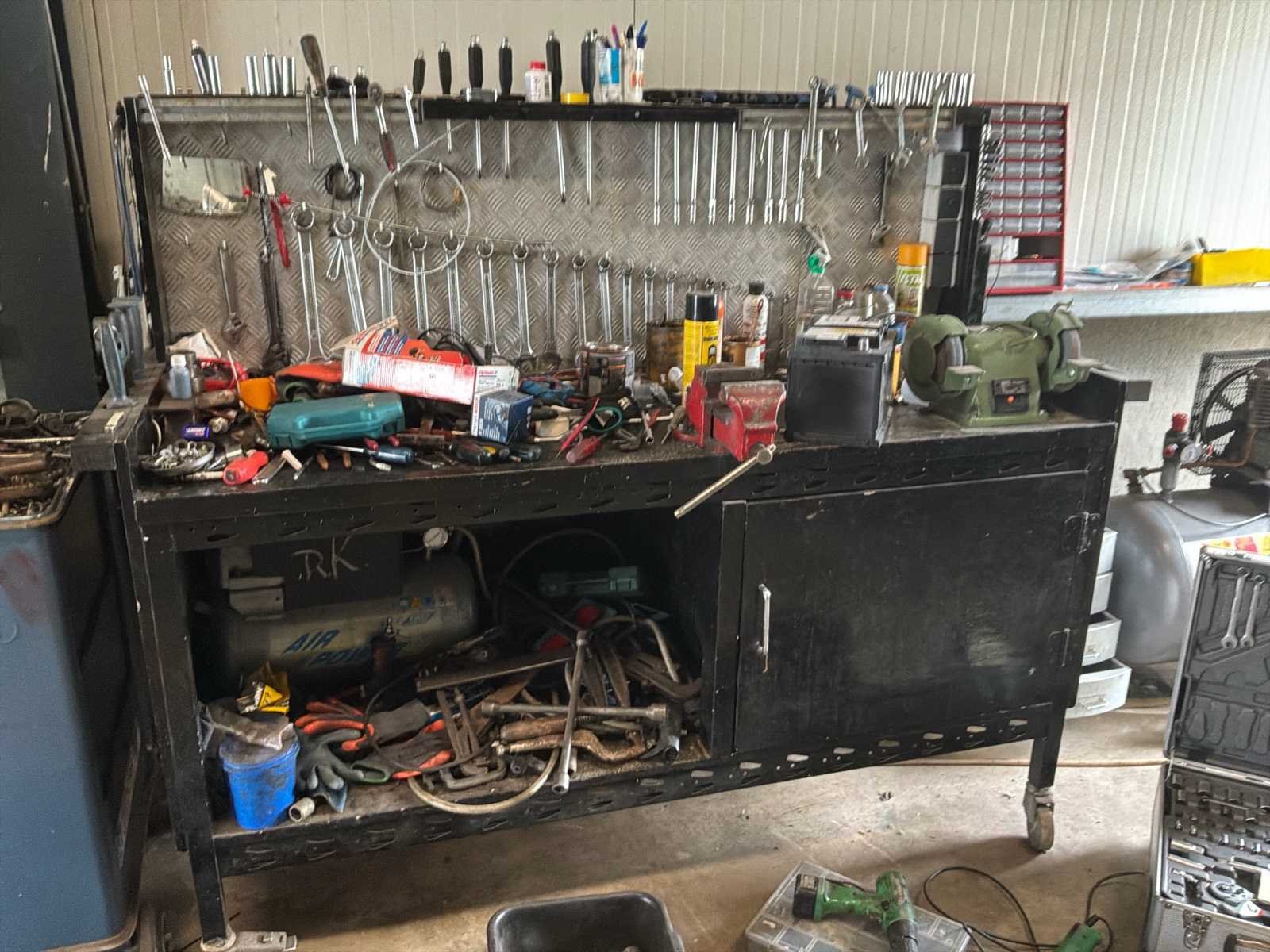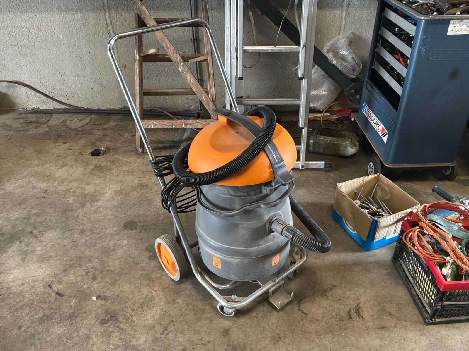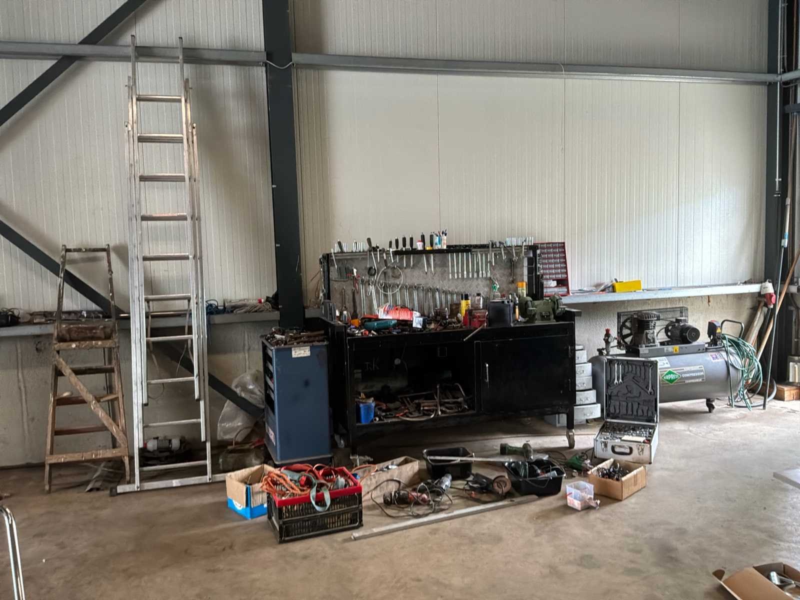 Bestaande uit 1x Gedore gereedschapswagen met inhoud afmeting circa 60x40x92cm * 1x gereedschapswagen met inhoud afmeting circa 188x70x152cm werkhoogte 95cm * 1x ladekast met inhoud afmeting circa 28x41x67cm * 1x Airpress compressor * 1x schuifladder * 1x houten trap * diverse los (elektrisch)gereedschap * losse accu niet inbegrepen * 1x Taski Vacumat 22T bouwstofzuiger * 1x Power Compact lasmachine * rollerbank en Kaltenbach zaagmachine