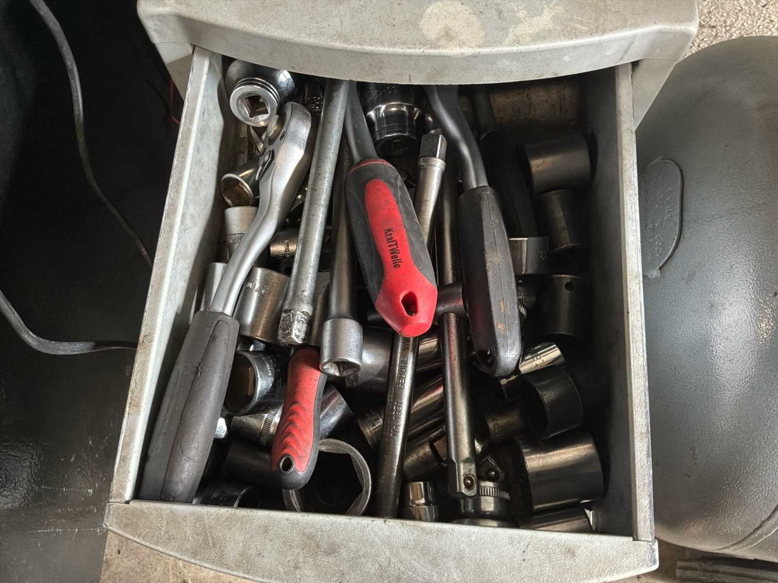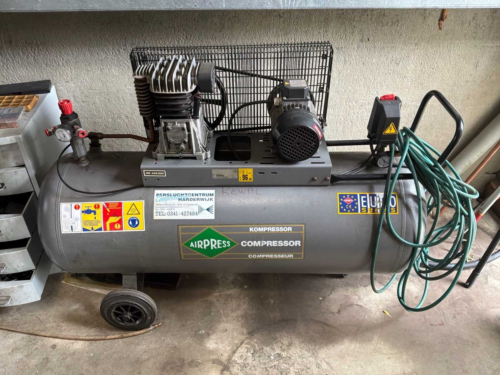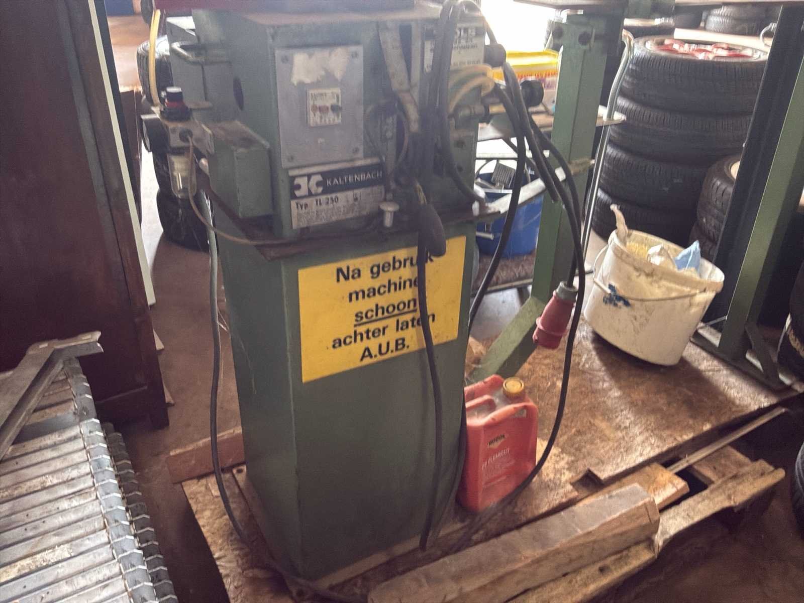 Bestaande uit 1x Gedore gereedschapswagen met inhoud afmeting circa 60x40x92cm * 1x gereedschapswagen met inhoud afmeting circa 188x70x152cm werkhoogte 95cm * 1x ladekast met inhoud afmeting circa 28x41x67cm * 1x Airpress compressor * 1x schuifladder * 1x houten trap * diverse los (elektrisch)gereedschap * losse accu niet inbegrepen * 1x Taski Vacumat 22T bouwstofzuiger * 1x Power Compact lasmachine * rollerbank en Kaltenbach zaagmachine
