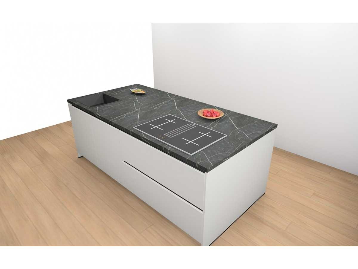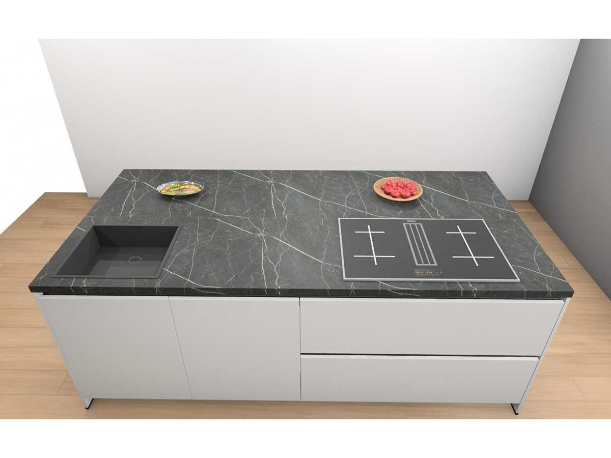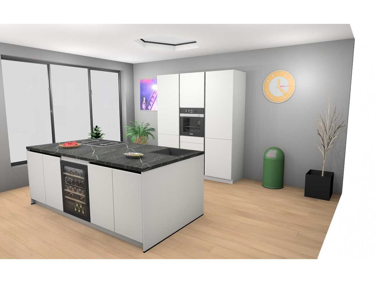 Miele KMDA7473FR-U Inductiekookplaat inclusief afzuigsysteem, 4 kookzones, 2 flex zones, 80cm. Siemens KU21WAHG0 Onderbouw wijnklimaatkast 60x82cm. Let op! Staat niet opgesteld in de showroom, enkel via 3D tekening; wordt geleverd ongebruikt in doos. Let op! Excl. Kraan en accessoires. Merk: Häcker Concept130 Model: Topsoft mat wit lak Type keukenopstelling: Eiland Lengte: 185cm Breedte: 60cm Hoogte: 218cm Gootsteen: Reginox Amsterdam 50 pure black Pure Black opbouw spoelbak 50x40cm Werkblad hoogte: 92cm Aanrechtblad: HPL Kunststof marmer groen repro (150) Koelkast: Miele K7125E Integreerbare koelkast met superKoelen, inhoud 136 liter, Nis 88cm Softclose: true Oven: Miele H2861BCLST Multifunctionele oven PureLine met 8 programma's, inhoud 76 liter, Nis 60cm. Vaatwasser: Miele G5150SCVI Volledig integreerbare vaatwasmachine met 5 reinigingsprogramma's 60cm Lengte kookeiland: 244cm Breedte kookeiland: 120cm Hoogte kookeiland: 92cm Plintkleur: mat wit Hoofdkleur: mat wit lak Style: Modern greeploos Kleur: mat wit lak