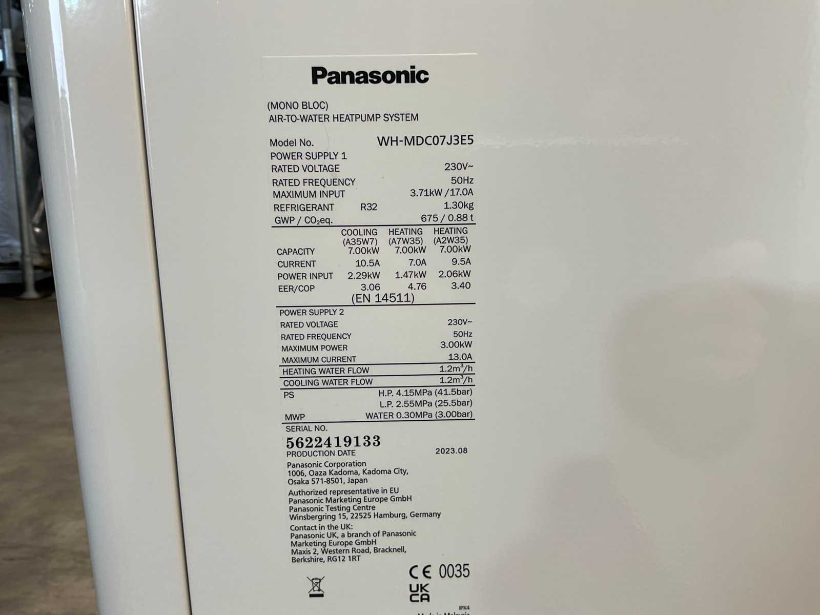 Panasonic WH-MDC07J3E5 warmtepomp zonder installatie. De Panasonic WH-MDC07J3E5 is een Aquarea High Performance warmtepomp uit de J-generatie met mono-bloc configuratie, geschikt voor het leveren van verwarming en koeling binnen één systeem. De unit werkt met het koudemiddel R32 en onttrekt warmte uit de buitenlucht voor afgifte aan het verwarmingssysteem. De warmtepomp heeft een verwarmingscapaciteit van 7,00 kW (A+7°C, W35°C) met een COP van 4,76. Bij hogere watertemperaturen (W55°C) bedraagt de capaciteit 7,00 kW met een COP van 3,40. De seizoensgebonden efficiëntie bedraagt SCOP 4,90 (W35°C) en 3,32 (W55°C). Voor koeling levert de unit een capaciteit van 7,00 kW. De buitenunit heeft afmetingen van 1283 × 320 × 865 mm (B × D × H) en een nettogewicht van circa 104 kg. Het werkbereik voor verwarmen ligt tussen -20 °C en +35 °C buitentemperatuur en voor koelen tussen 10 °C en +43 °C. De maximale water-uitlaattemperatuur bedraagt 60 °C in verwarmingsmodus. Merk: Panasonic Type: WH-MDC07J3E5 Bouwjaar: 2023 Koelcapaciteit (BTU/h): 23900 Koelcapaciteit (W): 7000 Verwarmingscapaciteit: 7000 Type koudemiddel: R32 Aansluiting: 230V Eigen gewicht: 104kg Totale afmeting L: 1283mm Totale afmeting Breedte: 320mm Totale afmeting Hoogte: 865mm