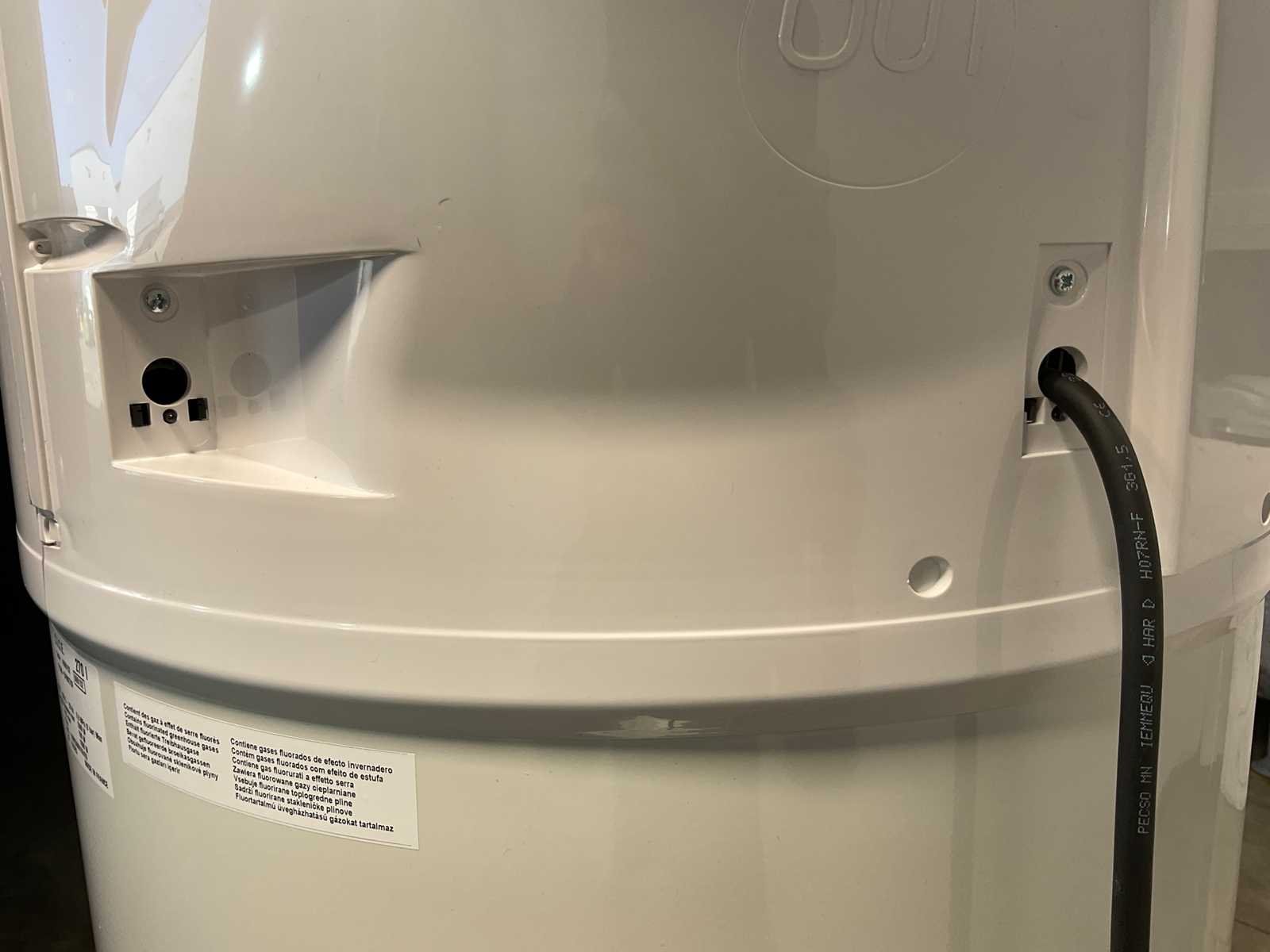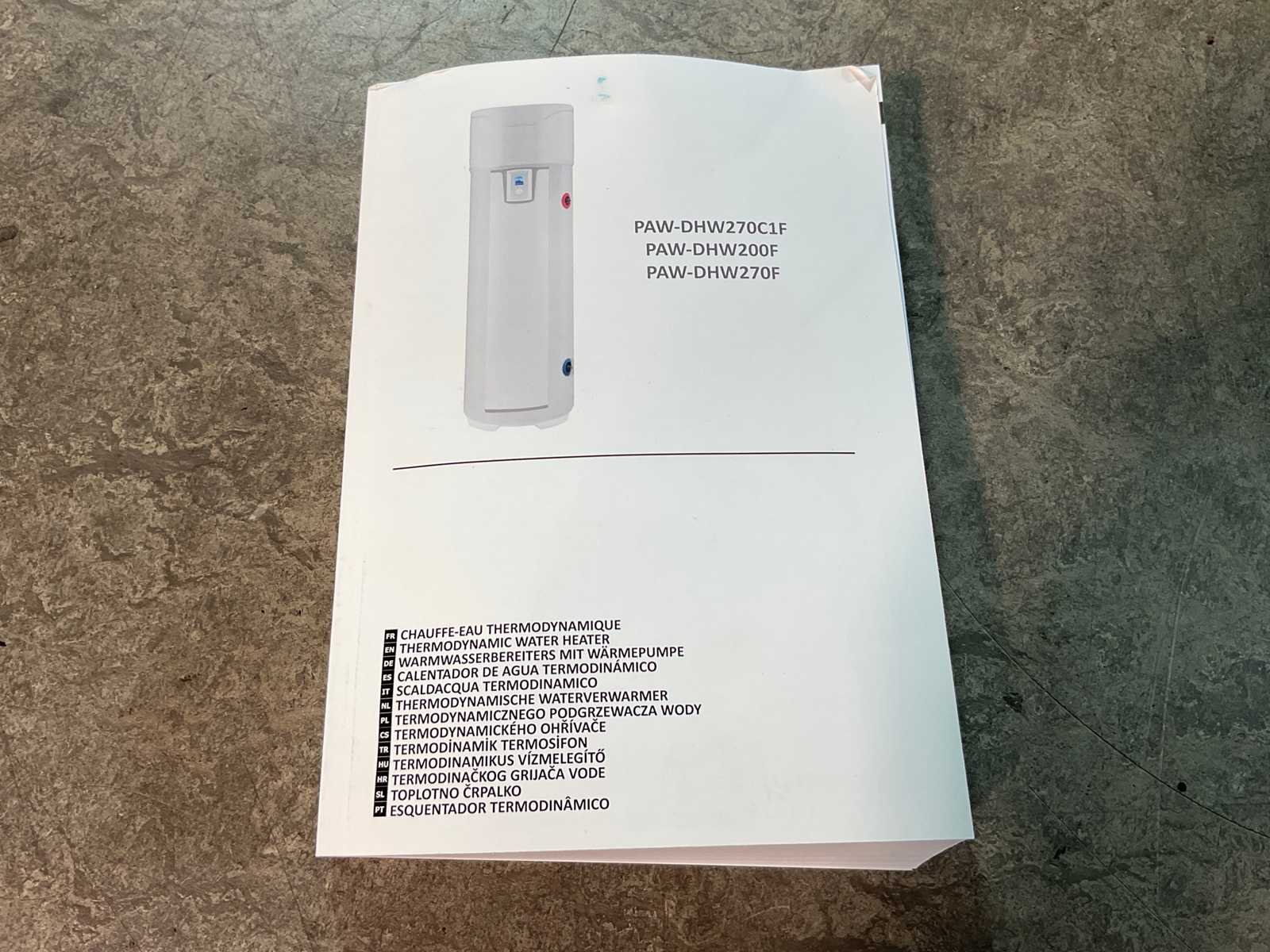 Panasonic PAW-DHW270F warmtepompboiler zonder installatie. Deze unit betreft een zelfstandige warmtepompboiler voor de productie van sanitair warm water. De boiler is uitgevoerd als vloermodel en werkt met koudemiddel R513A. De boiler heeft een opslagcapaciteit van 270 liter en is voorzien van een geïntegreerde warmtepomp. Het maximale opgenomen vermogen bedraagt circa 2,3 kW en de unit werkt op 230 V (1-fase). De boiler is geschikt voor toepassing in residentiële installaties als energiezuinig alternatief voor traditionele elektrische boilers en kan functioneren binnen een breed temperatuurbereik. Merk: Panasonic Model: PAW-DHW270F Product type: Warmtepompboiler Kleur: grijs, wit Gewicht: 92kg Lengte: 66,5cm Breedte: 62cm Hoogte: 195,7cm