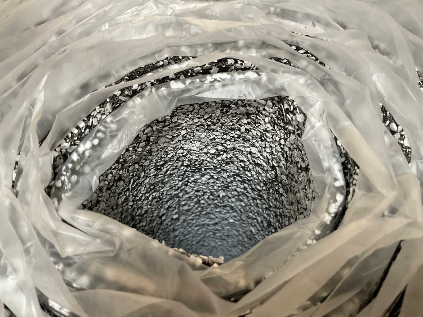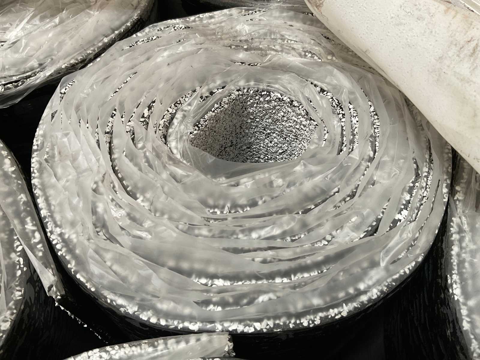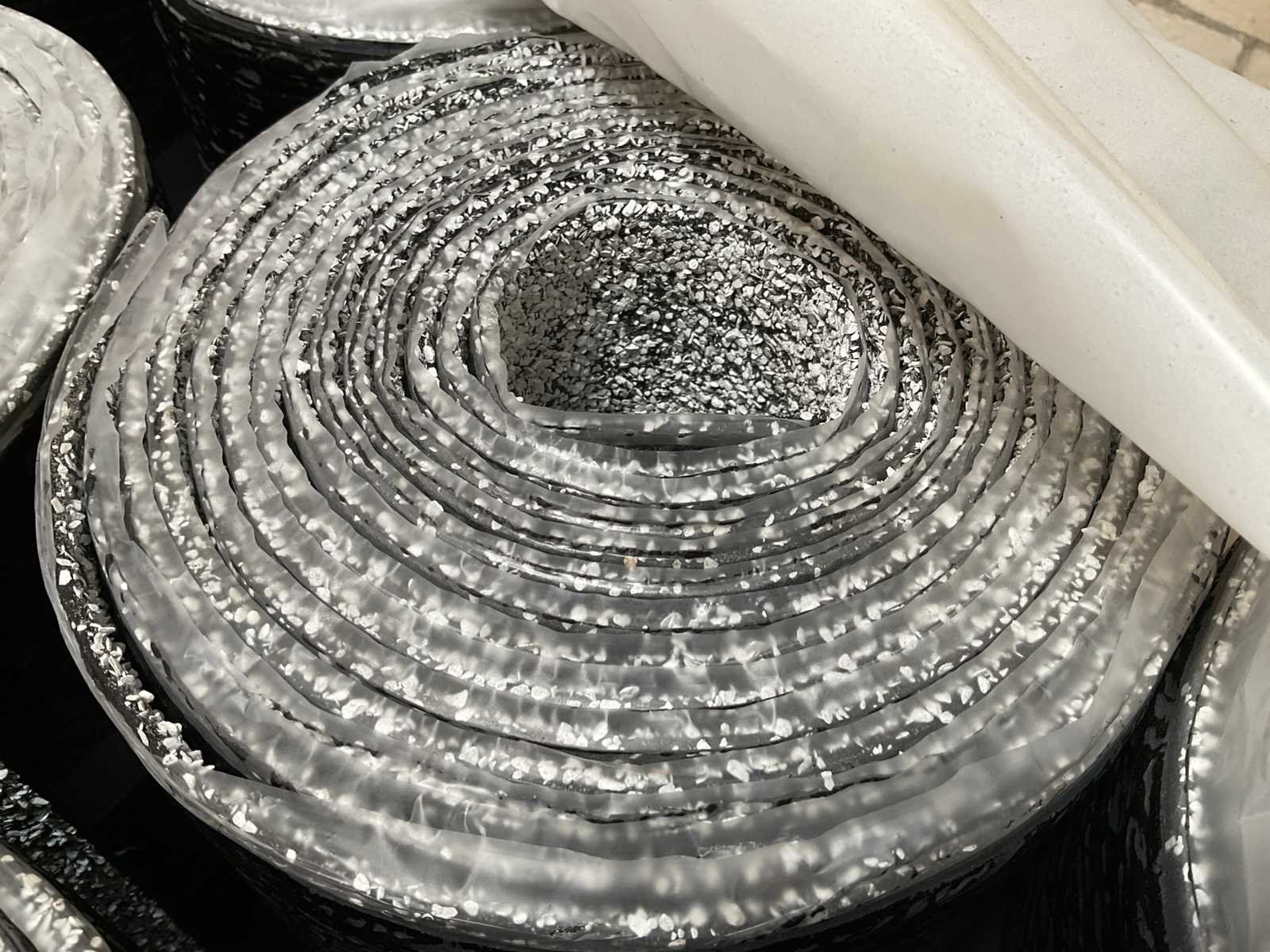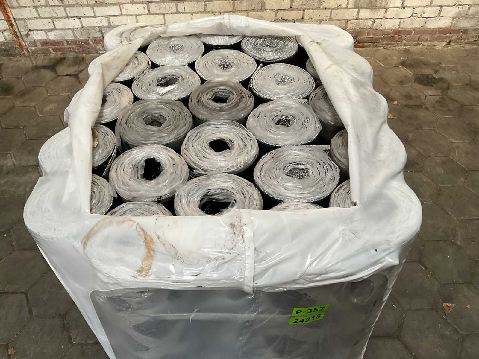 Pallet met 25 rollen bitumen dakleer. Let op: mix witte leislag (21 rollen), grijze leislag (3 rollen) & 1 rol bovenlaag.