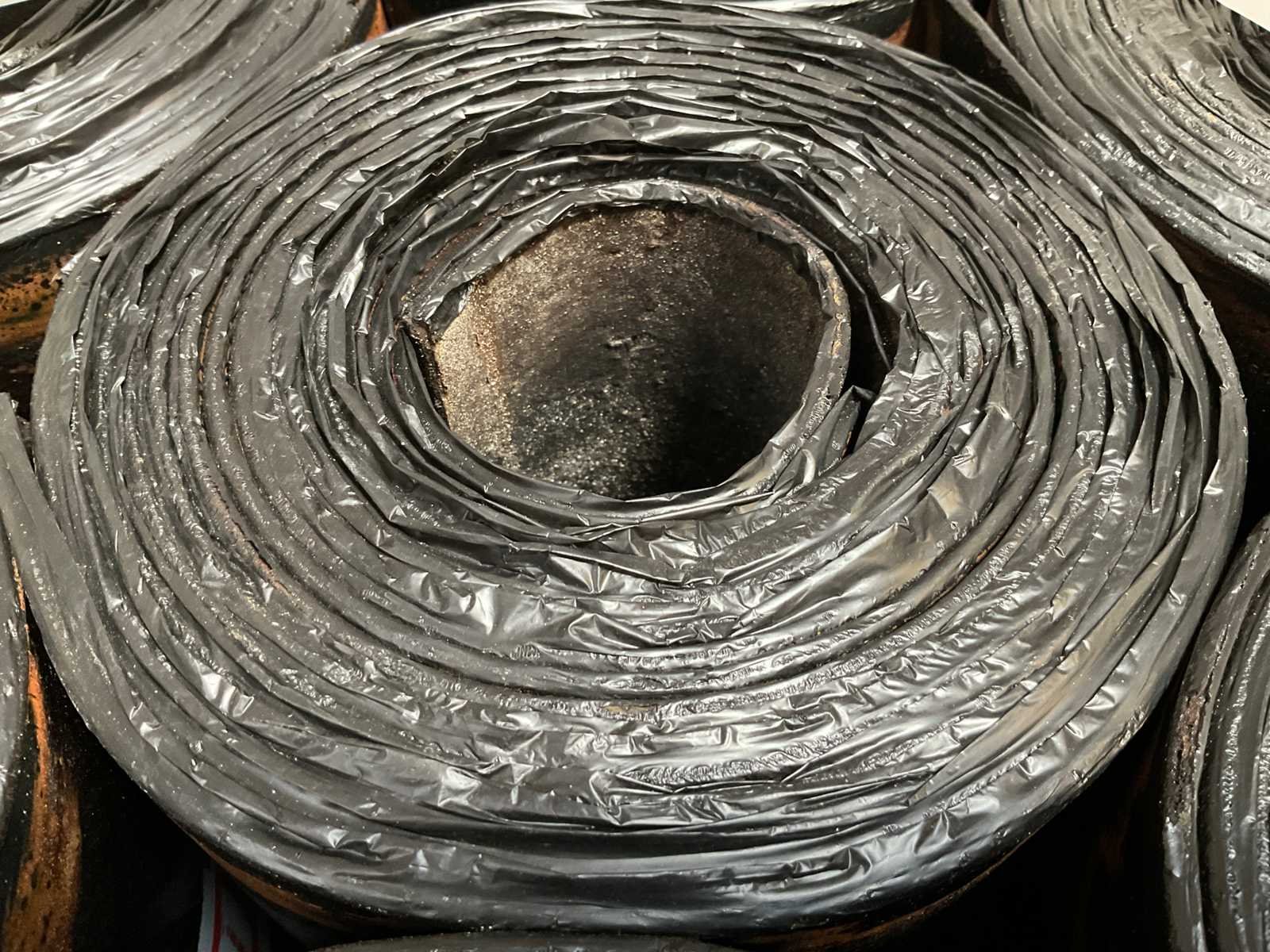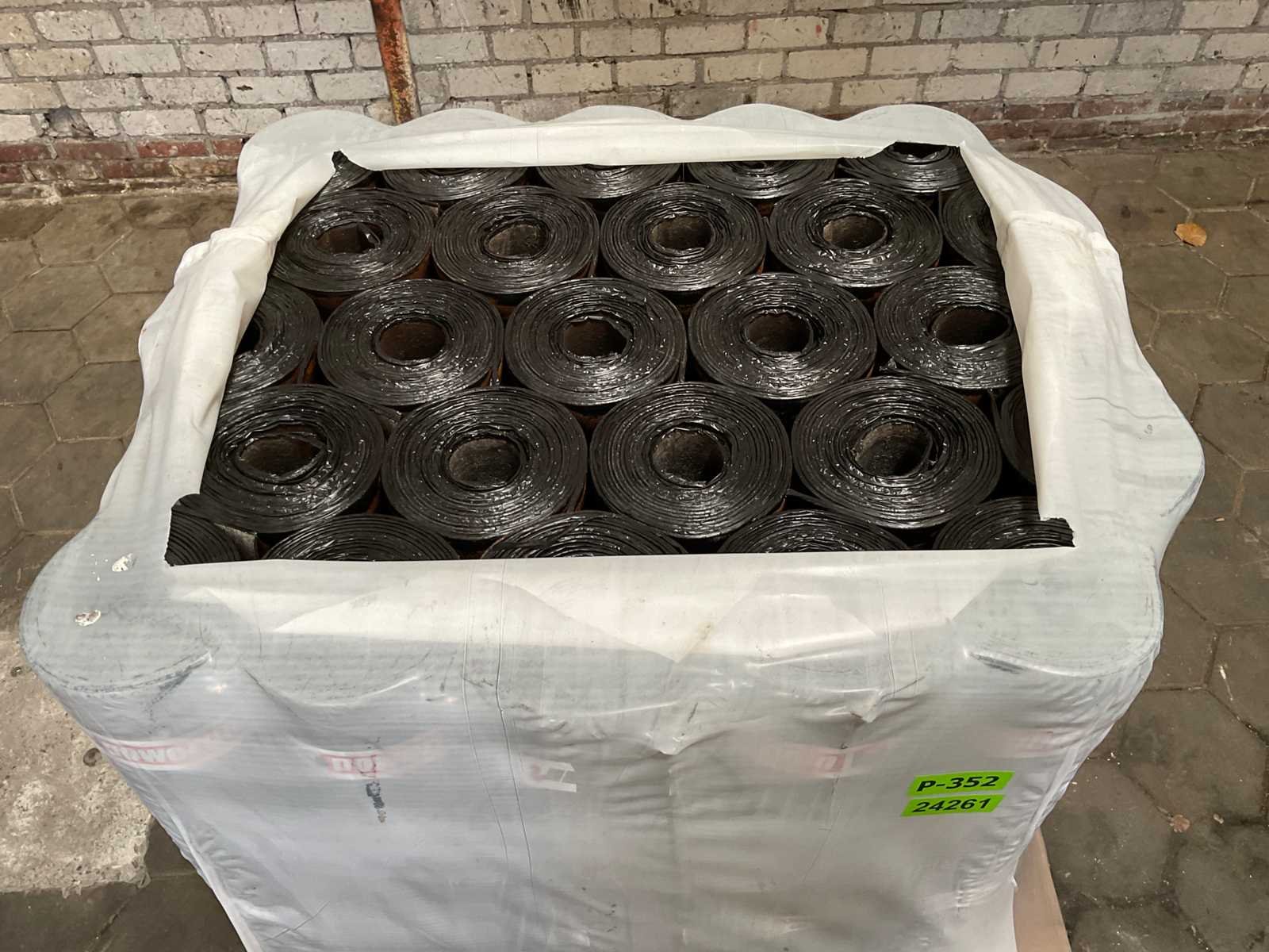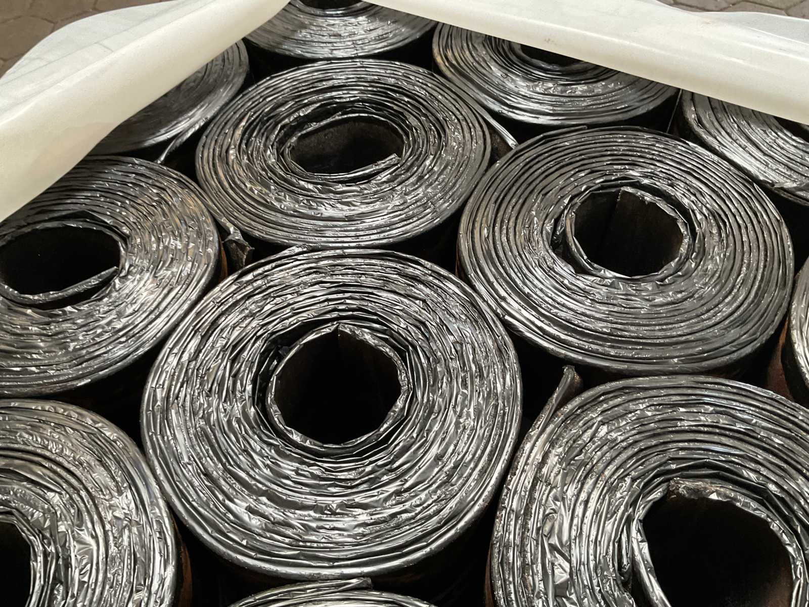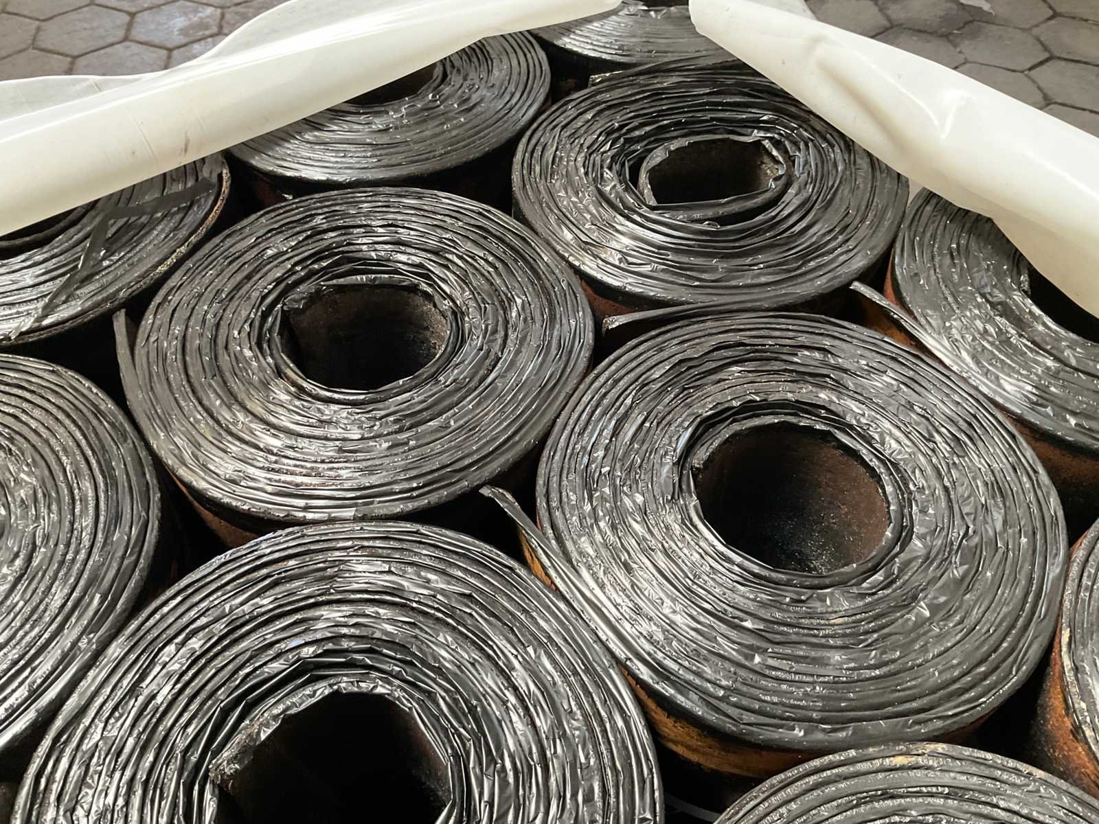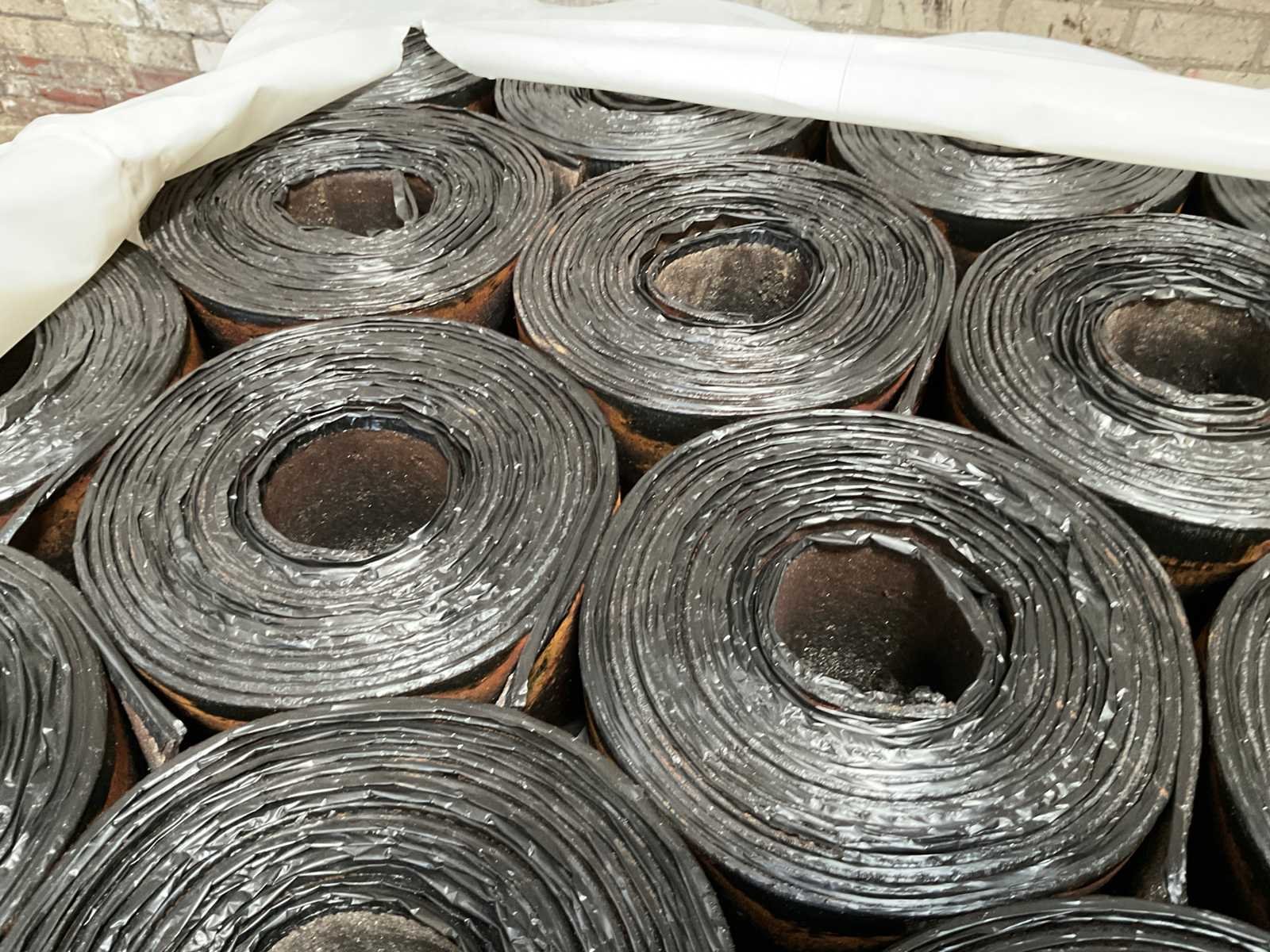 Pallet met 25 rollen bitumen dakleer.