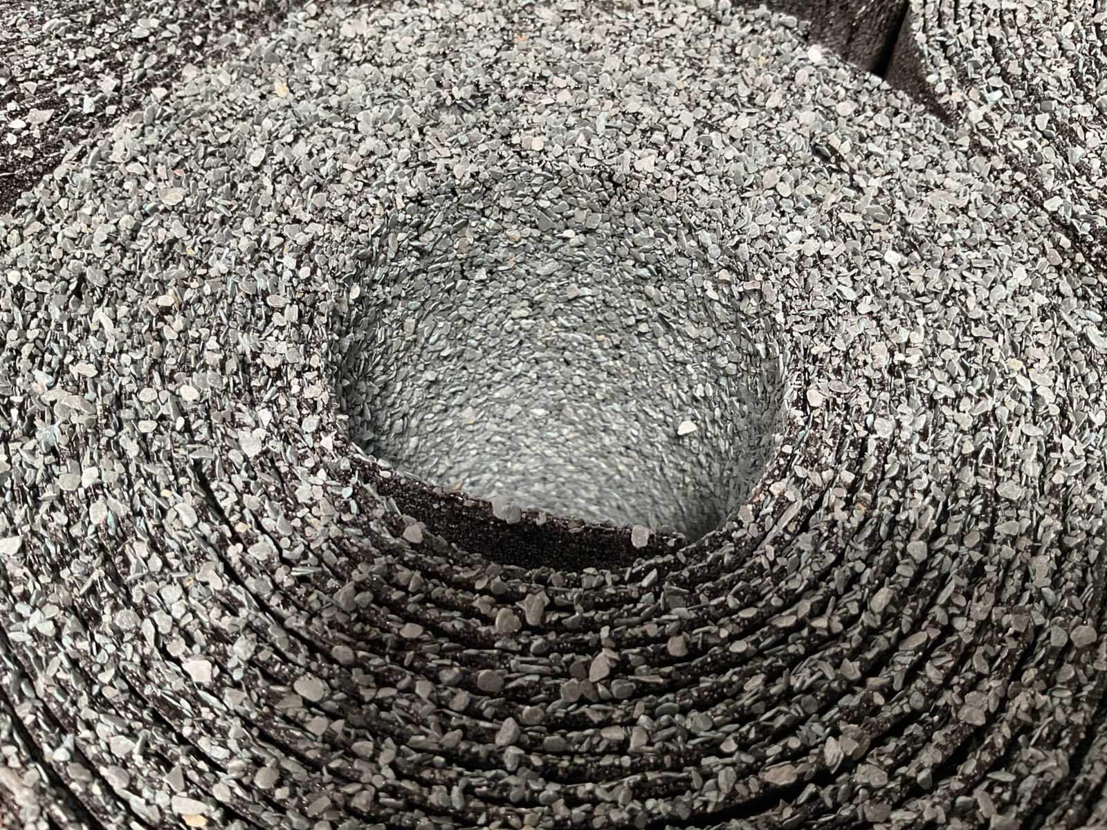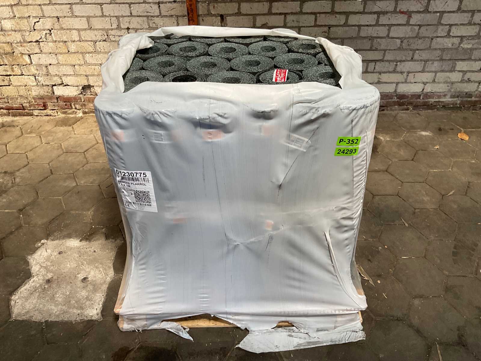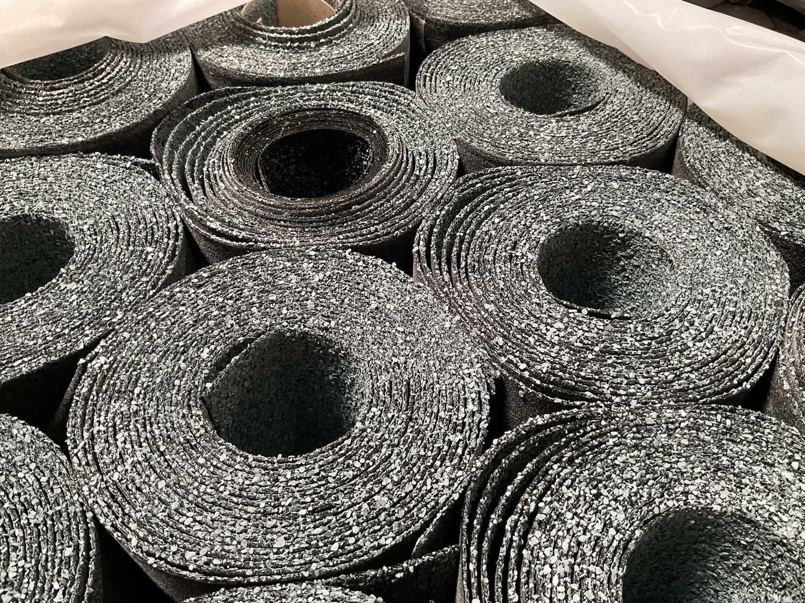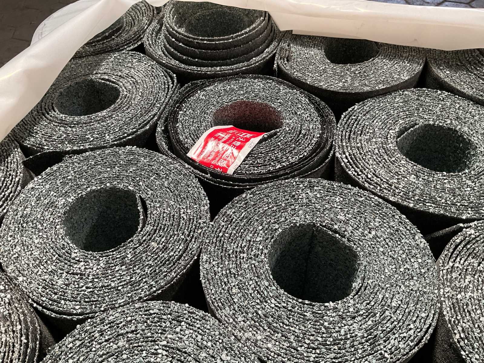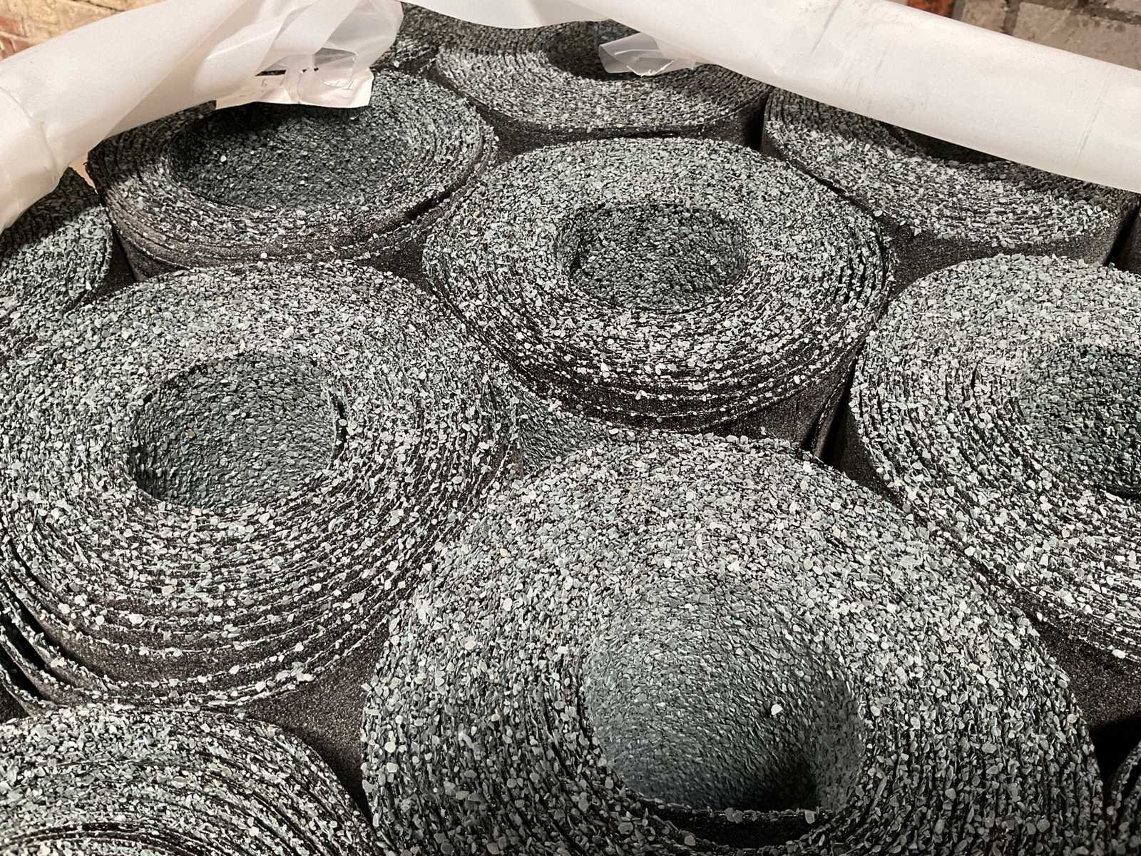 Pallet met 27 rollen bitumen dakleer met lichtgrijze leislag.