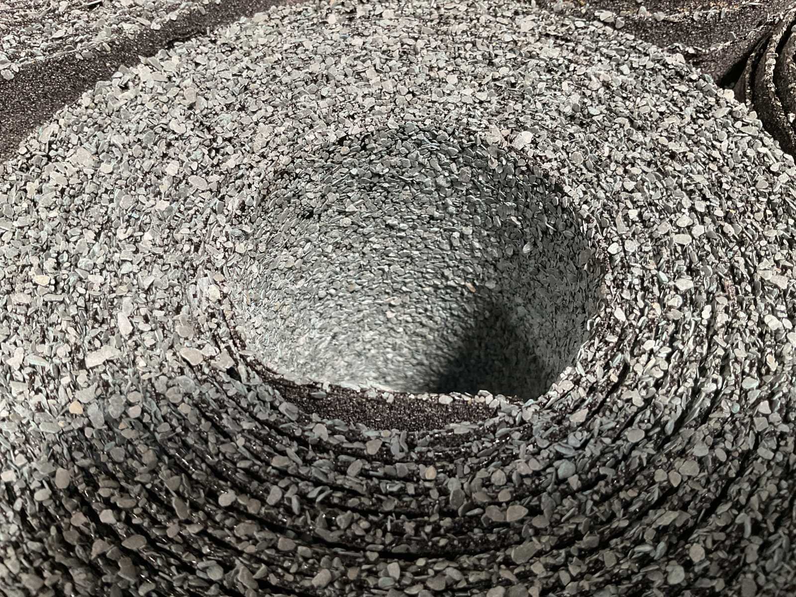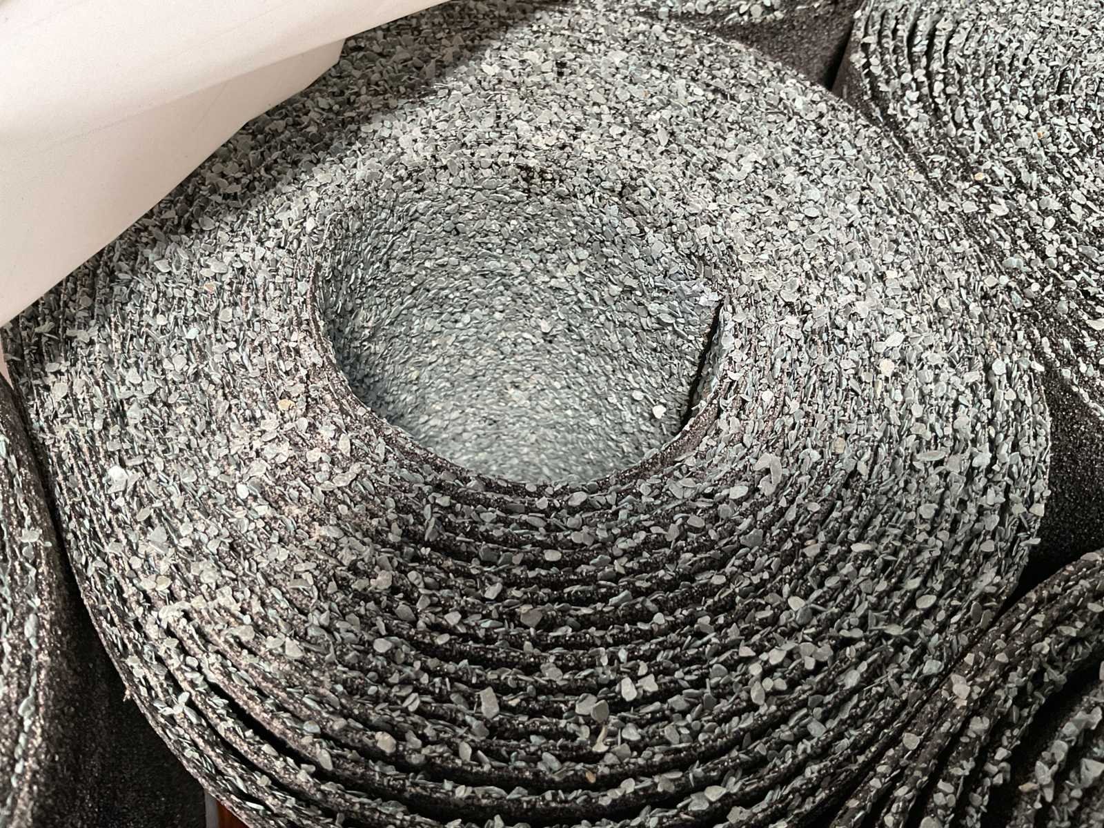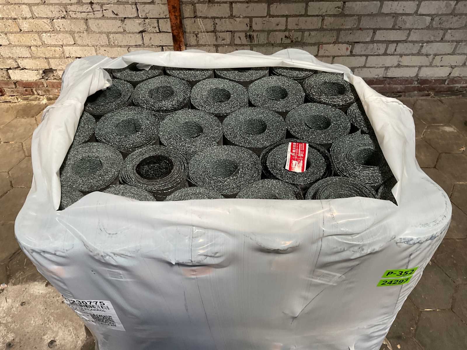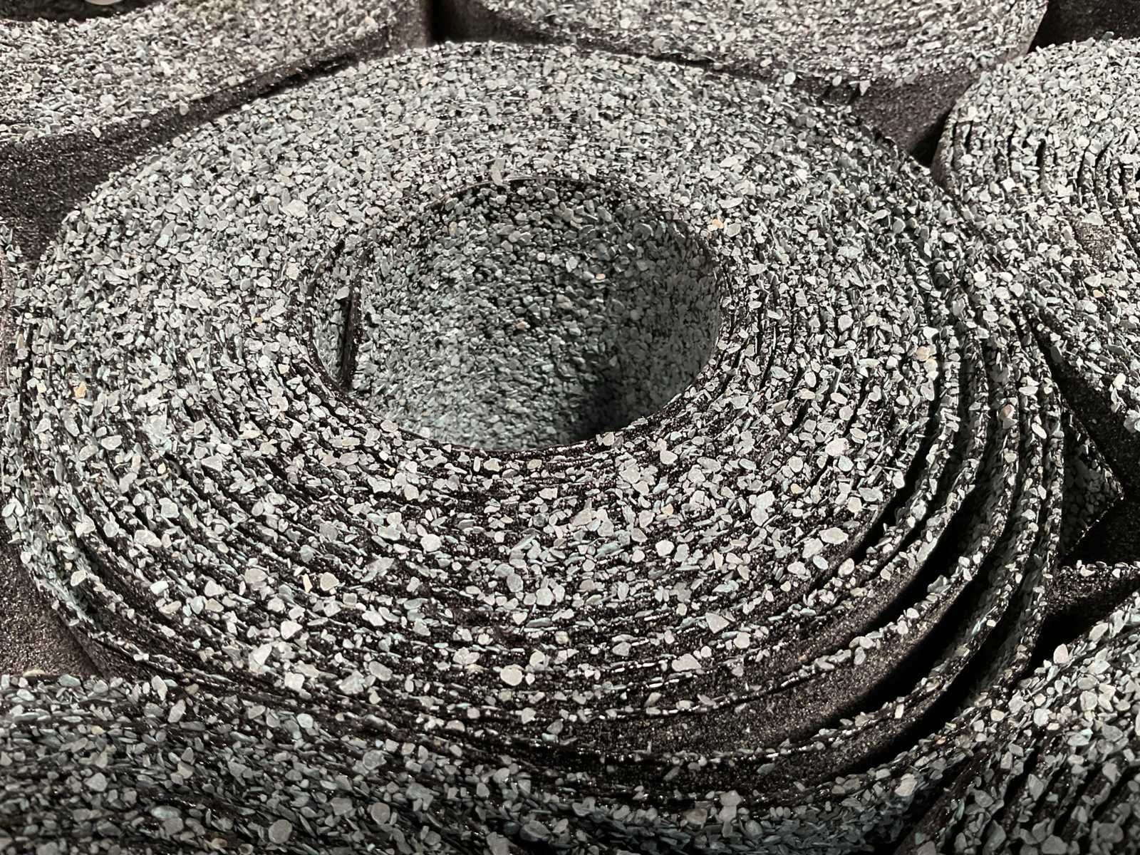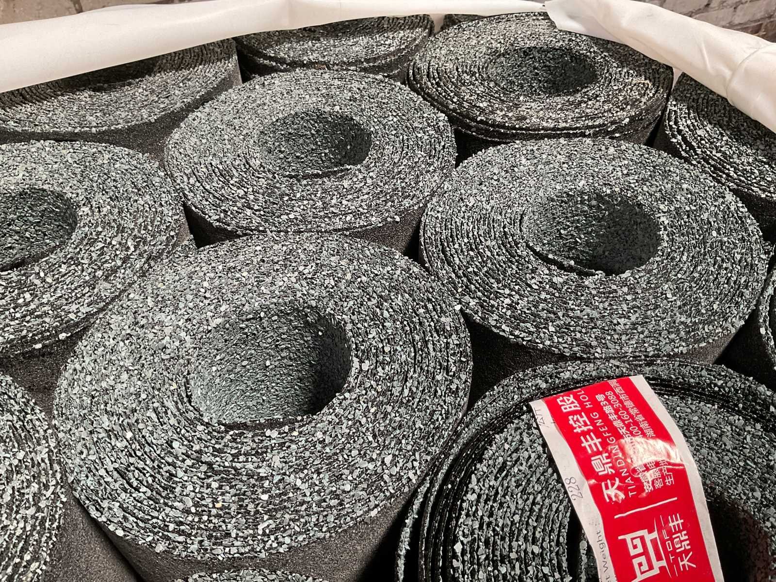 Pallet met 27 rollen bitumen dakleer met lichtgrijze leislag.