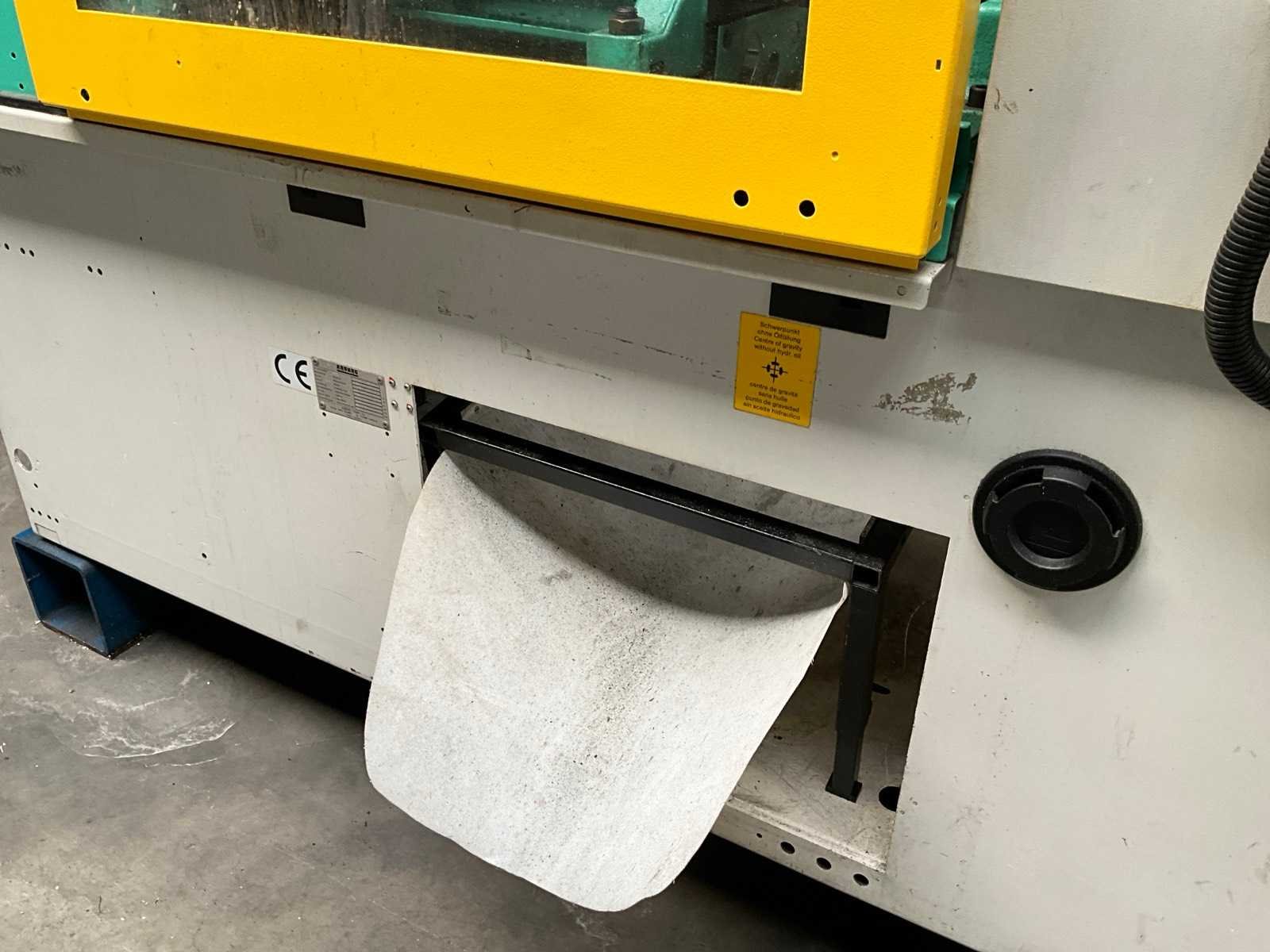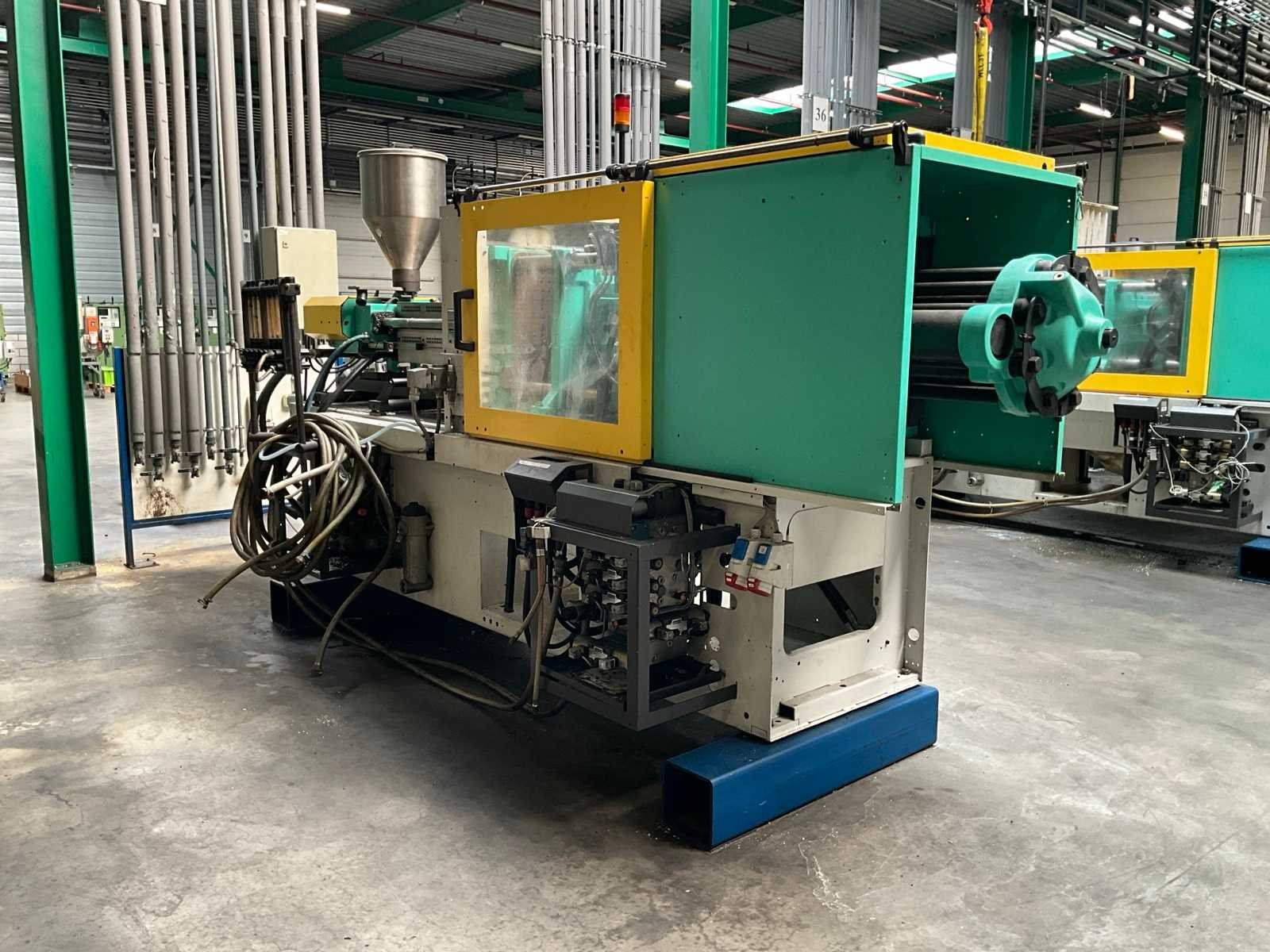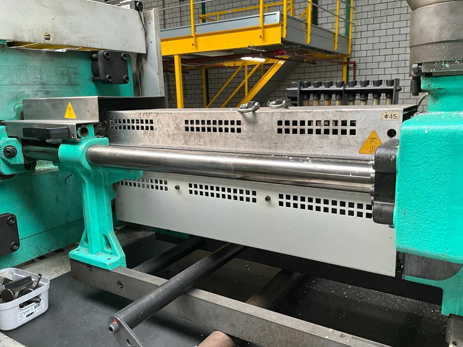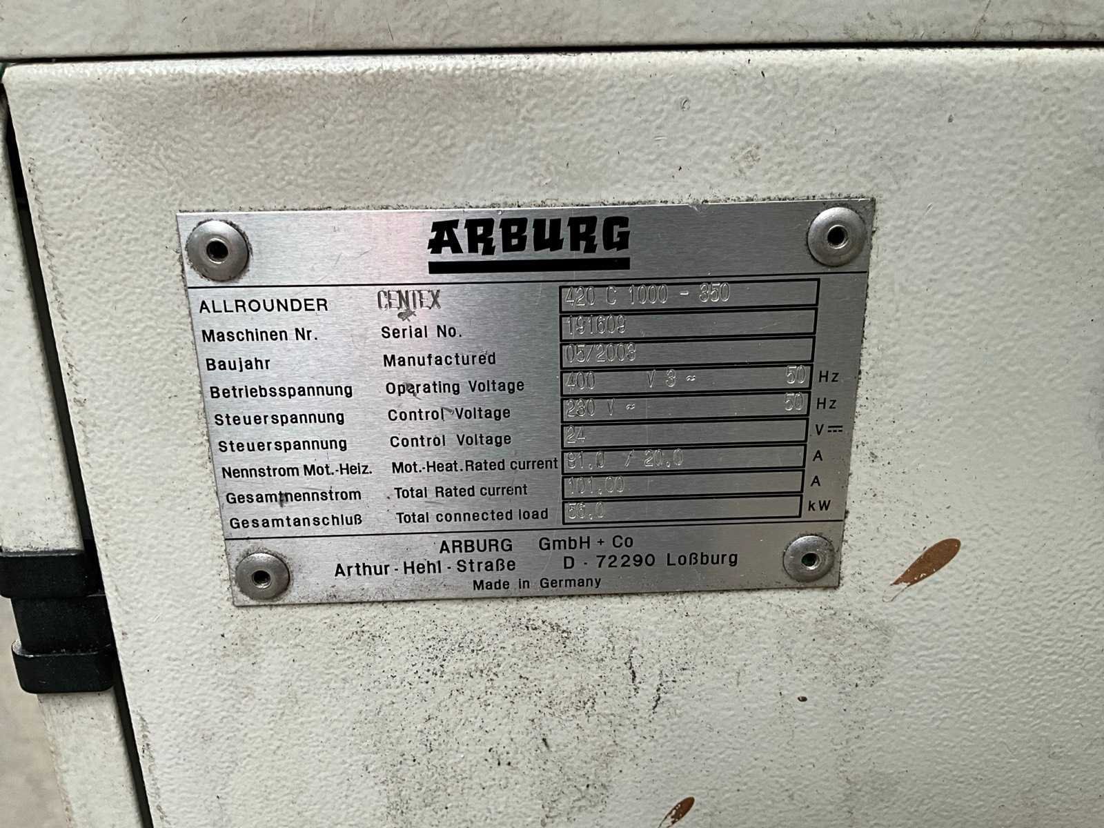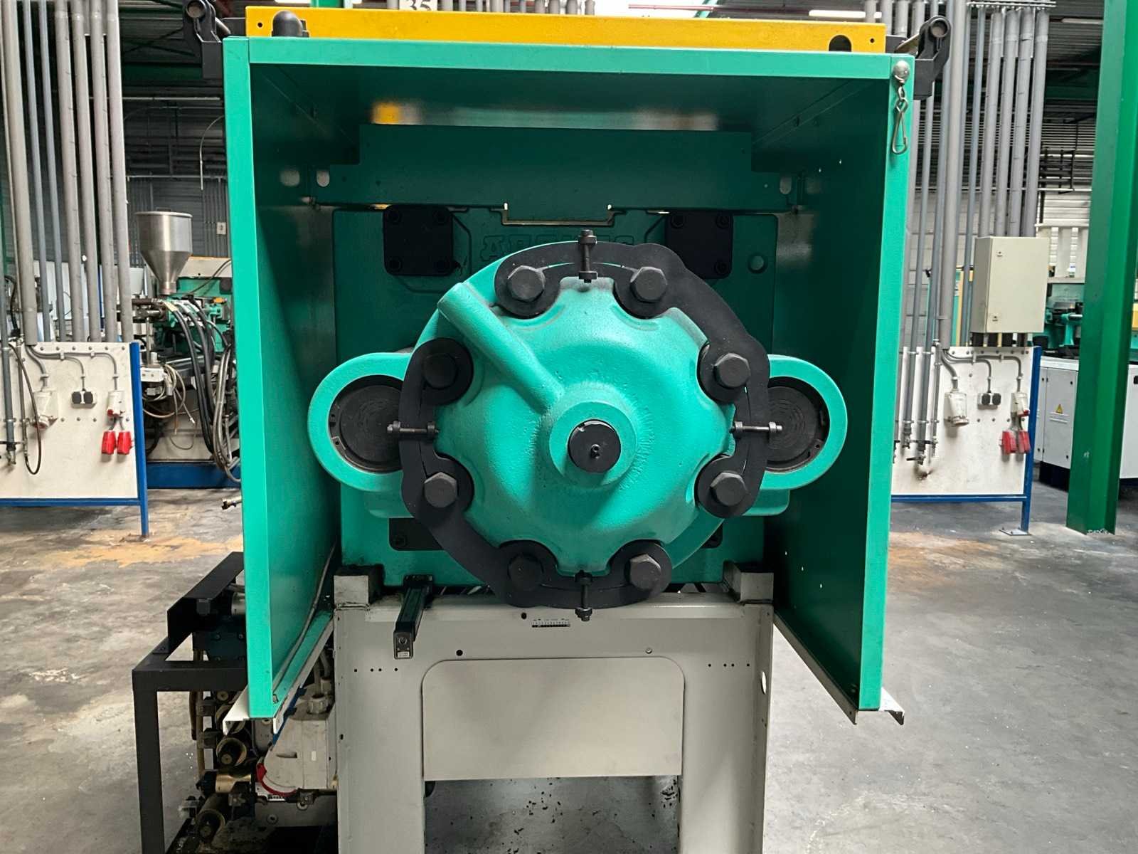 Afstand tussen de holmen 420x420 mm, gat centreerring vaste plaat Diameter 125 mm, minimale inbouw hoogte 250 mm, maximale opening 750 mm, kerntrek 1, documentatie, voorzien van hydraulische schroef aandrijving, documentatie, Let op! afhalen op afspraak Merk: Arburg Type: Allrounder 420 C 1000-350 Bouwjaar: 2003 Serienummer: 191609 Schroefdiameter: 45mm Injectievolume: 210cm³ Sluitkracht: 1000kN Digitale besturing: true Afgelezen urenstand: 51742 Aansluiting: 400V Machinegewicht: 3430kg Totale afmeting L: 4300mm Totale afmeting Breedte: 1800mm Totale afmeting Hoogte: 2300mm