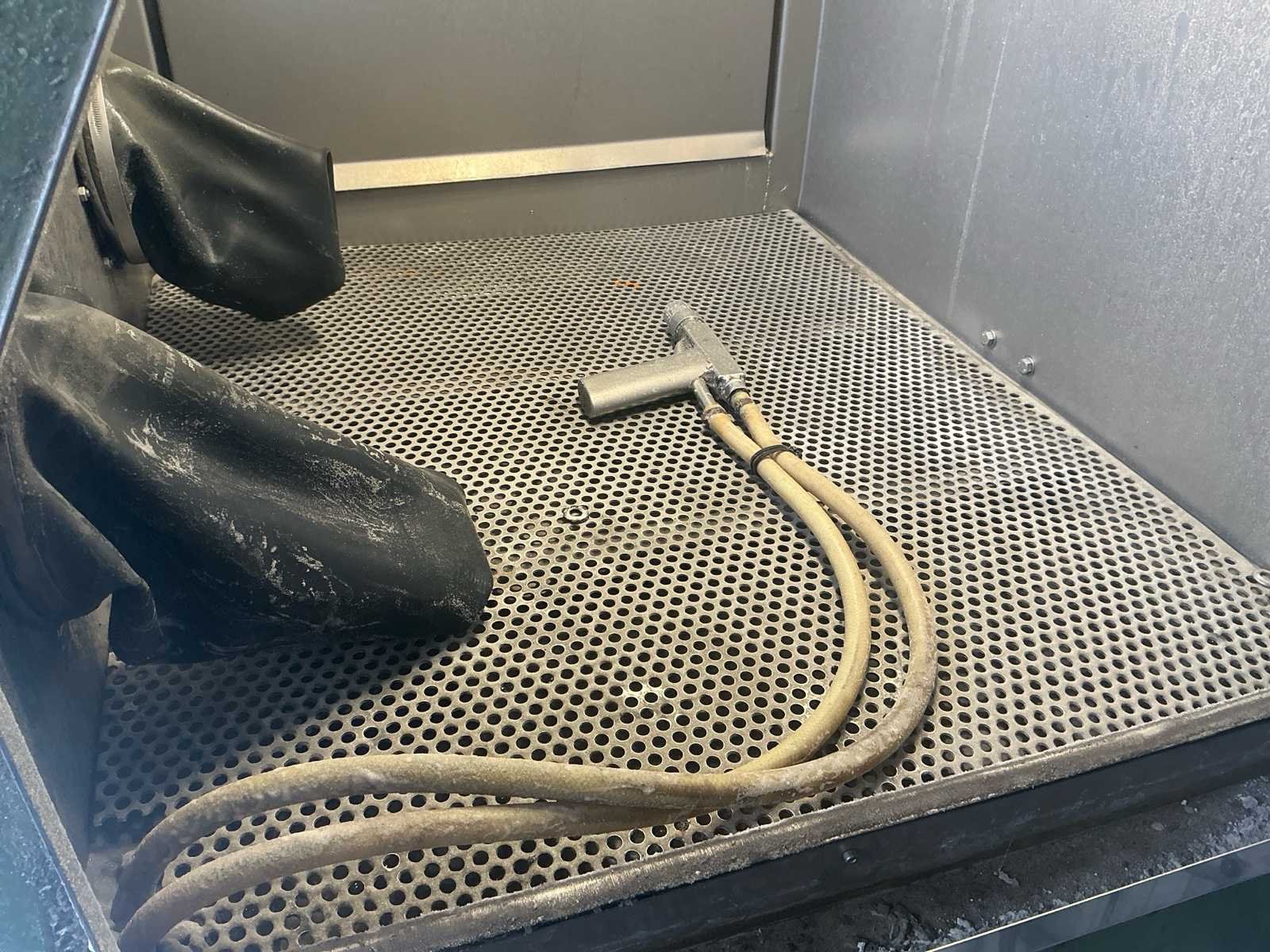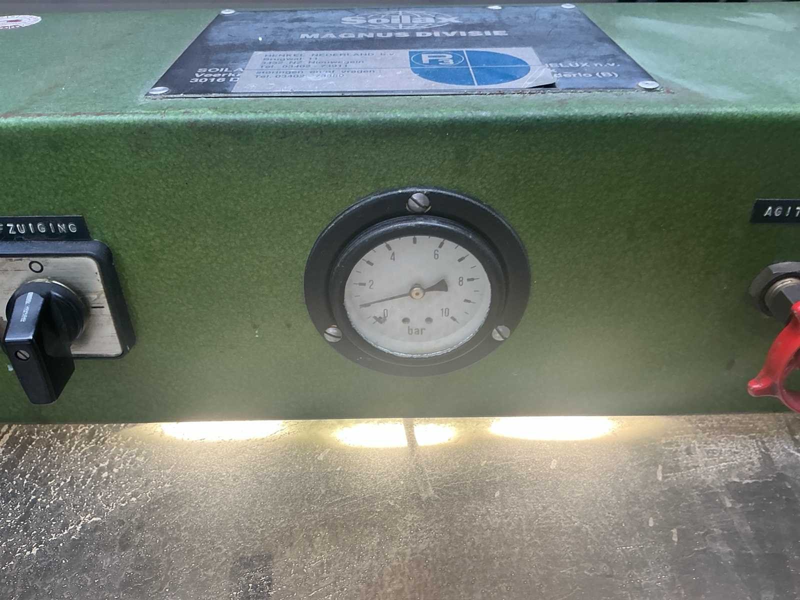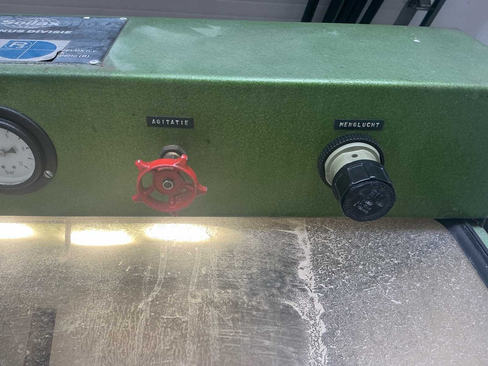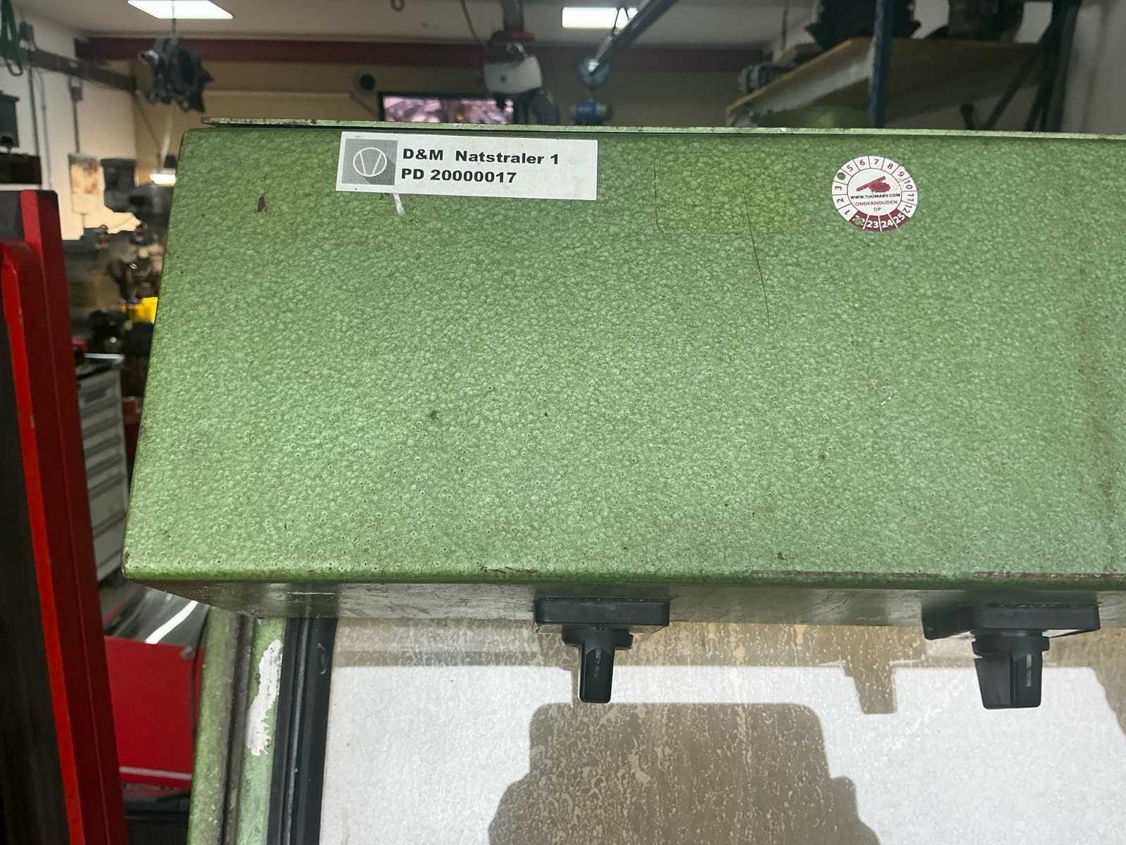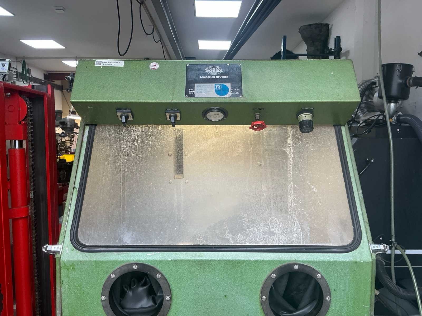 370W motor Reinigt, ontbraamt en polijst oppervlakken Werkt met water + straalmiddel onder druk Stofarm proces door gebruik van water Gelijkmatig en gecontroleerd straalbeeld Minder warmteontwikkeling op het werkstuk Geschikt voor RVS en andere gevoelige materialen Zorgt voor een meer gesloten oppervlak (minder ruw dan droogstralen) Merk: Soilax Aansluiting: 380V Totale afmeting L: 1200mm Totale afmeting Breedte: 1000mm Totale afmeting Hoogte: 2000mm