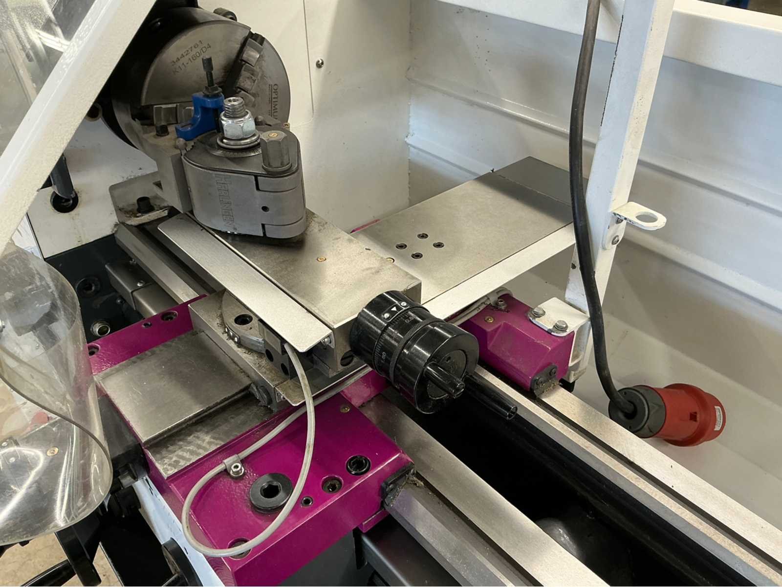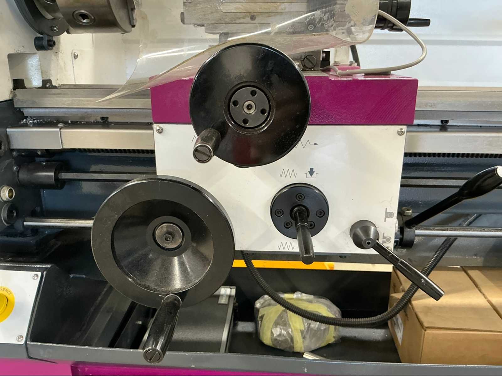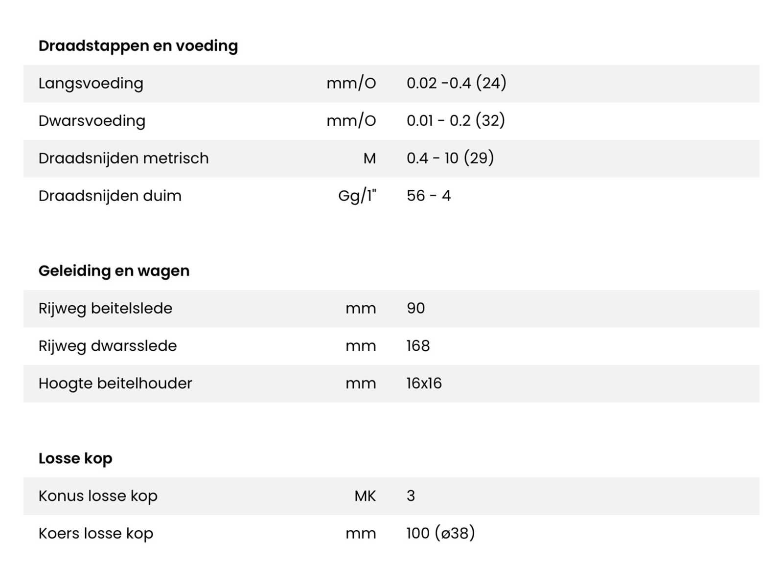 Type: OptiTurn TM3310D metaaldraaibank met digitale aflezing (3-assig) Aansluitspanning: 400 V Motorvermogen: ca. 1,5 kW Centerhoogte: 165 mm Centerafstand: 1000 mm Max. draaidiameter boven bed: ca. 330 mm Max. draaidiameter boven dwarsslede: ca. 216 mm Spilboring: 38 mm Spilopname: Camlock DIN ISO 702-2 nr. 4 Spindelconus: MK5 Toerentalbereik: ca. 65 – 2000 omw/min (9 standen) Langsvoeding: ca. 0,02 – 0,4 mm/omw Dwarsvoeding: ca. 0,01 – 0,2 mm/omw Schroefdraad snijden: metrisch en inch Verplaatsing dwarsslede: ca. 168 mm Verplaatsing bovenslede: ca. 90 mm Losse kop opname: MK3 Pinoolslag: ca. 100 mm Geleidingen: gehard en geslepen prismabed Nauwkeurigheid (spilrondloop): < 0,015 mm Afmetingen (lxbxh): ca. 1760 × 745 × 1320 mm Gewicht: ca. 470 kg Voorzien van: 1 x Kit 5-delige snelwisselhouder 1 x Draaibeitelset WP 16 mm 7dlg, 790034324 1 x Snelspan boorkop tot 16 mm 1 x Boorkopstaart 1 x Meedraaiend centerpunt verlengde punt MK 3 6 x Trildempers Merk: Optiturn Type: TM3310D Bouwjaar: 2022 Serienummer: 12312204003 Draailengte: 1000mm Aansluiting: 400V Machinegewicht: 440kg Afmeting l: 1760mm Afmeting b: 745mm Afmeting h: 1320mm