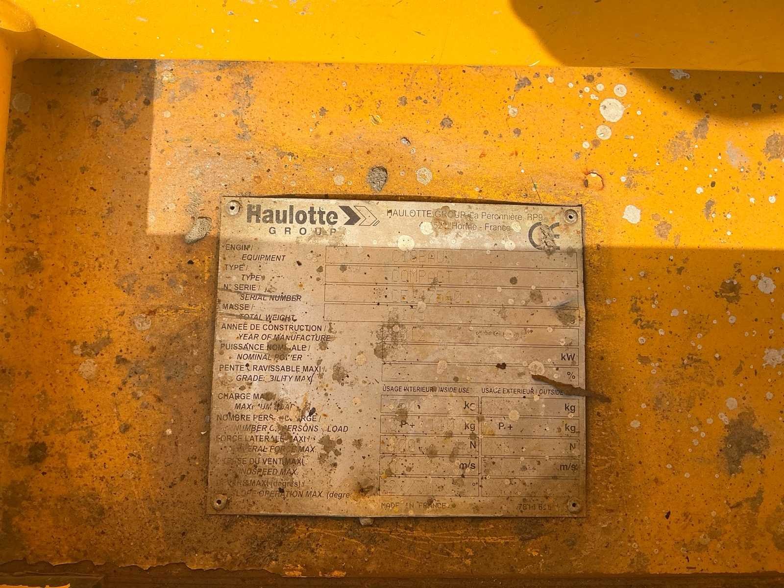 Voorzien van: 24V DC-motor, acculader met automatische stop, acculaadindicator, geïntegreerde vorkheftruckvakken, proportioneel heffen en aandrijven, 2 stuur- en aandrijfwielen voor, opklapbare handrails, massieve Non-marking banden, remontgrendeling, uitklapbare componentenbak, laadbeheersysteem in het platform, urenteller, claxon, verwijderbare bedieningskast in het platform, handmatige ventiel voor het laten zakken van het platform, werkhoogte 13,80m, platformhoogte 11,80m, platformafmetingen in (LxB) 2,74x1,20m, platformafmetingen uit (LxB) 3,22x1,20m, platformverlenging 0,92m, max. hefvermogen 350kg, max. hefvermogen uitschuifbordes 120kg, transportafm. (LxBxH) 2,49x1,20x2,50m, transporthoogte incl. hekwerk 2,50m, transporthoogte excl. hekwerk 2,08m, totaal gewicht 3.175kg. Merk: Haulotte Type: Compact 14 Bouwjaar: 2012 Serienummer: CE147560 Elektrisch: true Schaarhoogwerker: true Werkhoogte: 13800mm Plateau afm. l: 2740mm Plateau afm. b: 1200mm Platform capaciteit: 350kg Accu lader: true Afgelezen urenstand: 817 Eigen gewicht: 3175kg Totale afmeting L: 2490mm Totale afmeting Breedte: 1200mm Totale afmeting Hoogte: 2500mm