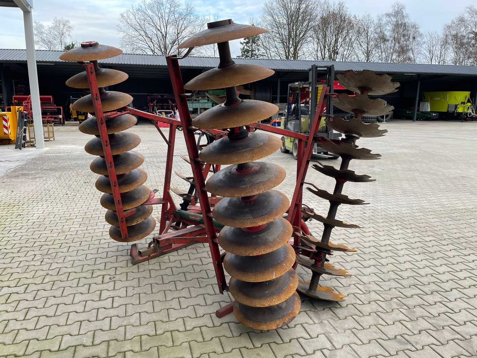 Voorzien van: Kverneland, hydraulisch opklapbaar, 4mtr, schijveneg / disc harrow, gedragen (3-punts ophanging), zware staalconstructie, gekartelde schijven 20 stuks, gladde schijven 18 stuks, totaal aantal schijven: 38 stuks, transportbreedte: ca. 2,5 meter, hoogte (ingeklapt): ca. 2,5 – 3,0 meter. Merk: Kverneland Werkbreedte: 4000mm Totale afmeting Breedte: 2500mm Totale afmeting Hoogte: 2800mm