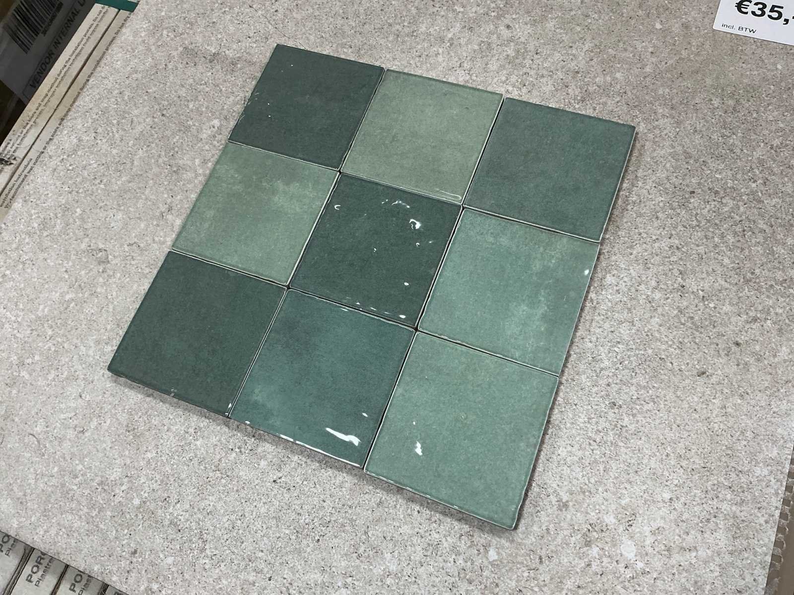 Merk: Sanoro Kleur: Groen Afwerking: Handvorm Lengte: 10cm Breedte: 10cm Dikte: 85mm Materiaal: Porselein Aantal m² per verpakking: 10m² Aantal pakken: 1 Totaal oppervlakte: 10m² Totaal gewicht: 200kg