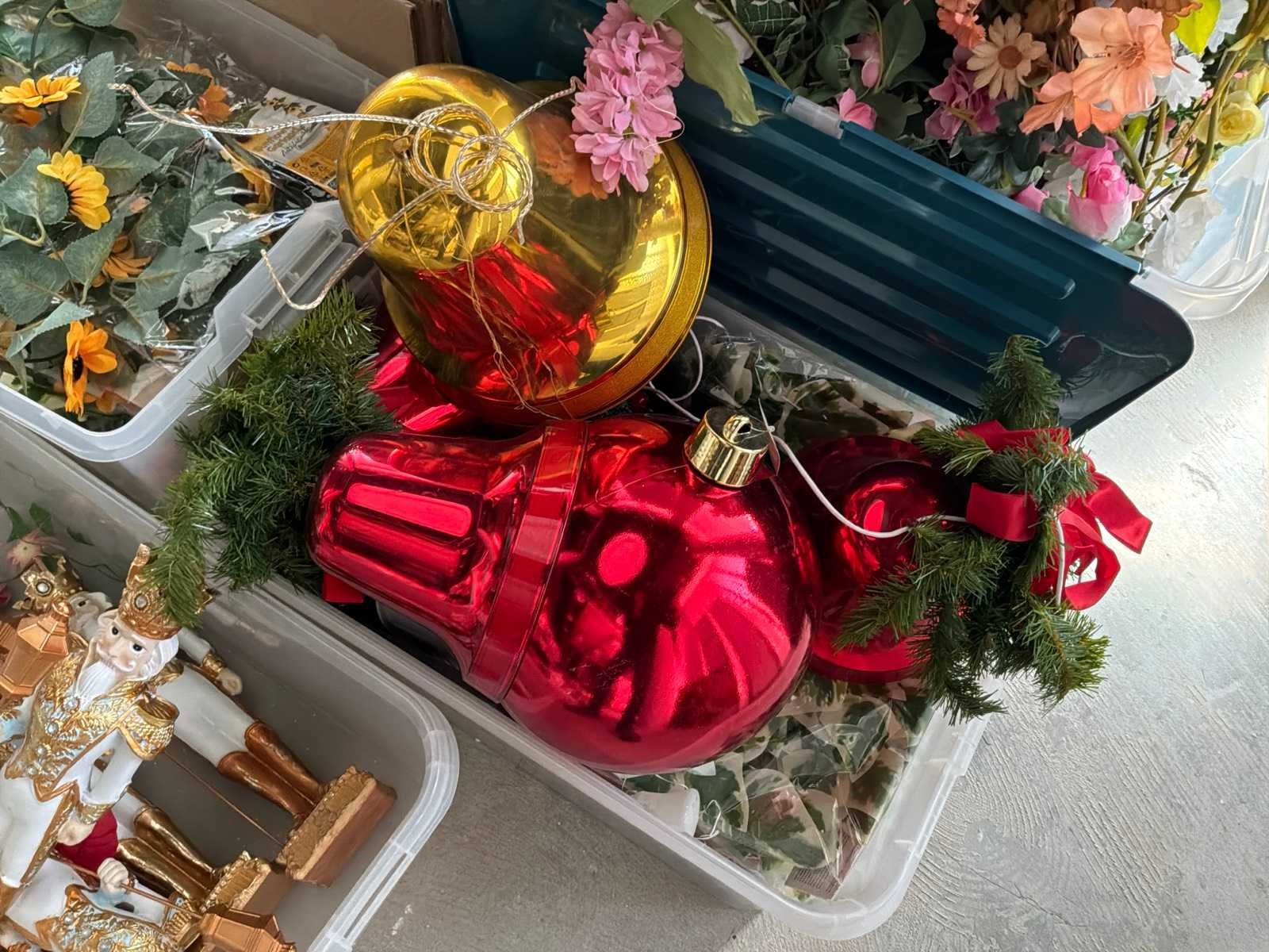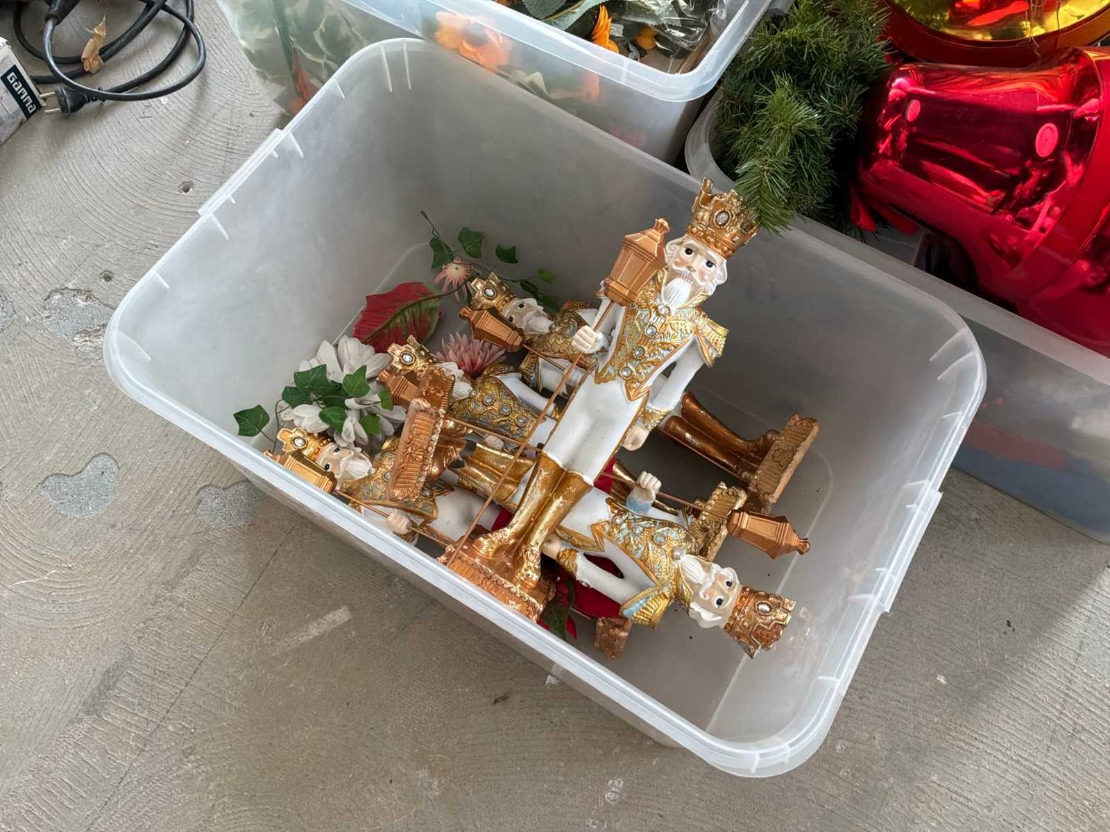 Bestaande uit; 4 bakken sierbloemen en kerstversiering, 1 bak met notenkrakerfiguren.