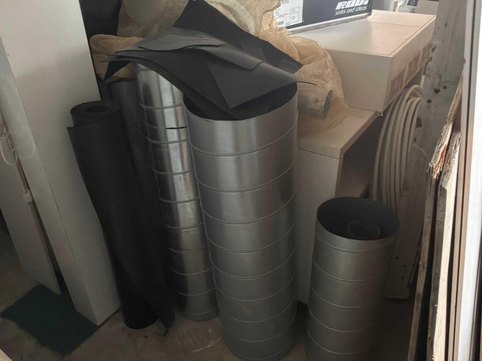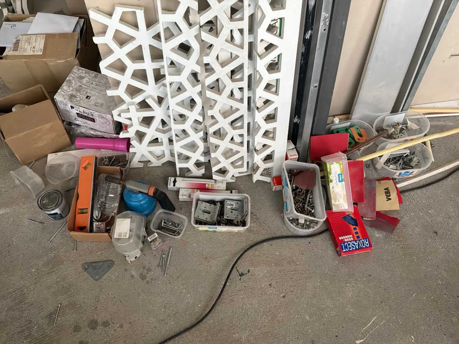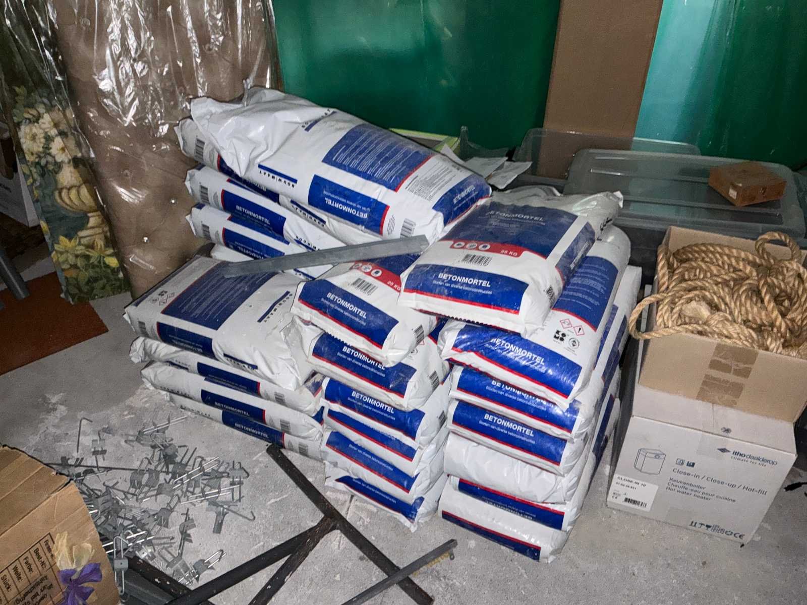 Bestaande uit: metalen profielen, stangen, zakken betonmortel, bevestigingsmaterialen, beugels, houten planken, panelen, dozen met gereedschap, onderdelen, kratten met kabels, klein materiaal, lampen, armaturen, diverse overige bouwmaterialen.