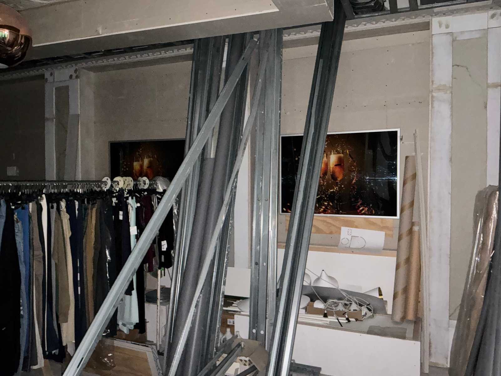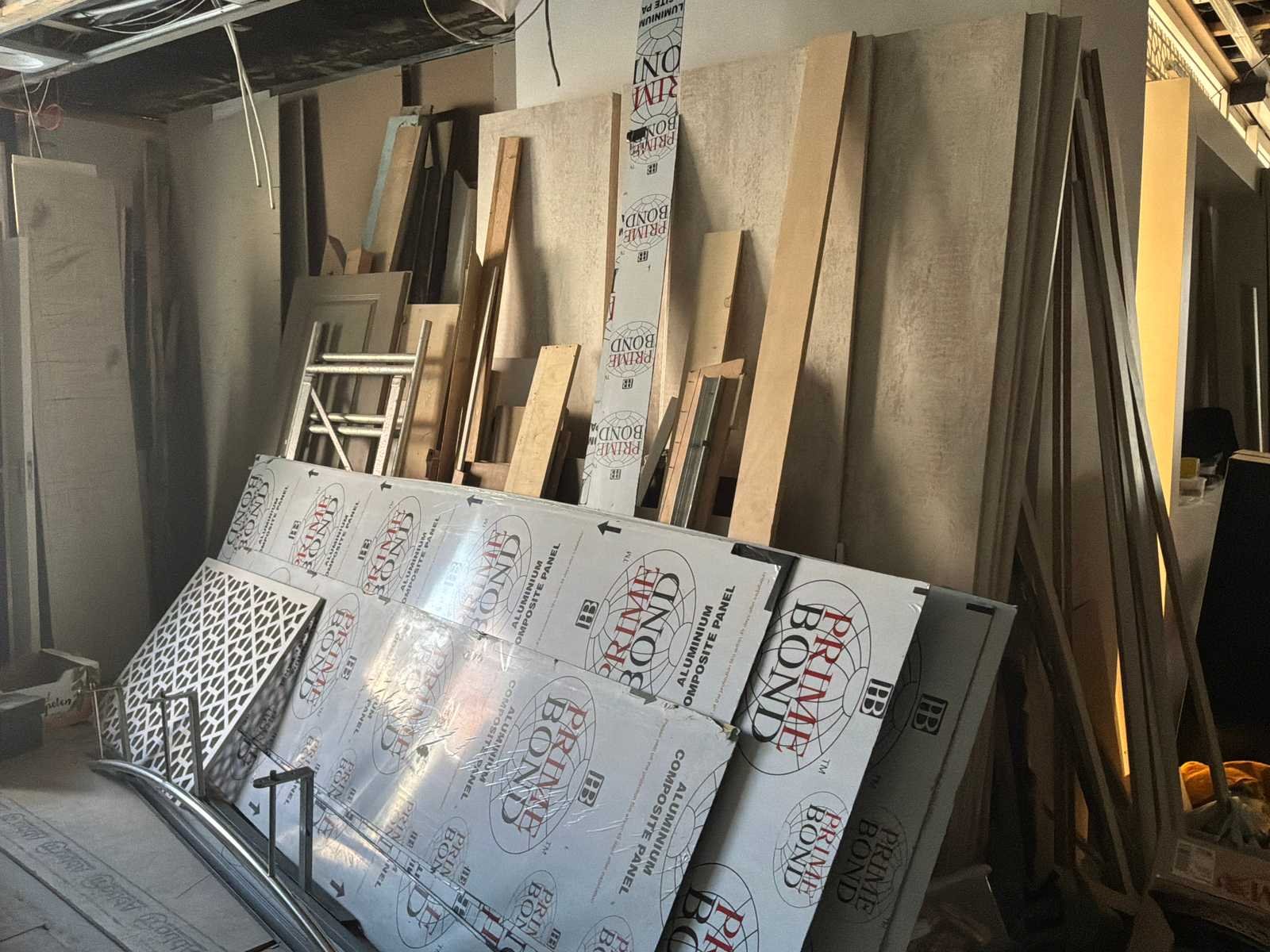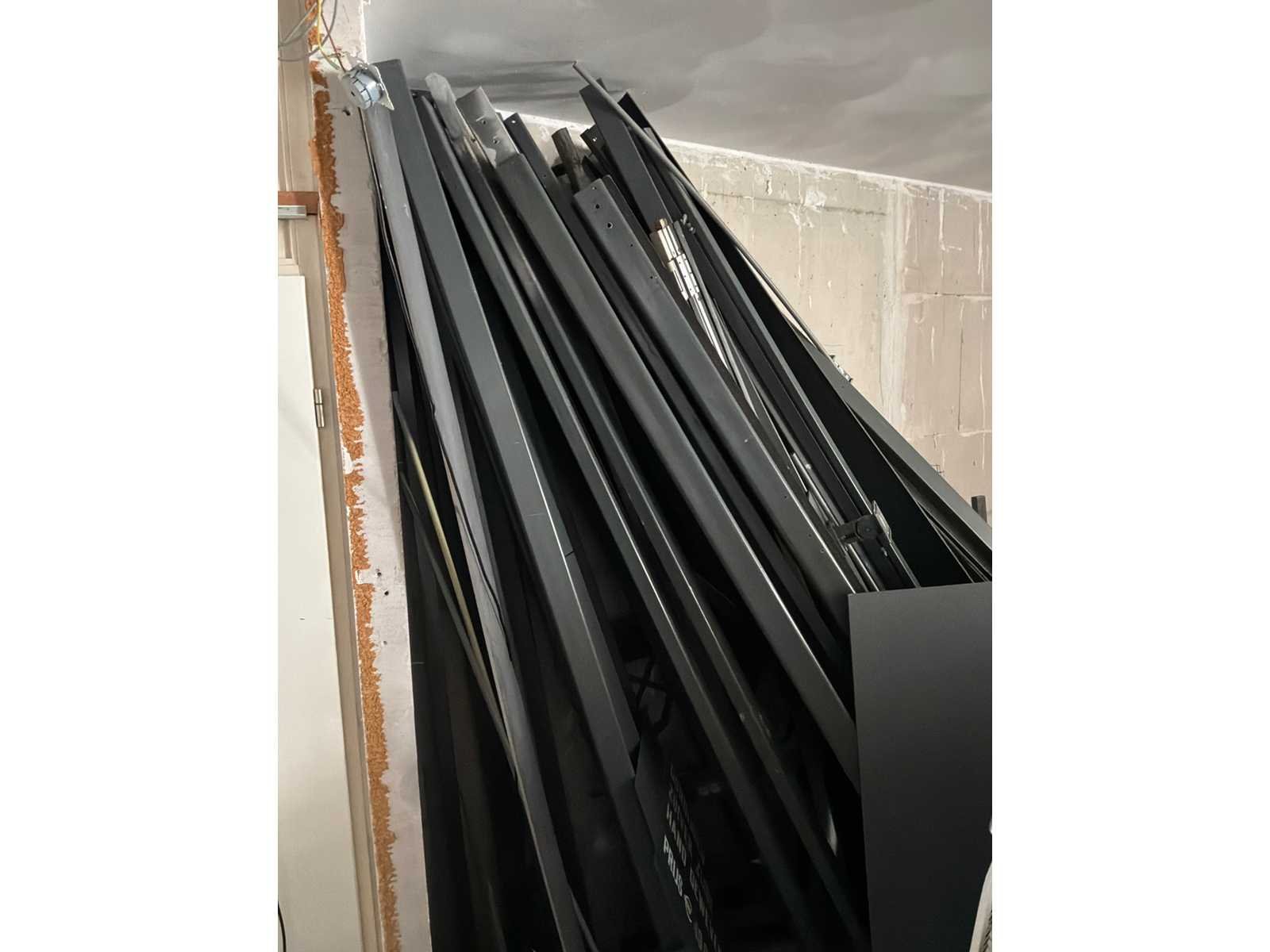 Bestaande uit: metalen profielen, stangen, zakken betonmortel, bevestigingsmaterialen, beugels, houten planken, panelen, dozen met gereedschap, onderdelen, kratten met kabels, klein materiaal, lampen, armaturen, diverse overige bouwmaterialen.