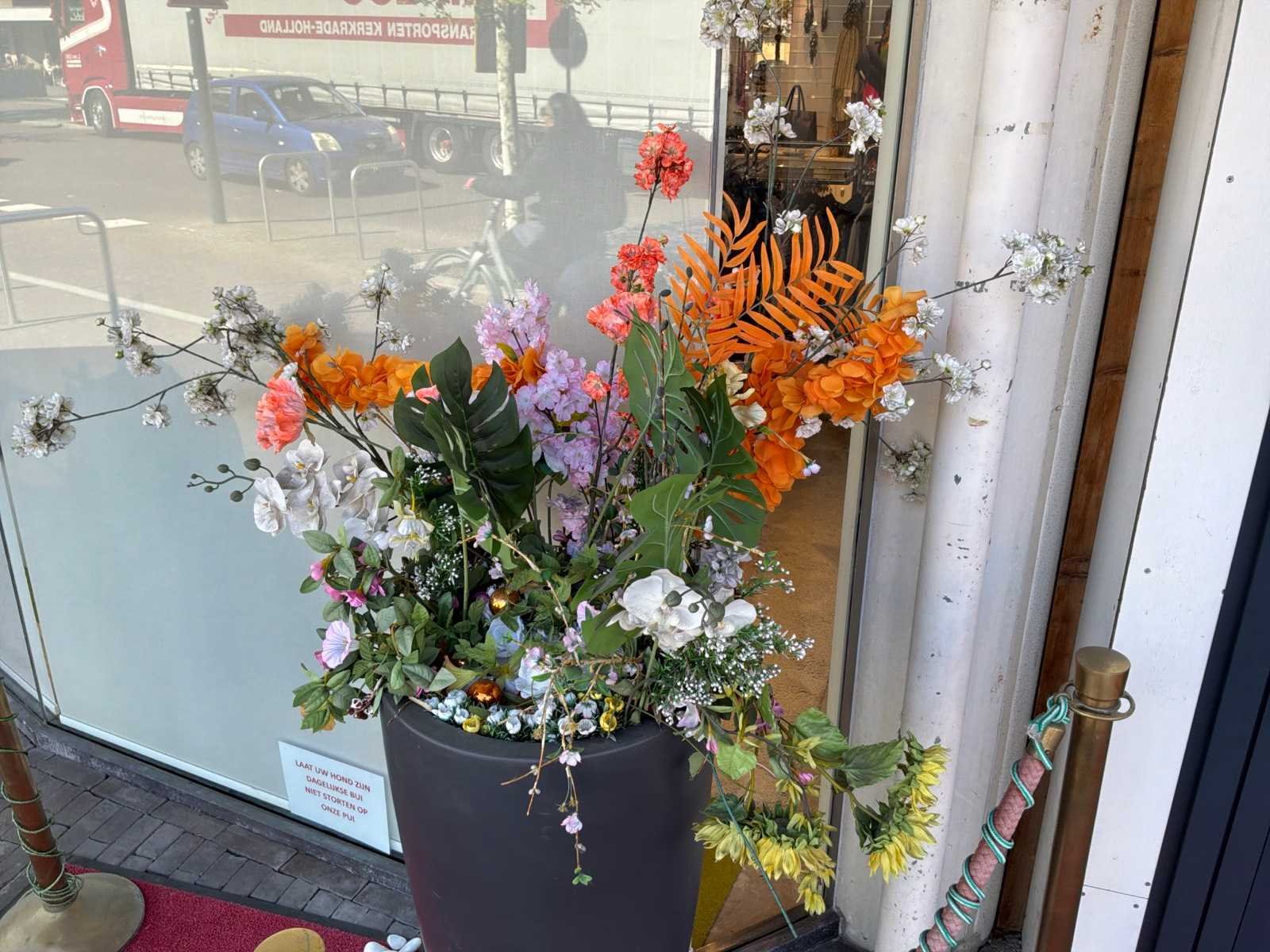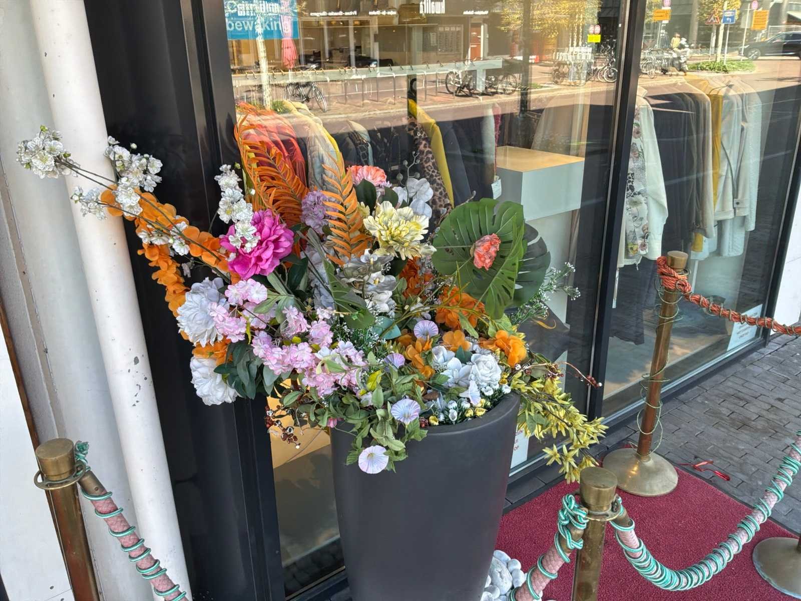 Bestaande uit: 2 vazen met kunstbloemen,sierstenen,afzetpalen met sierkoort, rode loper.