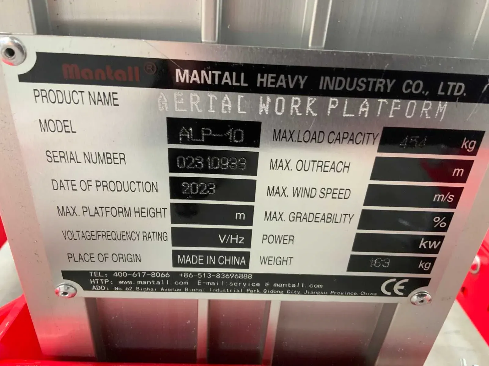 Plateau 590x715mm; hoogte tot 3480mm; telescopische mast; zwenkwielen; 5840 Merk: Mantall Type: ALP-10 Bouwjaar: 2023 Max. belasting: 454kg Minimale doorrijhoogte: 2050mm Handbediend: true Totale afmeting Lengte: 2200mm Totale afmeting Breedte: 2000mm Totale afmeting Hoogte: 2050mm