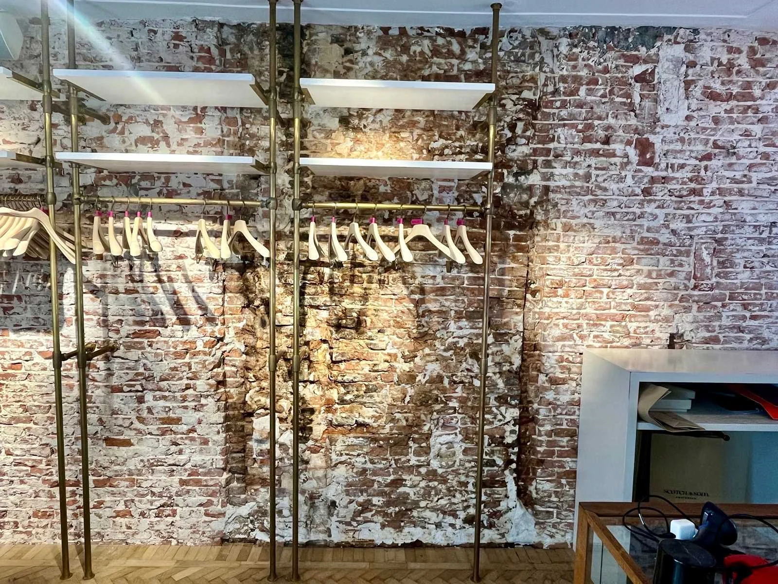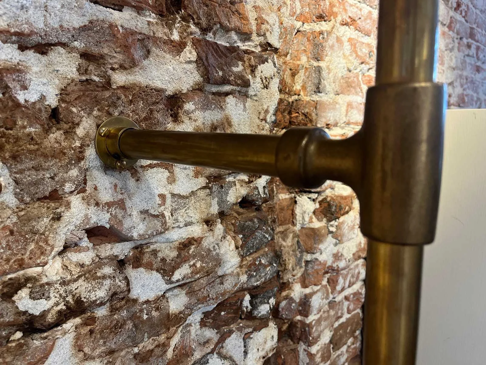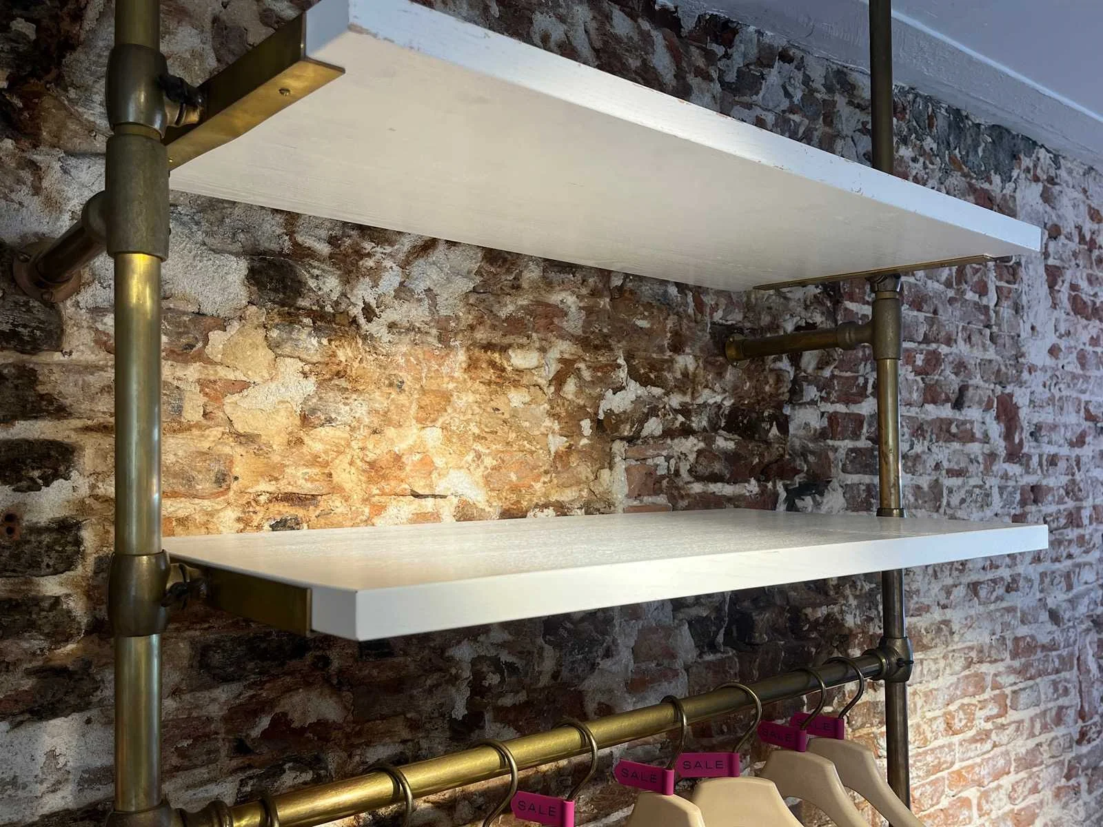 Dit wandrek is op de op de vloer, aan de wand en op het plafond geschroefd. 2 Staanders voorzien van 2 houten legborden met afmeting 740x400 mm .