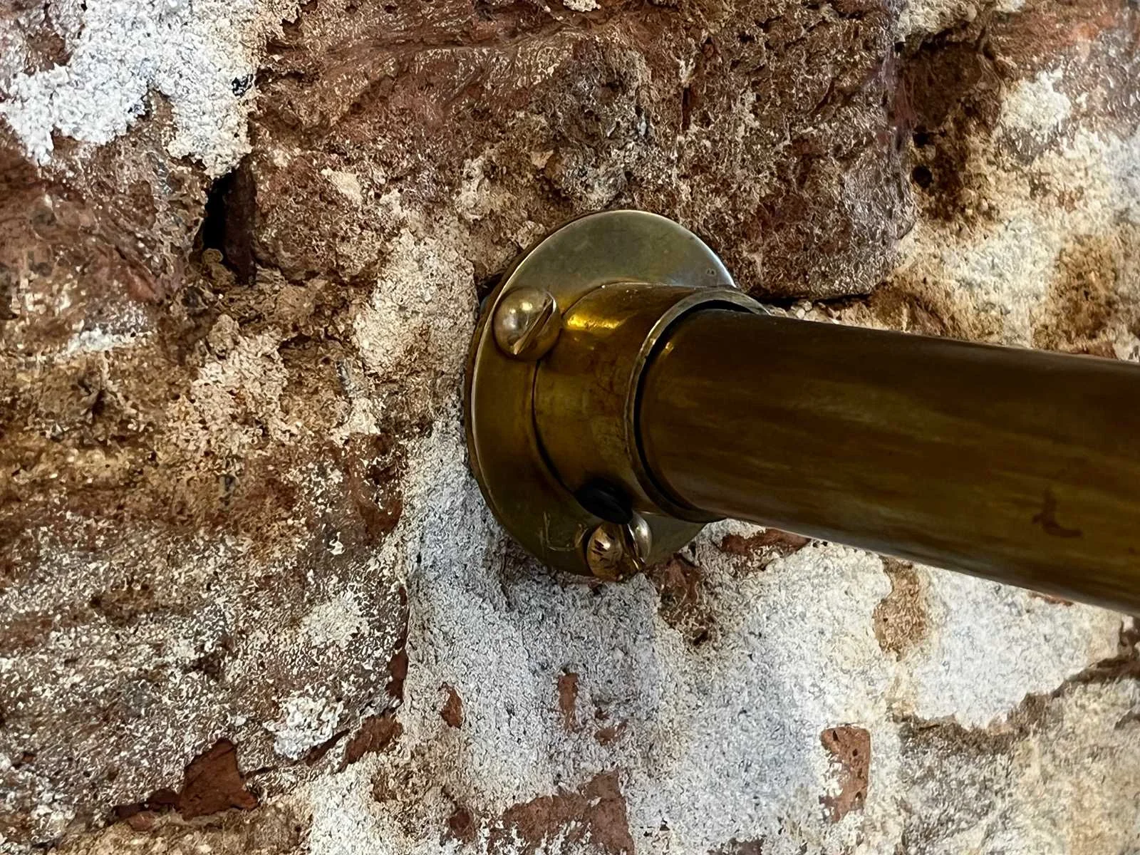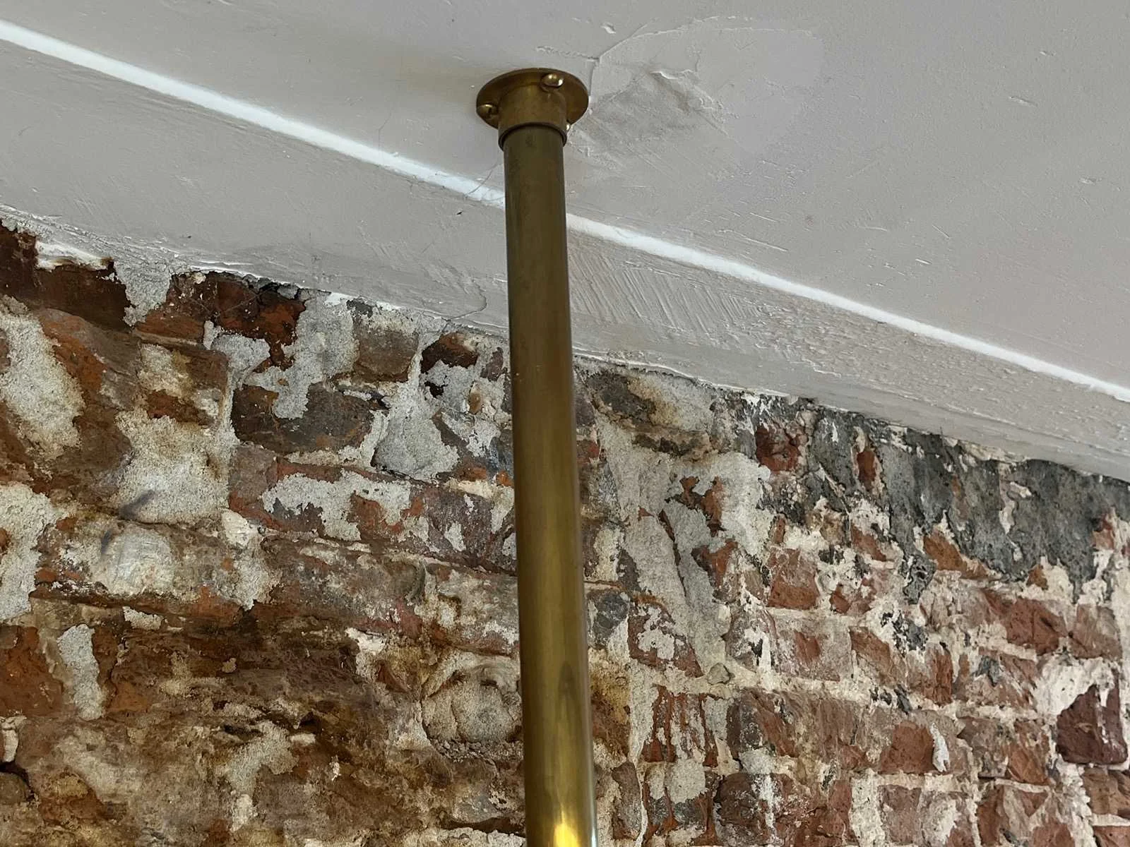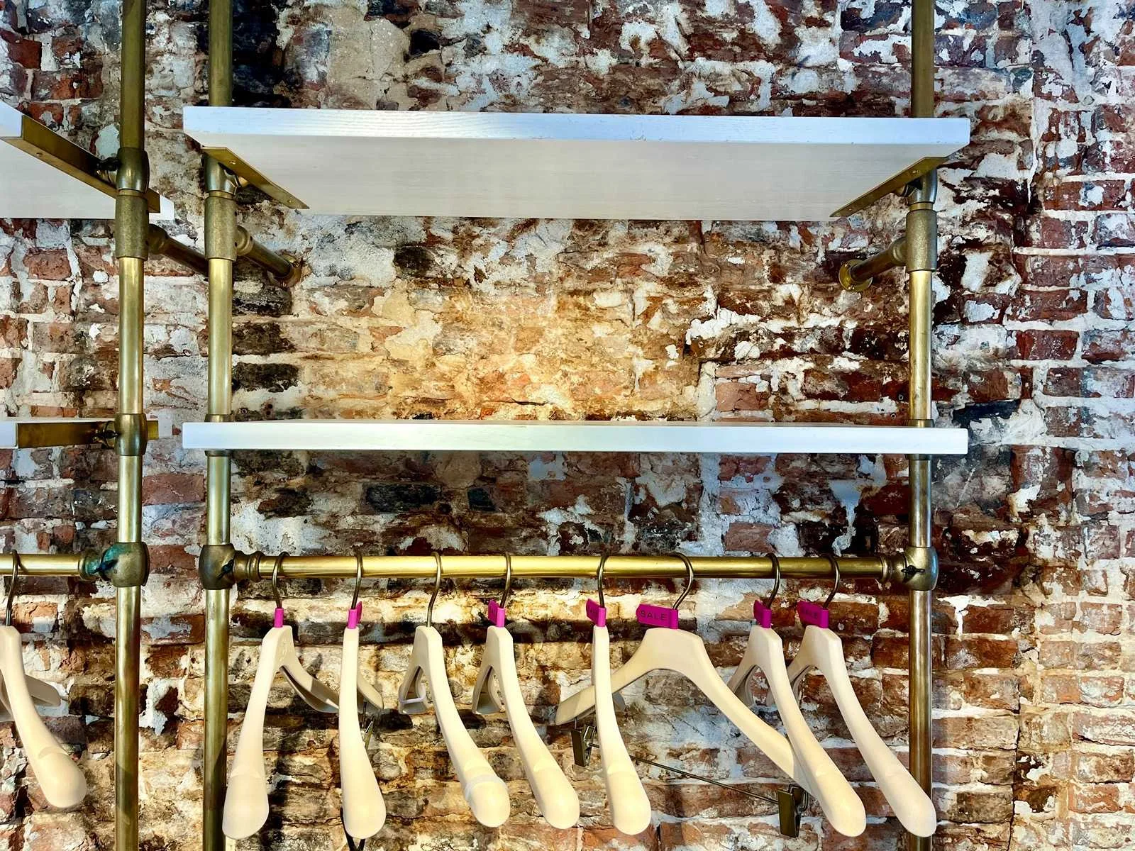 Dit wandrek is op de op de vloer, aan de wand en op het plafond geschroefd. 2 Staanders voorzien van 2 houten legborden met afmeting 740x400 mm .