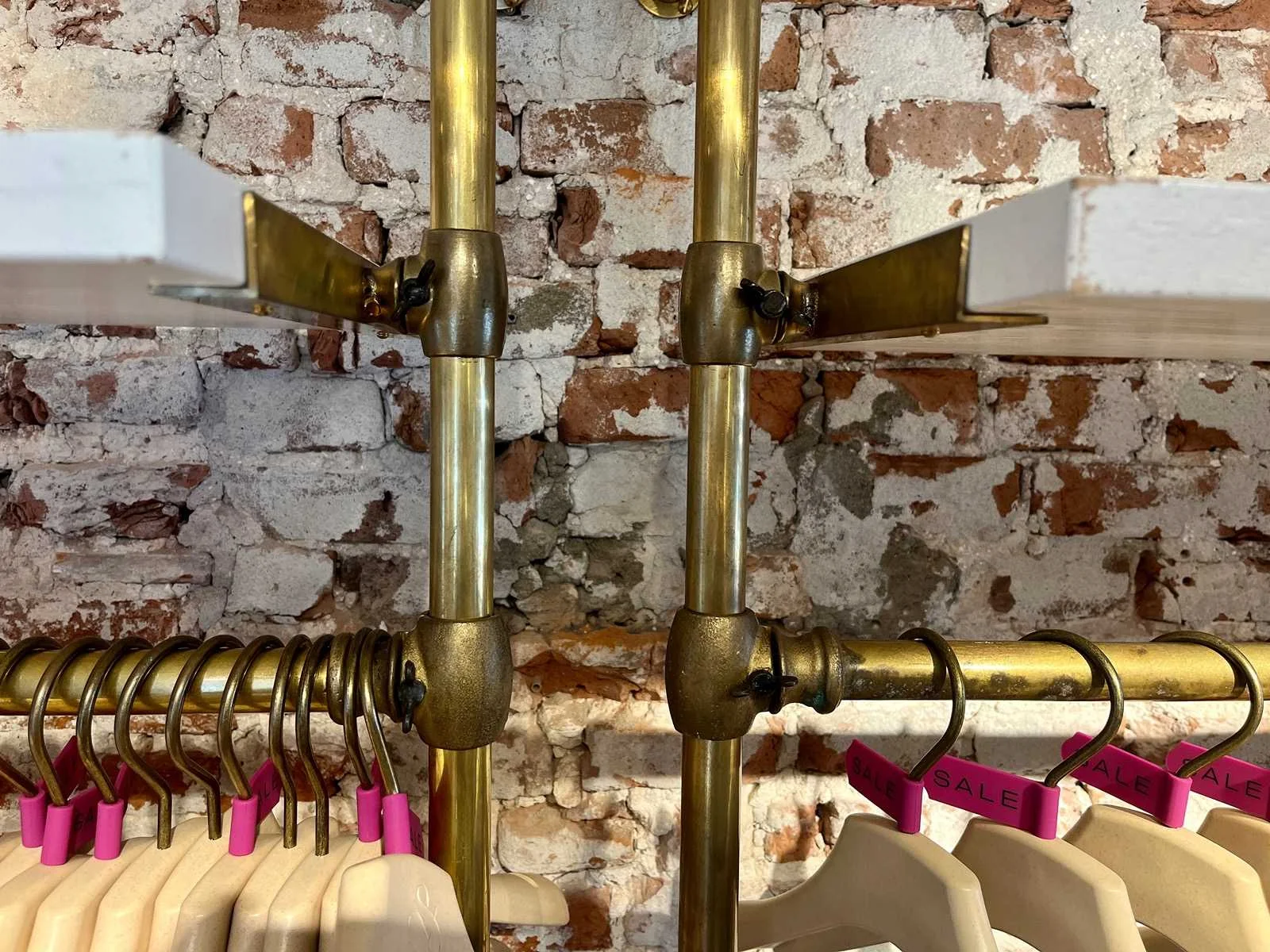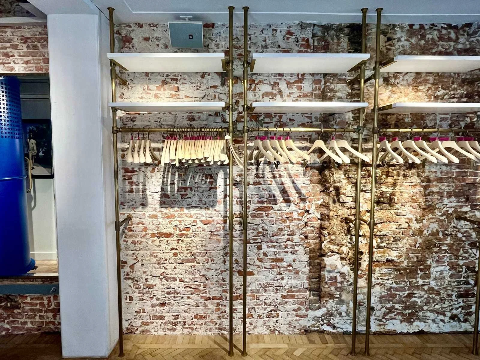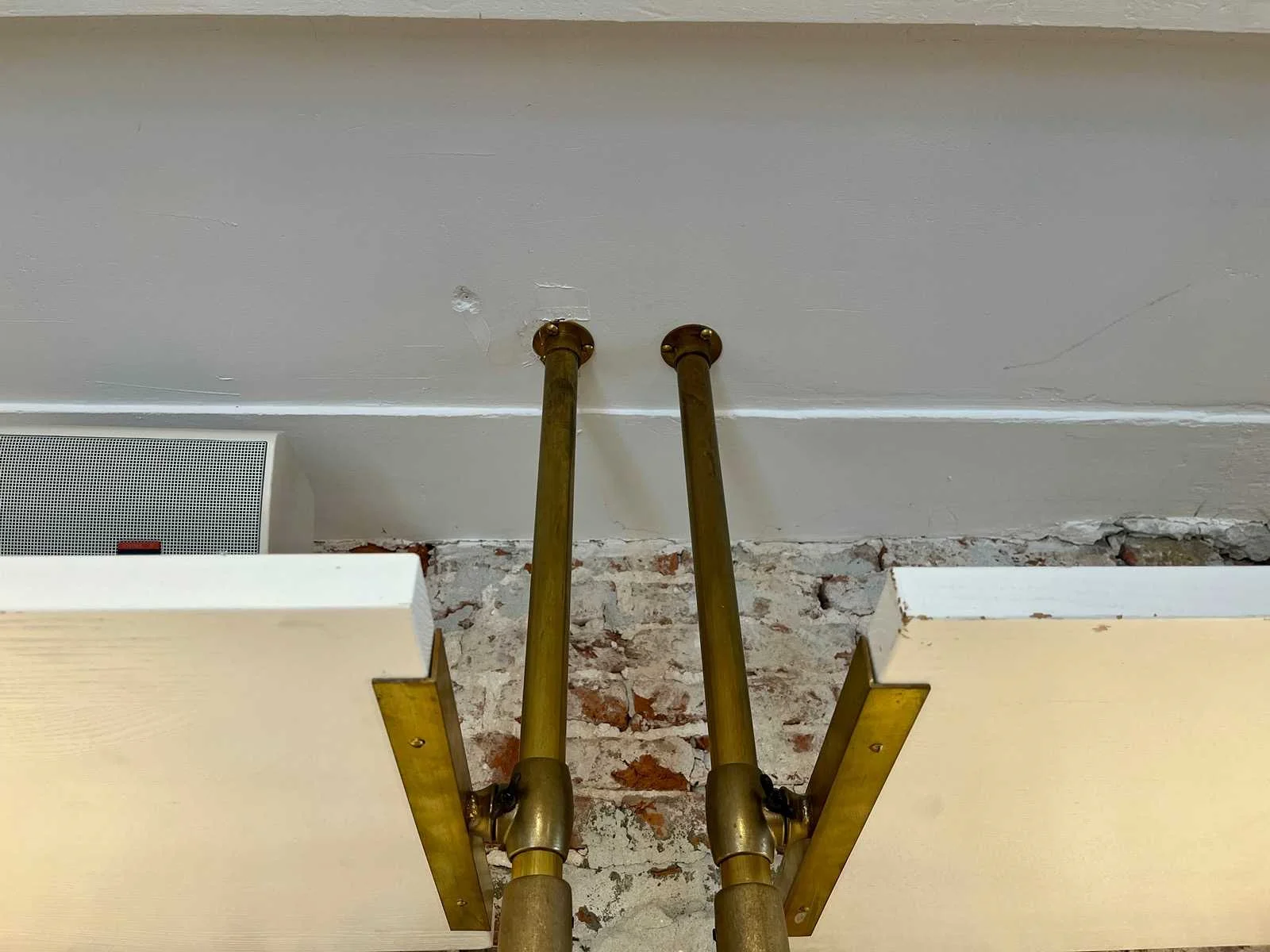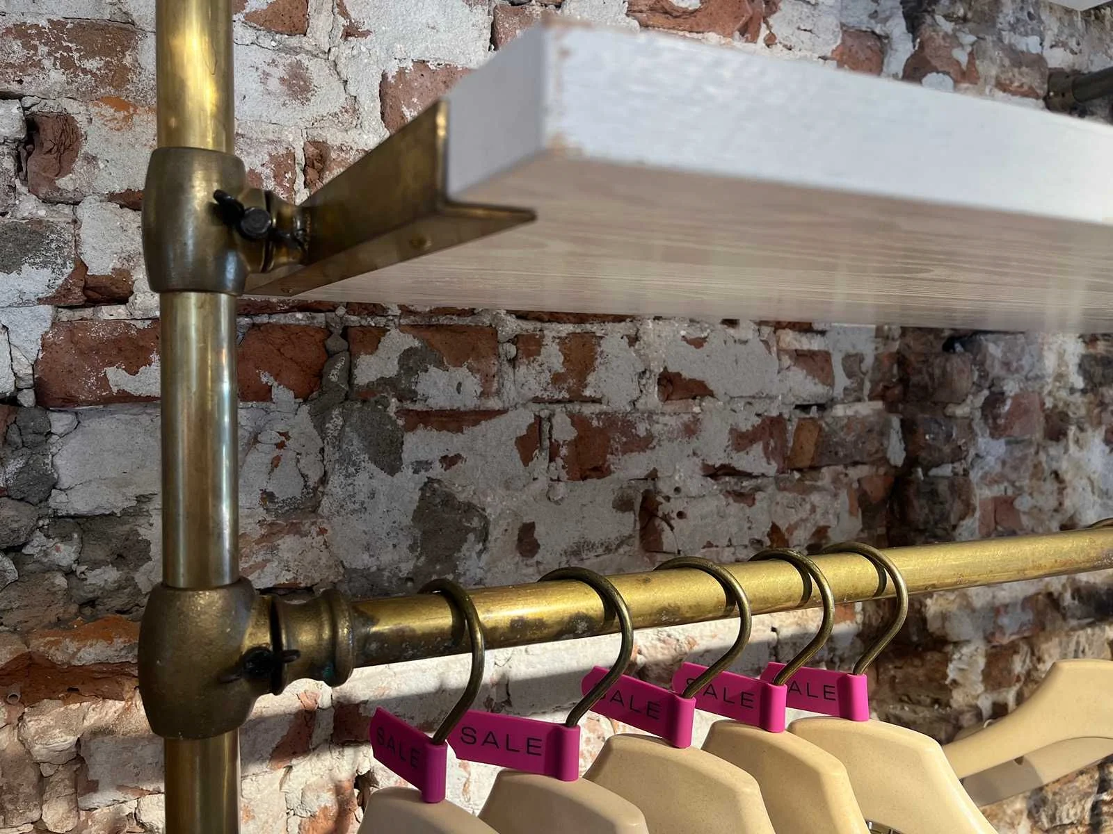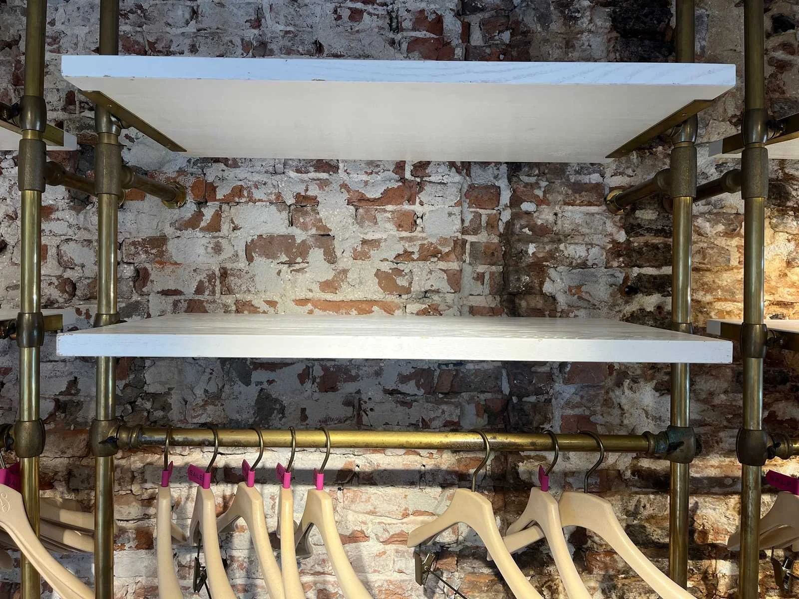 Dit wandrek is op de op de vloer, aan de wand en op het plafond geschroefd. In totaal 4 Staanders voorzien van 4 houten legborden met afmeting 740x400 mm .