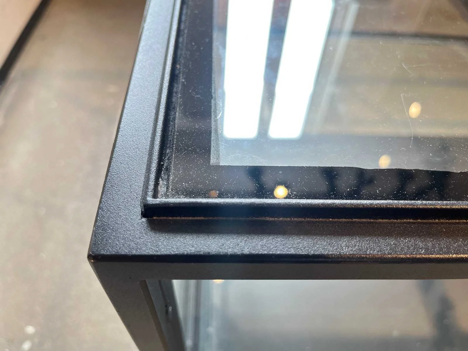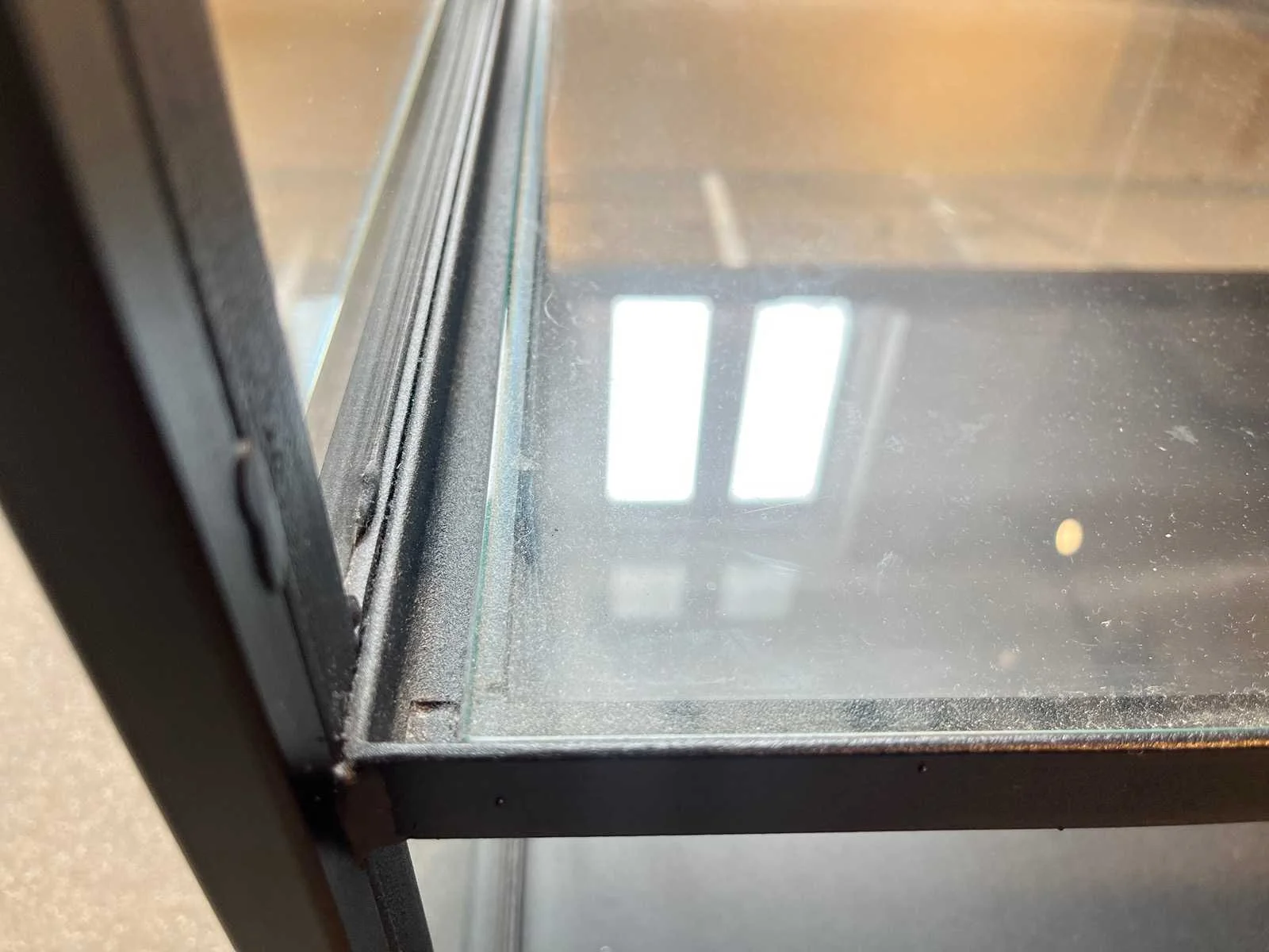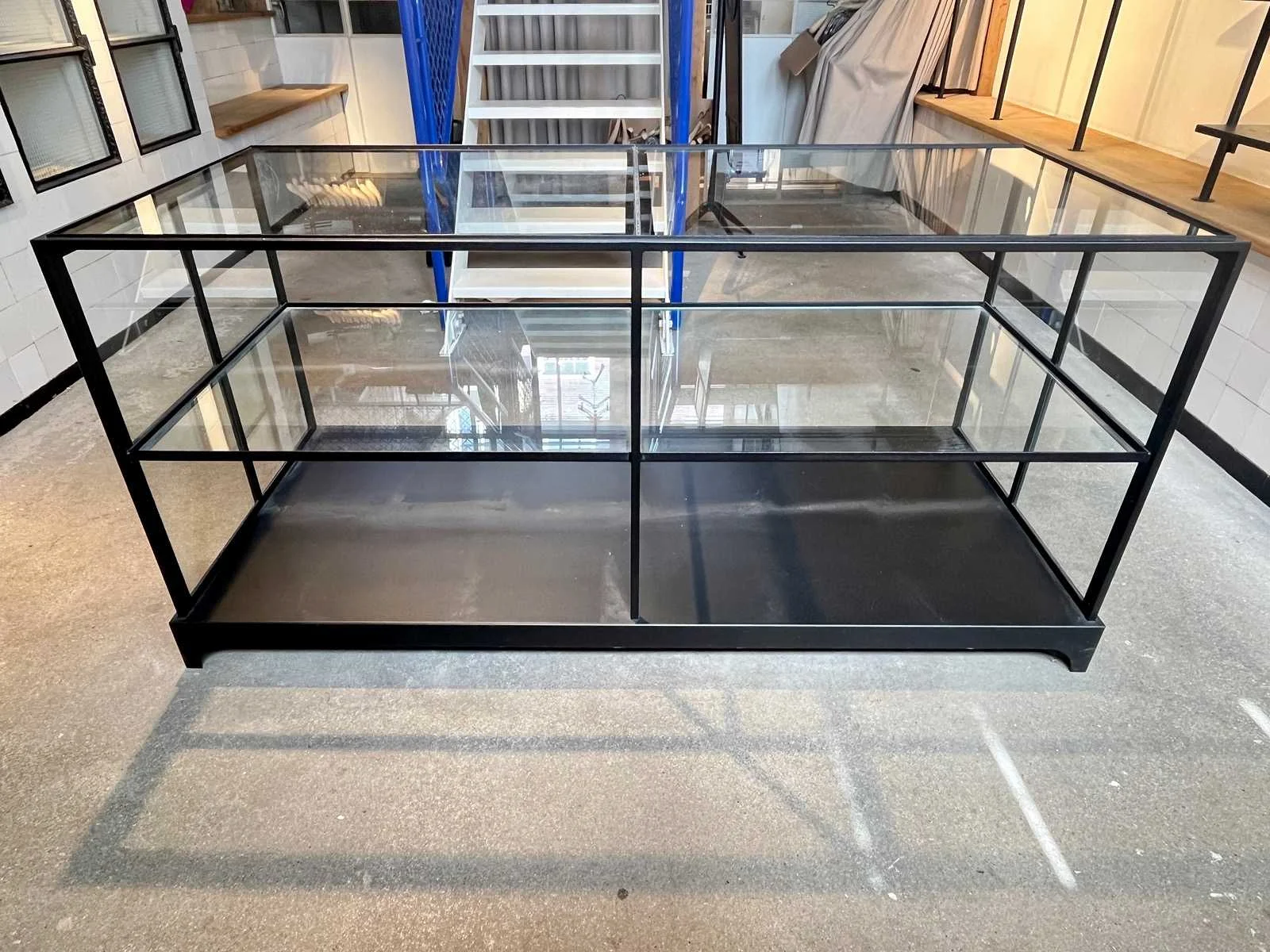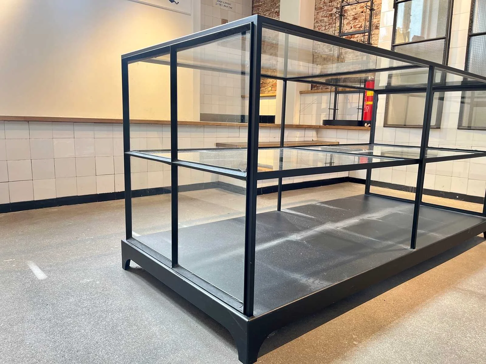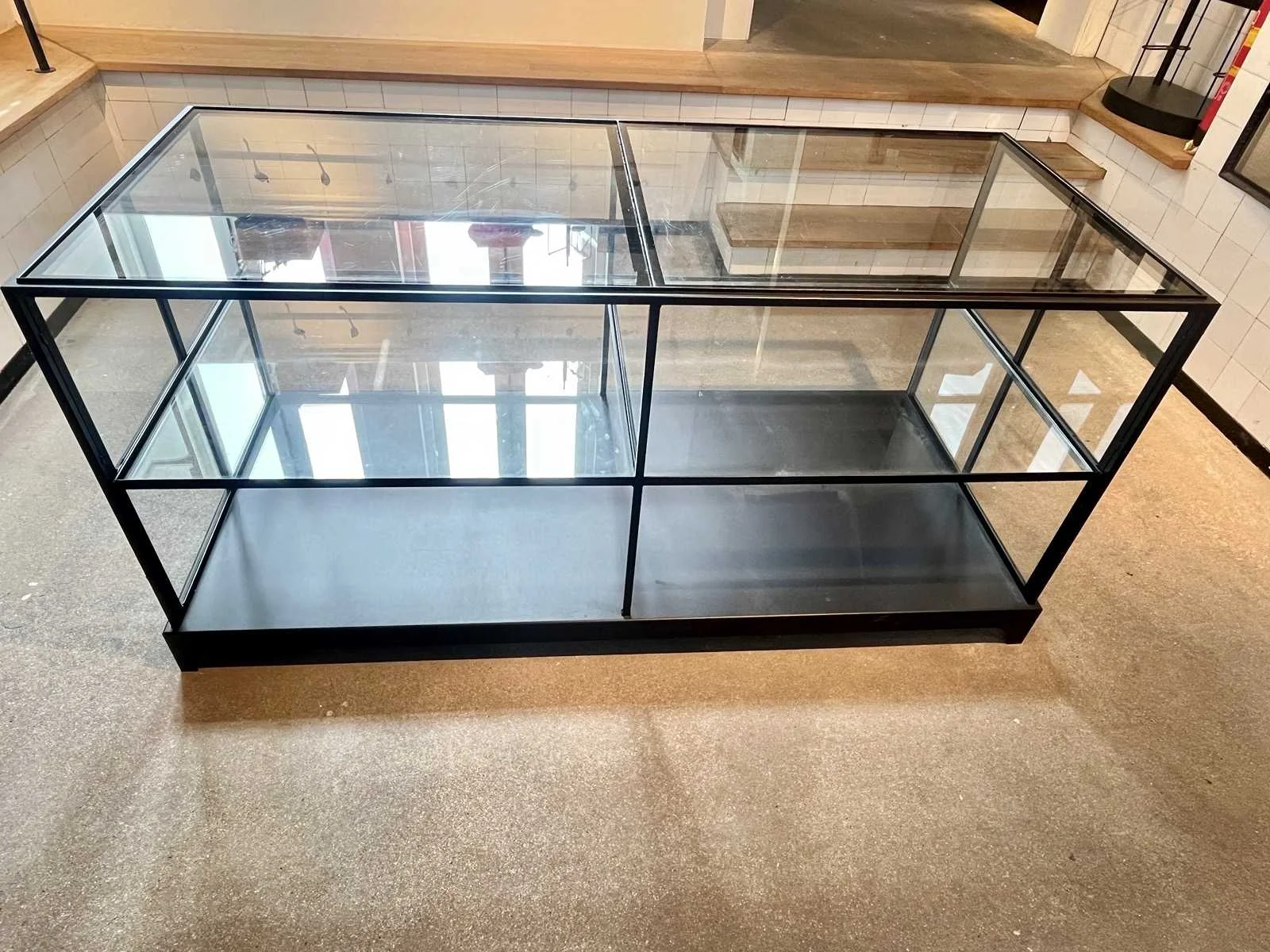 Dit losstaande meubel heeft een stalen frame en glasplaten. Zoals zichtbaar op de foto's zitten hier een aantal krassen op. Totale afmeting Lengte: 1170mm Totale afmeting Breedte: 770mm Totale afmeting Hoogte: 850mm