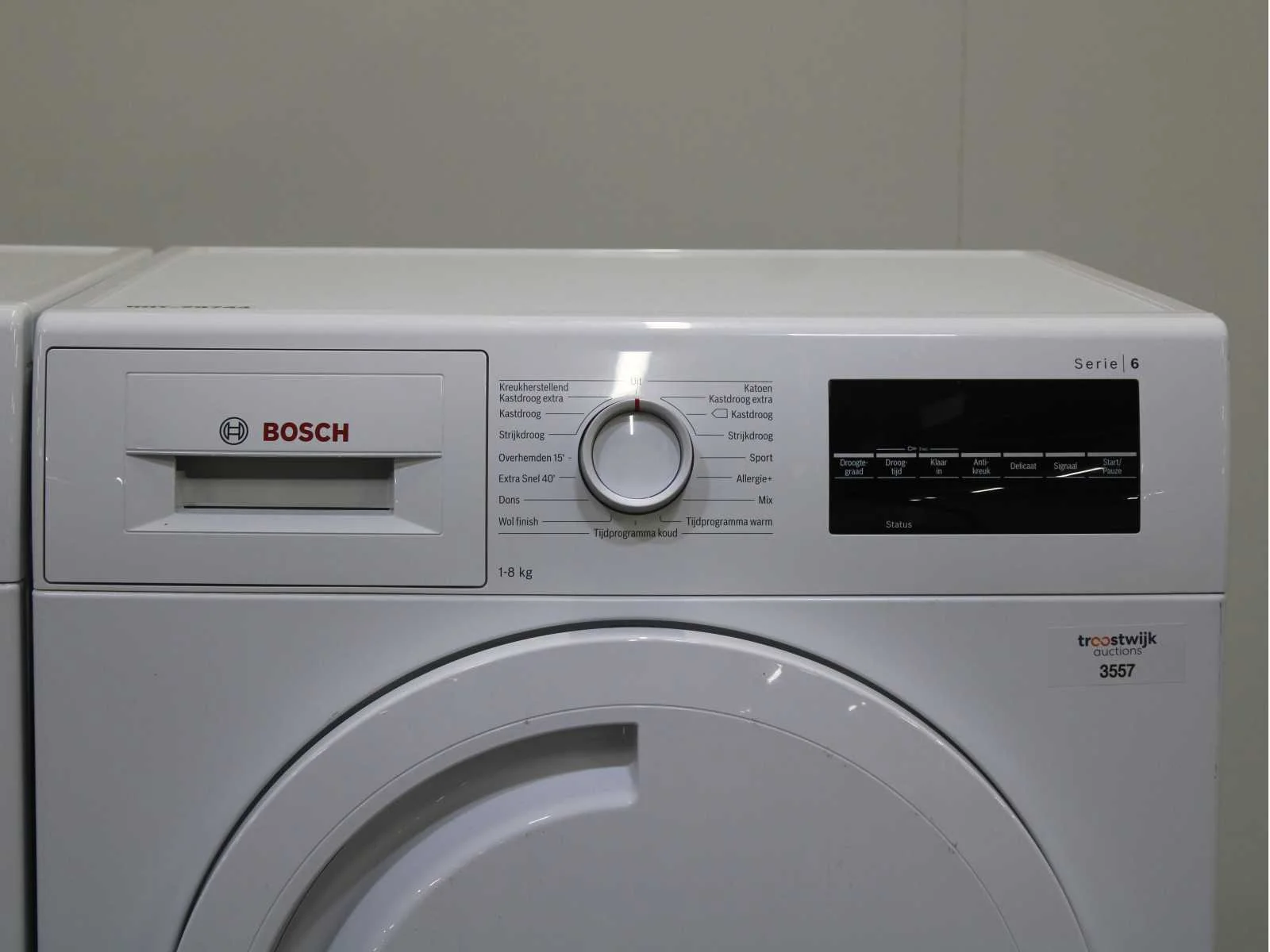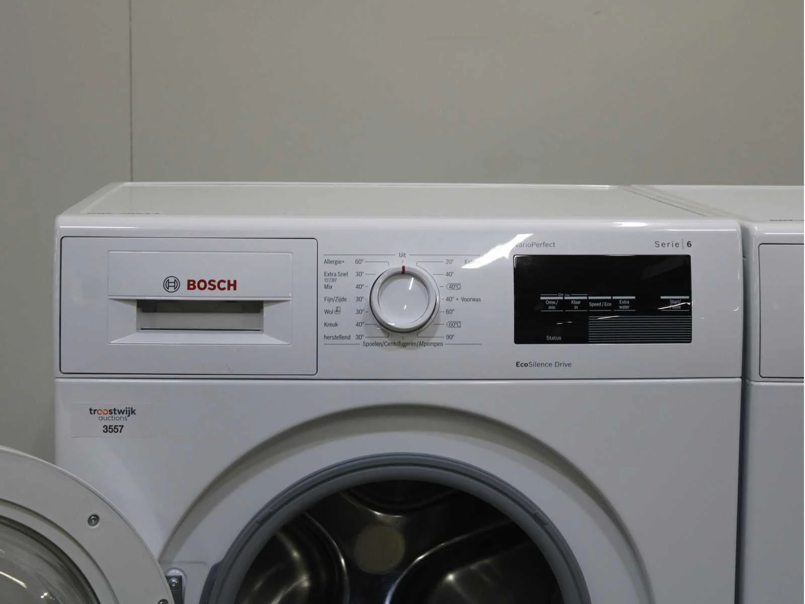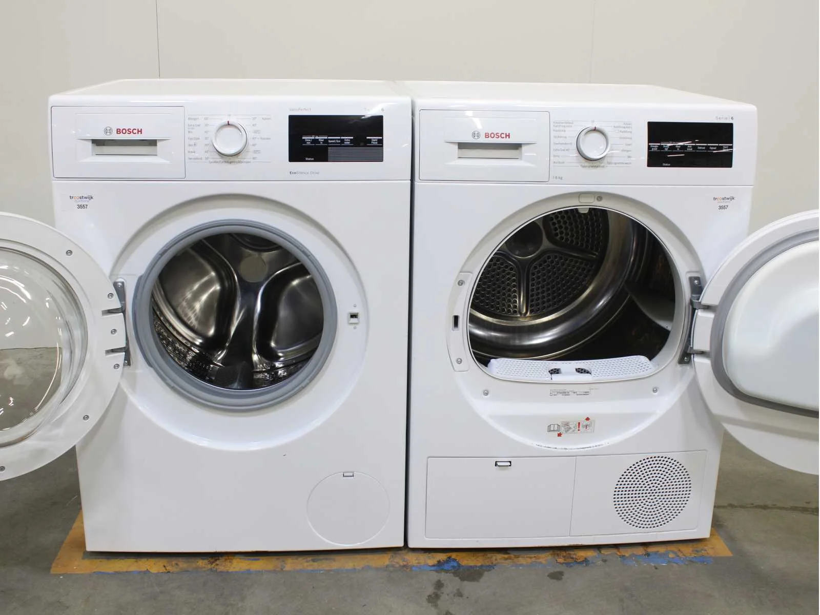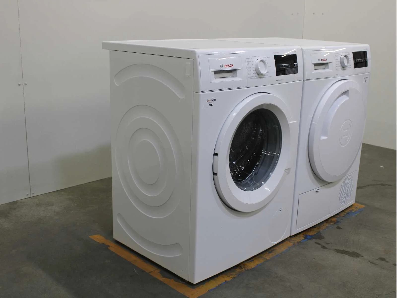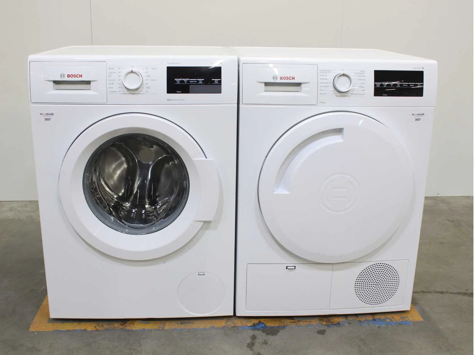 Deze wasmachine en wasdroger komen uit een partij jong gebruikt A-Merk witgoed. De machines zijn volledig getest, gereinigd en indien nodig gerepareerd. Houdt er rekening mee dat de machines lichte gebruikssporen kunnen hebben. Wasmachines en wasdrogers hebben vaak standaard afmetingen. Hoogte 85cm, Breedte 60cm en Diepte 60 tot 70cm, incl. uitstekende slangen e.d. aan de achterzijde. Als de machine vrij komt te staan is de afmeting minder relevant. Wil je de machine in een nis plaatsen of inbouwen? Controleer dan de exacte afmetingen op basis van het aangeboden merk en model/type. Within 7 days Merk: Bosch Model: WAT28321NL/18 9711 02996 en WTG86400NL/04 FD 9612 2 00025 Serienummer: WAT28321NL en WTG86400NL