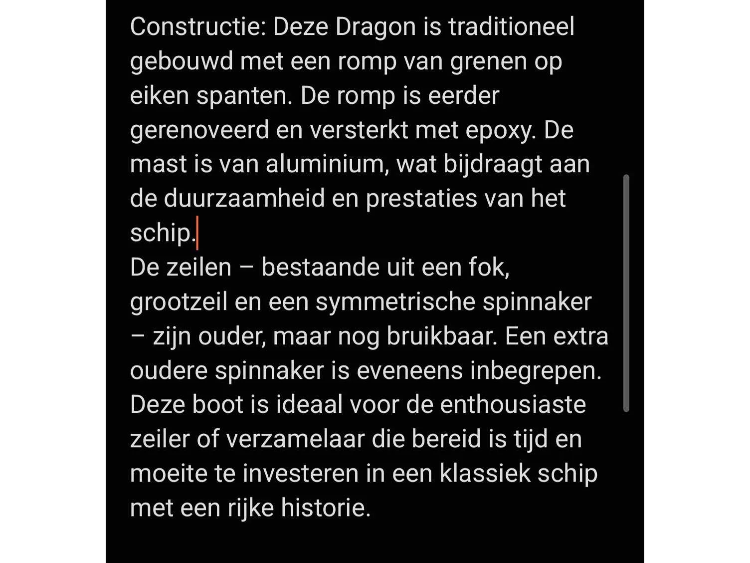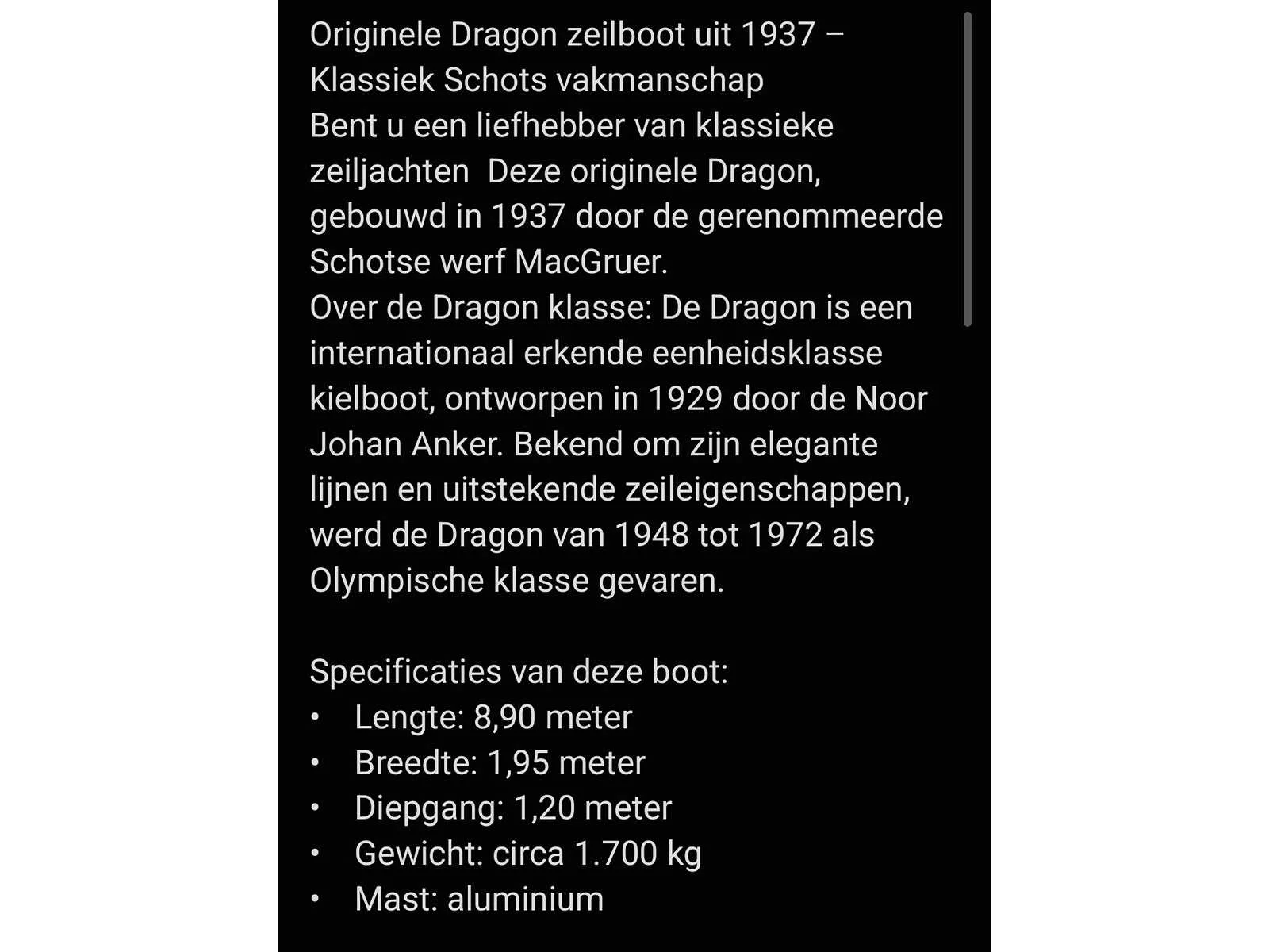 Klassieke zeilboot, epoxy: polyester-grenen-eiken. Inclusief zeilen. Aluminium mast. Kan geladen / getransporteerd worden binnen de Benelux tegen betaling. Afmetingen zijn +/- Merk: Dragon Werf: MacGruer Rompmateriaal: Epoxy Diepgang: 1.2m Bouwjaar: 1937 Gewicht: 1700kg Lengte: 8.9m Breedte: 195m
