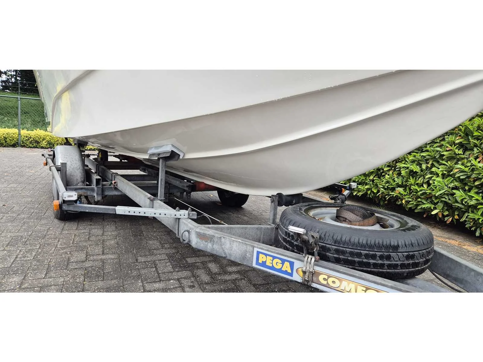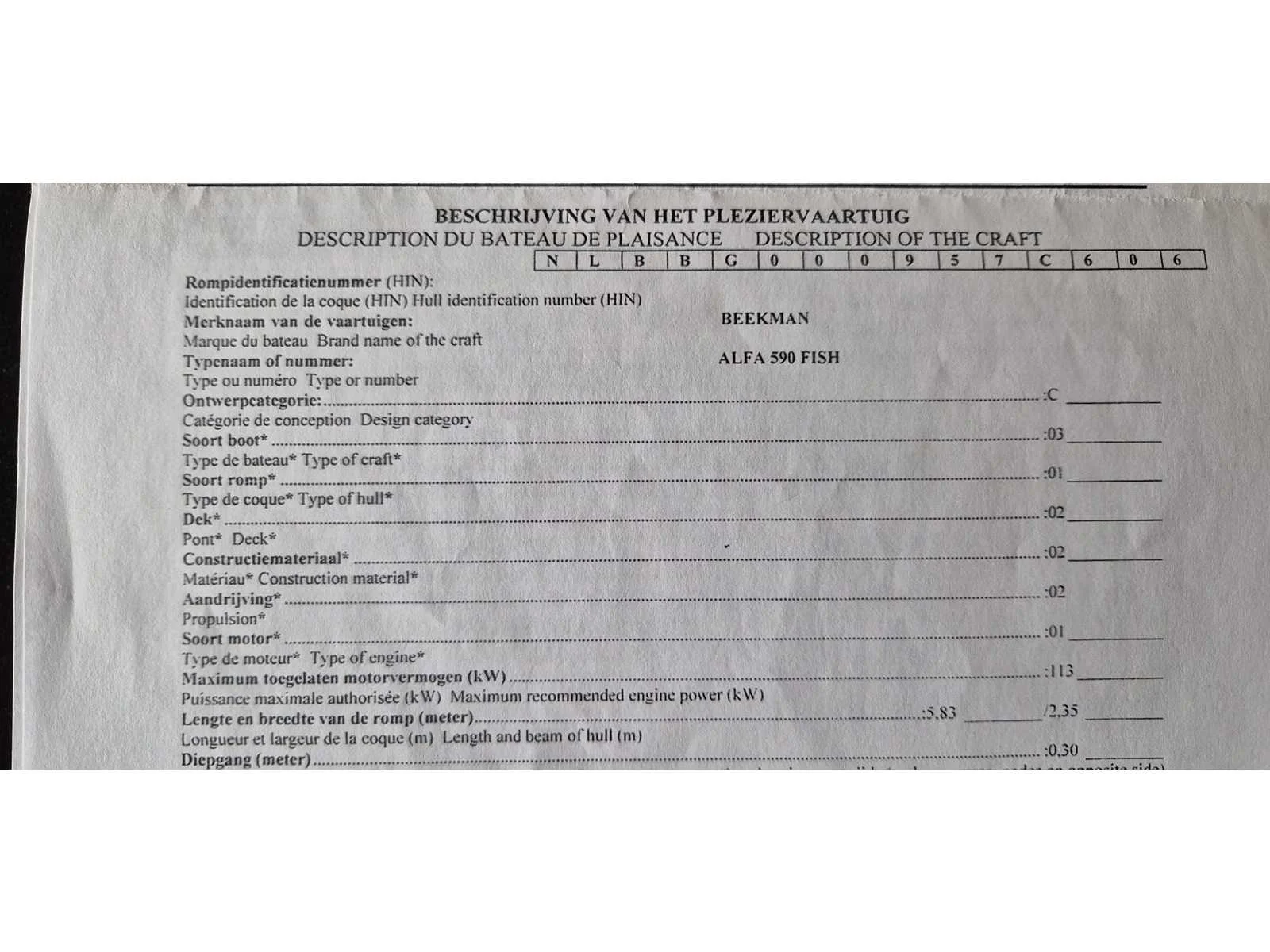 Categorie C, CE papieren aanwezig, kaartplotter Lowrance Glowmap 5000, Lowrance dieptemeter / viszoeker X515, radar, dieptemeter / viszoeker, Raymarine marifoon RAY 54E, kompas, ruitenwisser, elektrische ankerlier, hengelsteunen. Motor is voorzien van elektrisch schakelen en gas geven. De trailer heeft Belgische papieren en is voorzien van een elektrische lier. Kan geladen / getransporteerd worden binnen de Benelux tegen betaling. Merk: Beekman Type: 590 Fish Rompmateriaal: Polyester Brandstof: Benzine Bouwjaar: 2006 Vermogen: 110kW Trailer merk + type: Pega ZB1800 Lengte over alles: 5.9m Navigatieverlichting: true Navigatie apparatuur: true Marifoon (vhf): true Breedte formaat: 2.45m Afgelezen urenstand: 260hr