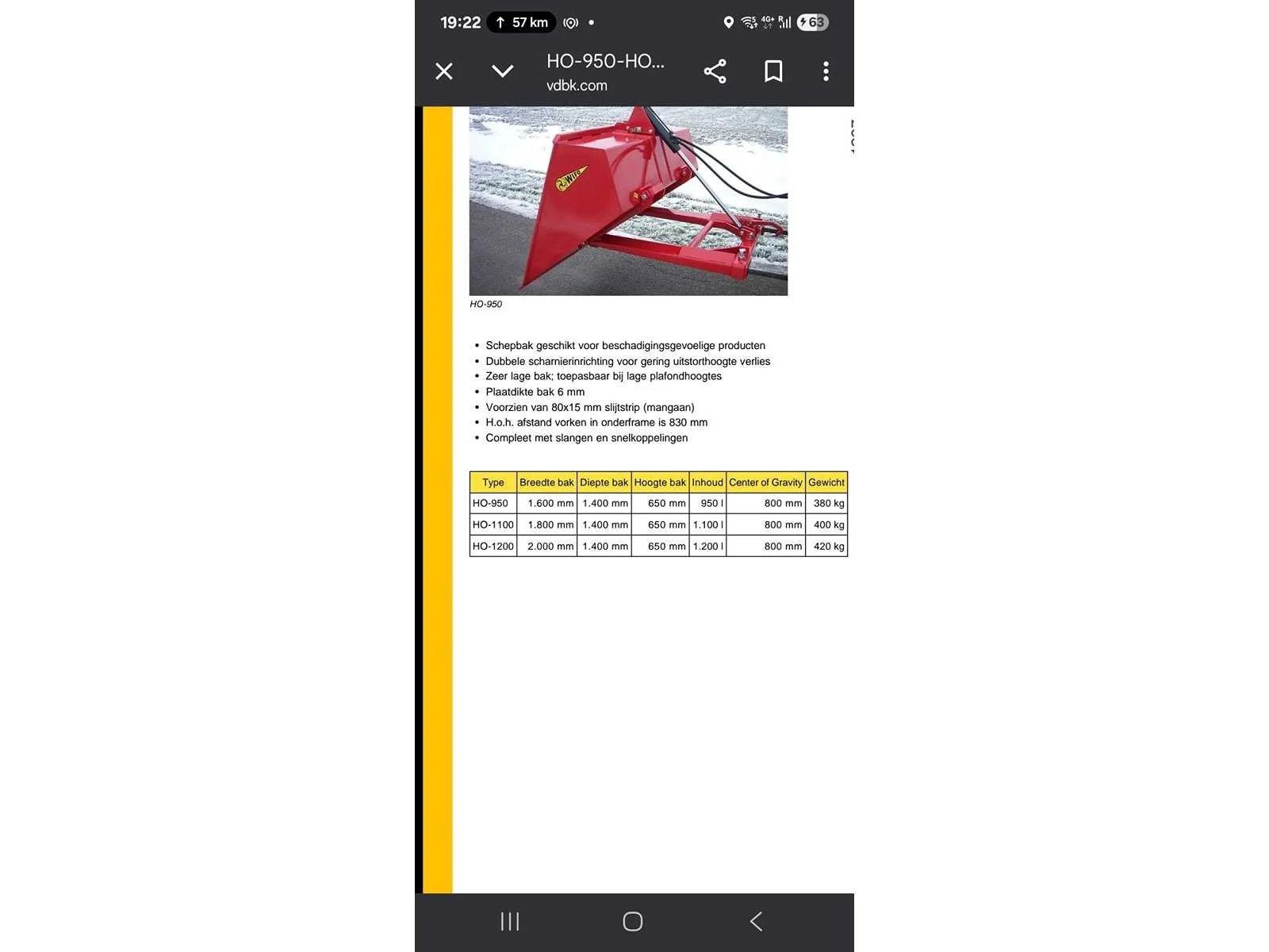 Hydraulisch schepbak. Breedte 1600 mm. Diepte 1400 mm. Hoogte 650 mm. Inhoud 950 liter Merk: Wifo Type: HO-950 Eigen gewicht: 380kg