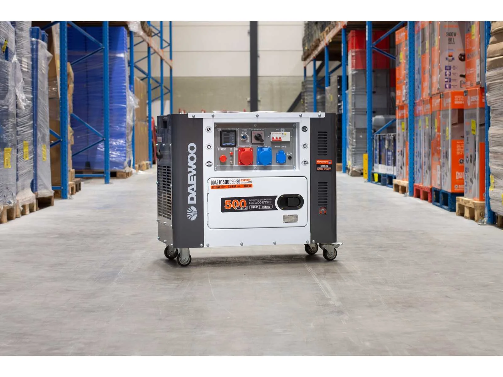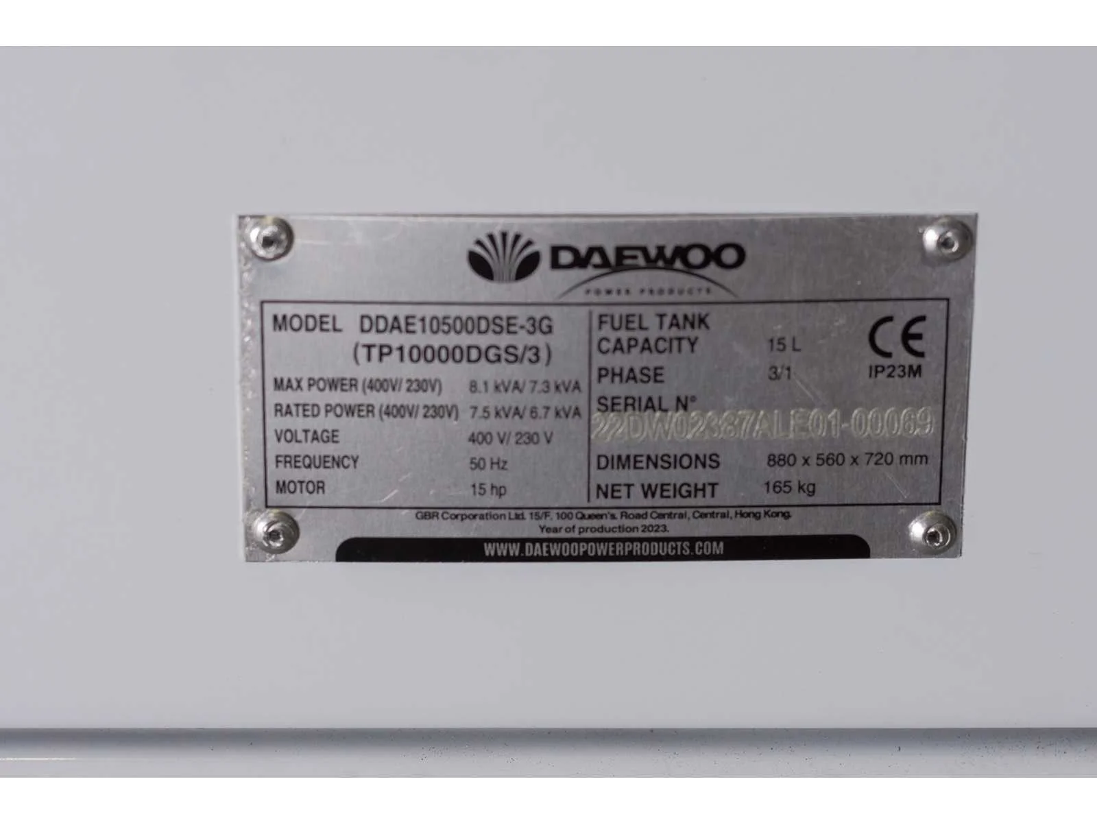 Max power; 8.1 KVA(400V); 7.3 KVA(7.3V); rated power; 7.5 KVA(400V); 6.7 KVA(230V); fuel tank capacity; 15L; 498cc; 15hp; battery; 36 AH; power factor; 1.25; sockets; 1x16 A; 1x32 A; ongebruikt; 3869 Merk: Daewoo Type: DDAE10500DSE-3G Capaciteit.: 8.1kVA Diesel: true Luchtgekoeld: true Mobiel: true Afgelezen urenstand: 0 Machinegewicht: 165kg Totale afmeting L: 880mm Totale afmeting Breedte: 560mm Totale afmeting Hoogte: 720mm