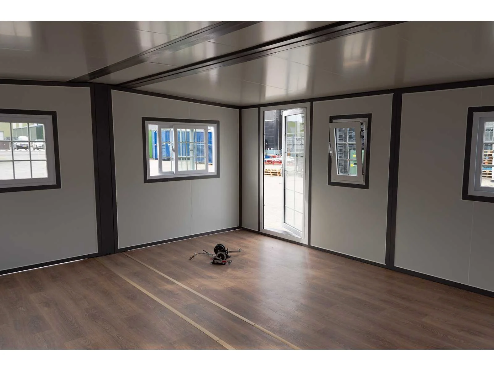 Ca. 28m2 - 69m3; uitklapbaar; afsluitbare deur; 7 schuiframen; 1 kiep raam; stelbare poten; heftruck lepelsleuven; hijs oog; 2 handlieren voor de vloer te laten zakken; opstapje; vinyl vloer; ingeklapte transport afmeting 5890x720x2550mm; zonder sanitair; 6141 Aantal ramen: 8 Totale afmeting L: 4800mm Totale afmeting Breedte: 5850mm Totale afmeting Hoogte: 2490mm