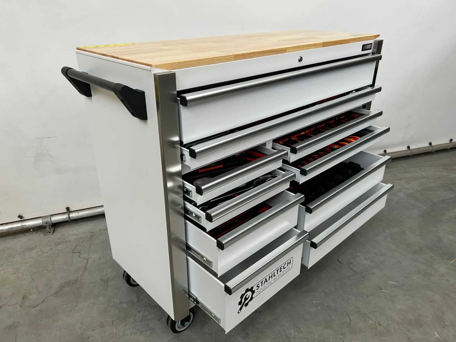 Ongebruikt; gereedschap in plastic verpakt; 12-delig tangenset; 13-delig hamerset; 14-delig meetset; 36-delig slagmoersleutel set; 21-delig sleutels met T-greep; 41-delig schroevendraaierset; 29-delig combinatiesleutels; 12-delig ringsleutels; 125-delig doppenset; 84-delig bitjes set; 7483 Merk: Stahltech Type: 387-delig Lengte: 148cm Breedte: 52cm Hoogte: 110cm
