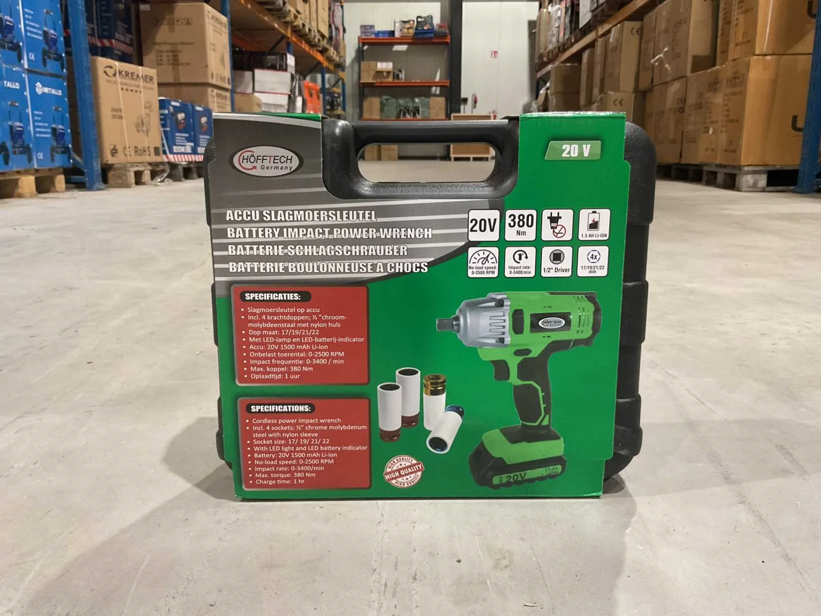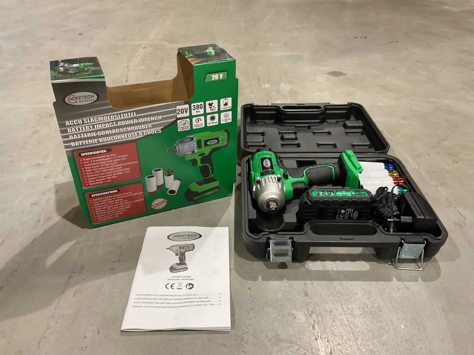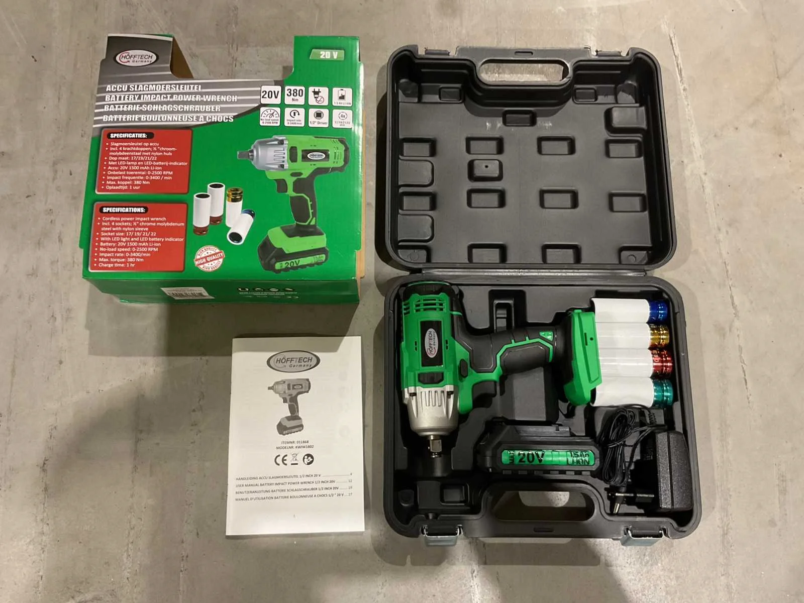 Accu slagmoersleutel voorzien van; 20V accu; 380NM koppel; incl 4 krachtdoppen met nylon huls 17/19/21/22; led lamp en led batterij indicator; ongebruikt Merk: Hofftech Type: Accu Bouwjaar: 2024 Accuspanning: 20V Accu type: 20V 1500mAH Li-ion Aantal accu's: 1 Gewicht: 1 Accu lader: true
