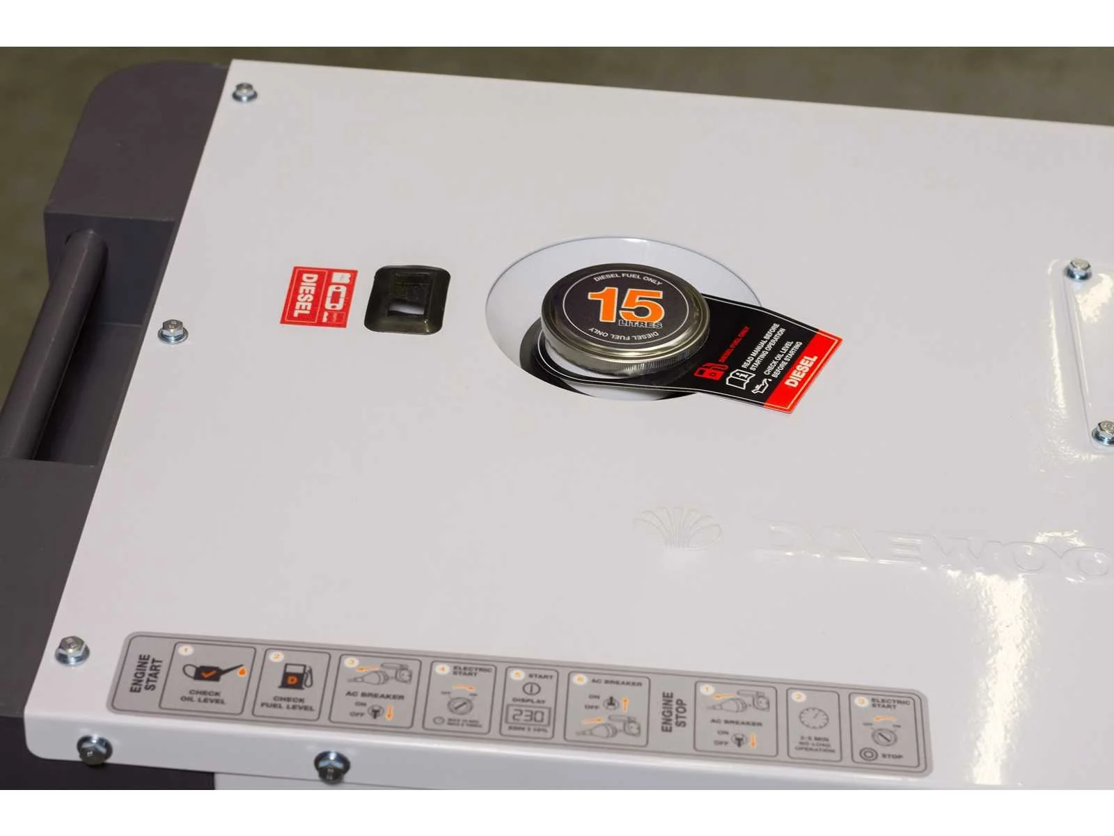 Max power; 8.1 KVA(400V); 7.3 KVA(7.3V); rated power; 7.5 KVA(400V); 6.7 KVA(230V); fuel tank capacity; 15L; 498cc; 15hp; battery; 36 AH; power factor; 1.25; sockets; 1x16 A; 1x32 A; ongebruikt; 3869 Merk: Daewoo Type: DDAE10500DSE-3G Capaciteit.: 8.1kVA Diesel: true Luchtgekoeld: true Mobiel: true Afgelezen urenstand: 0 Machinegewicht: 165kg Totale afmeting L: 880mm Totale afmeting Breedte: 560mm Totale afmeting Hoogte: 720mm