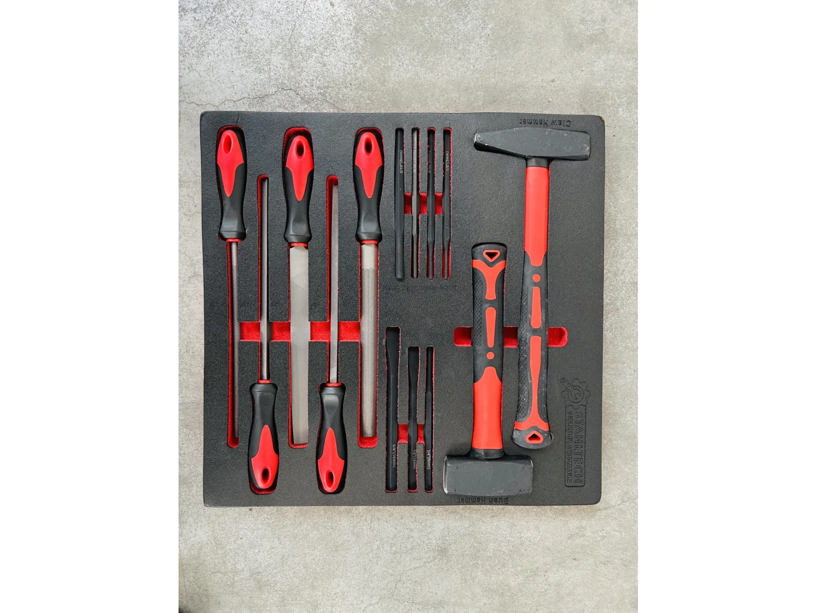 Ongebruikt; gereedschap in plastic verpakt; 12-delig tangenset; 13-delig hamerset; 14-delig meetset; 36-delig slagmoersleutel set; 21-delig sleutels met T-greep; 41-delig schroevendraaierset; 29-delig combinatiesleutels; 12-delig ringsleutels; 125-delig doppenset; 84-delig bitjes set; 7483 Merk: Stahltech Type: 387-delig Lengte: 148cm Breedte: 52cm Hoogte: 110cm