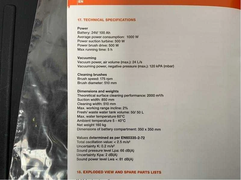 Ongebruikt in doos; met acculader; met handleiding; maximale werktijd 5 uur; 175 rpm borstelsnelheid; 24 liter per seconde zuigkracht; 2000 m2 per uur theoretische oppervlakteprestatie; geschikt voor vloerhelling tot 2 graden; 2 * 50 liter reservoir inhoud; maximale watertemperatuur van 60 graden Celsius; 3769; Merk: Daewoo Type: DAFL50A Bouwjaar: 2024 Werkbreedte: 510mm Kilometerstand bij opname: 0hr Elektrisch: true Aansluiting: 24V Accu lader: true Oplaadbaar: true Eigen gewicht: 160kg Totale afmeting L: 1250mm Totale afmeting Breedte: 880mm Totale afmeting Hoogte: 1050mm